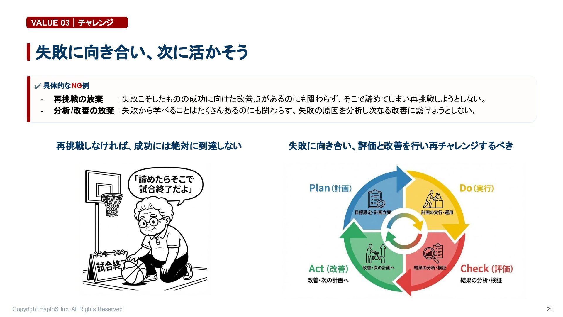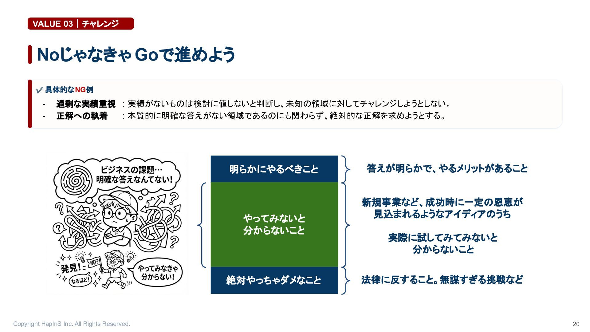 Noじゃなきゃ Goで進めよう 20 Copyright HapInS Inc. All Rights Reserved. VALUE 03|チャレンジ 絶対やっちゃダメなこと 明らかにやるべきこと やってみないと 分からないこと 法律に反すること。無謀すぎる挑戦など 新規事業など、成功時に一定の恩恵が 見込まれるようなアイディアのうち 実際に試してみてみないと 分からないこと 答えが明らかで、やるメリットがあること