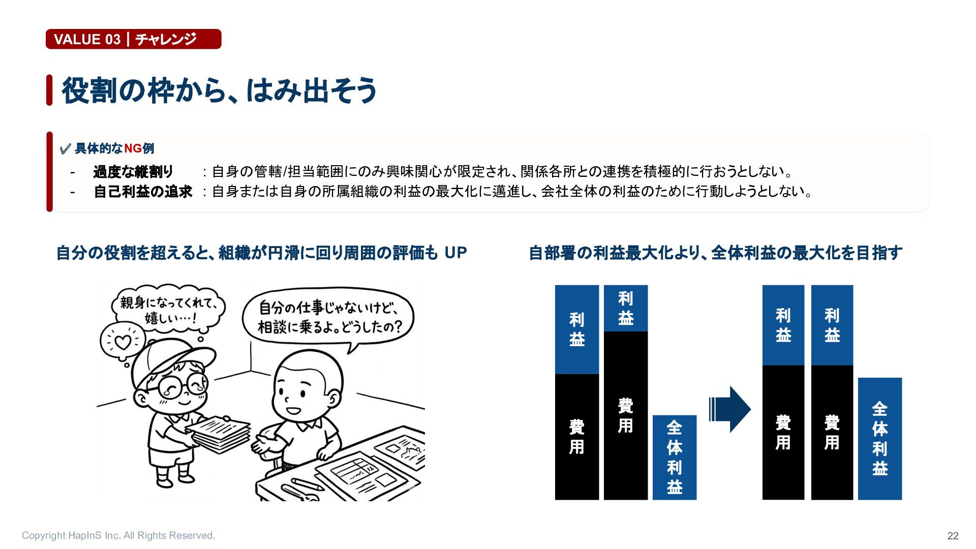 役割の枠から、はみ出そう 22 Copyright HapInS Inc. All Rights Reserved. VALUE 03|チャレンジ 自分の役割を超えると、組織が円滑に回り周囲の評価も UP 費 用 利 益 費 用 利 益 全 体 利 益 費 用 利 益 費 用 利 益 全 体 利 益 自部署の利益最大化より、全体利益の最大化を目指す