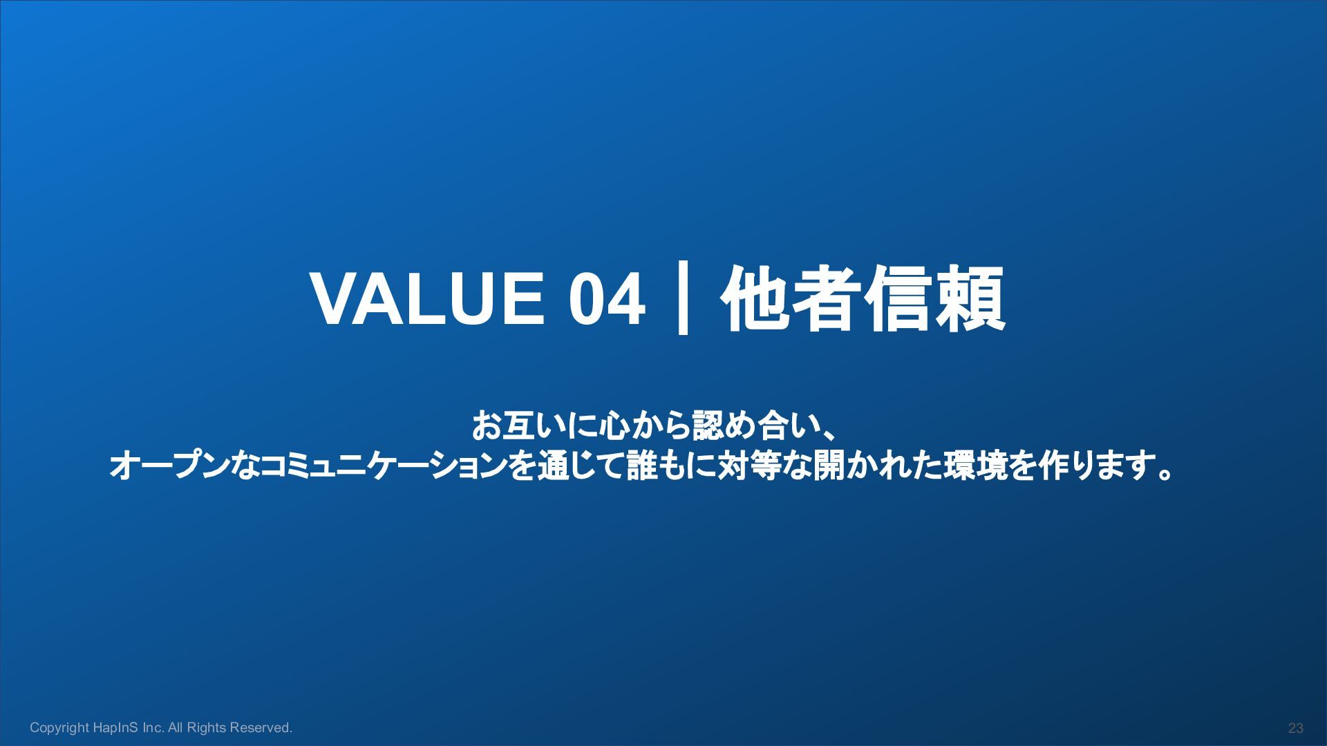 Copyright HapInS Inc. All Rights Reserved. お互いに心から認め合い、 オープンなコミュニケーションを通じて誰もに対等な開かれた環境を作ります。 VALUE 04|他者信頼