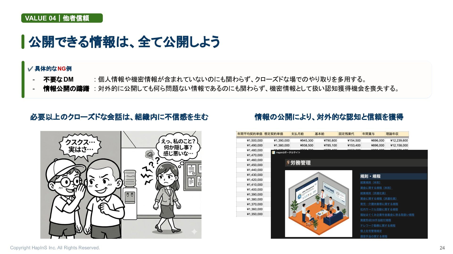 公開できる情報は、全て公開しよう 24 Copyright HapInS Inc. All Rights Reserved. VALUE 04|他者信頼 必要以上のクローズドな会話は、組織内に不信感を生む 情報の公開により、対外的な認知と信頼を獲得