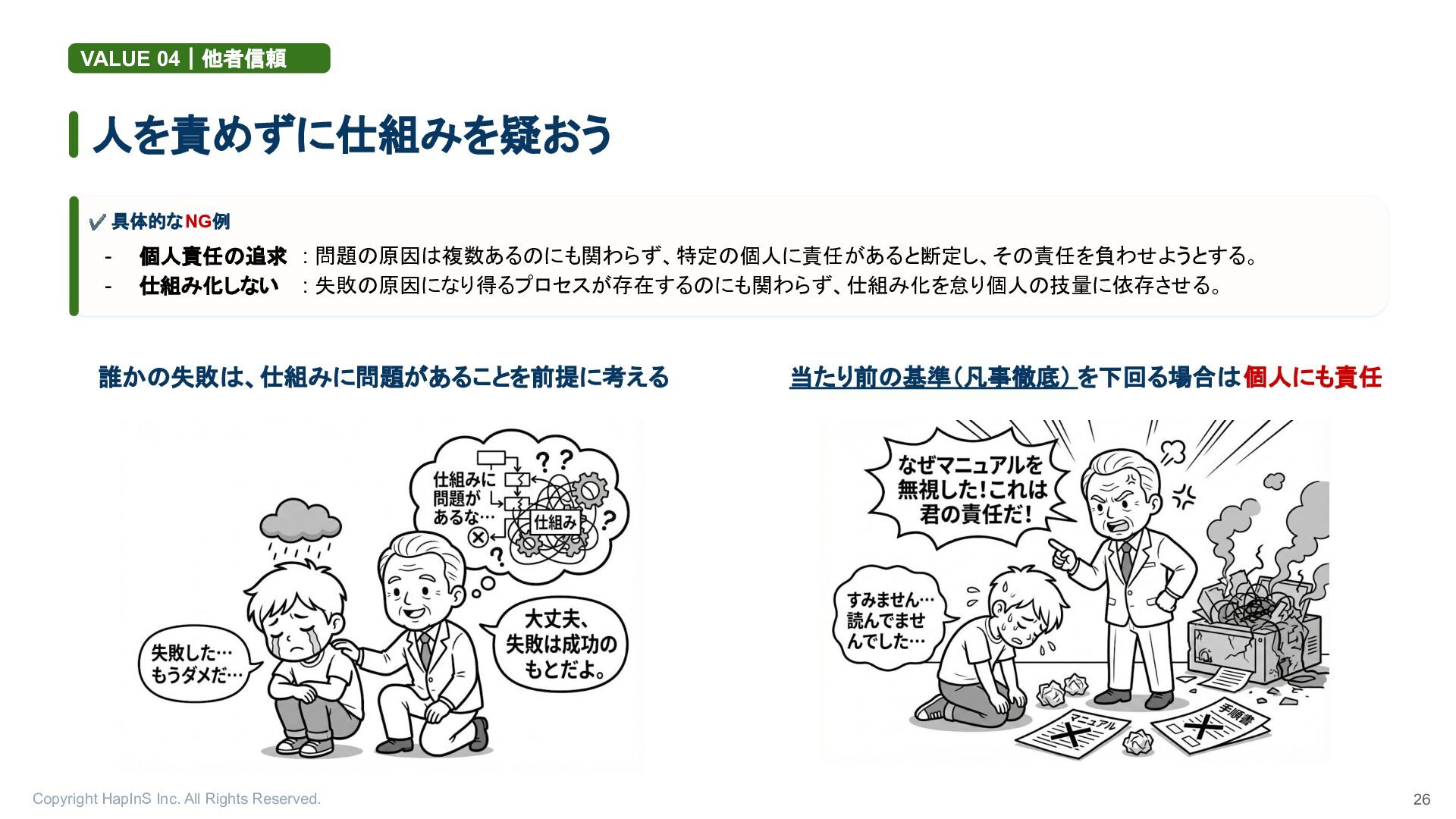 : 指摘や批判をくれた相手に対する感謝の気持ちを持たず、敵と認定し人間関係を悪化させる行動を取る。 指摘や批判は成果のためと受け入れよう 25 Copyright HapInS Inc. All Rights Reserved. VALUE 04|他者信頼 指摘や批判はより良い成果を挙げるための 前向きなもの 指摘や批判の対象が個人そのものになるのは NG