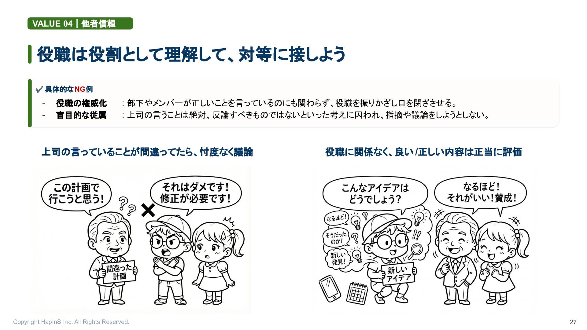 役職は役割として理解して、対等に接しよう 27 Copyright HapInS Inc. All Rights Reserved. VALUE 04|他者信頼 役職に関係なく、良い /正しい内容は正当に評価 上司の言っていることが間違ってたら、忖度なく議論