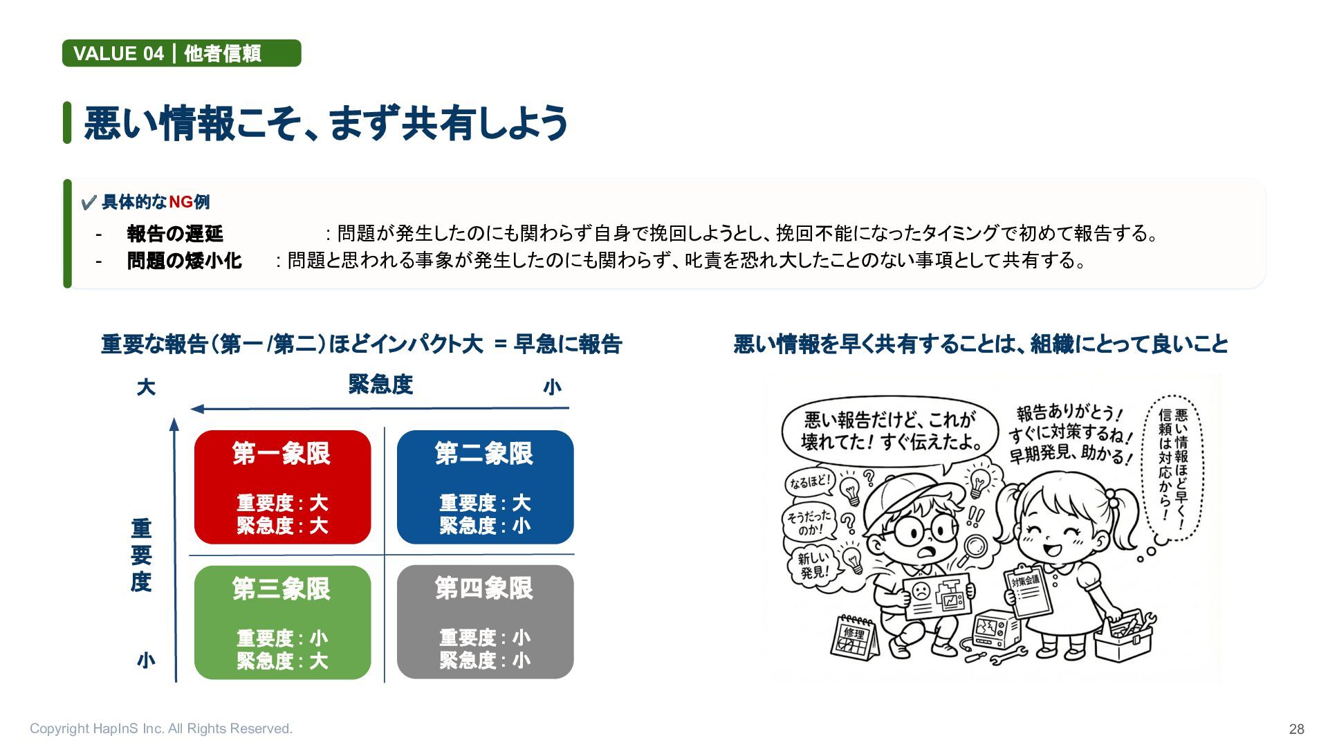 悪い情報こそ、まず共有しよう 28 Copyright HapInS Inc. All Rights Reserved. VALUE 04|他者信頼 悪い情報を早く共有することは、組織にとって良いこと 第一象限 重要度: 大 緊急度: 大 第三象限 重要度: 小 緊急度: 大 第二象限 重要度: 大 緊急度: 小 第四象限 重要度: 小 緊急度: 小 緊急度 重 要 度 小 小 大 重要な報告(第一/第二)ほどインパクト大 = 早急に報告