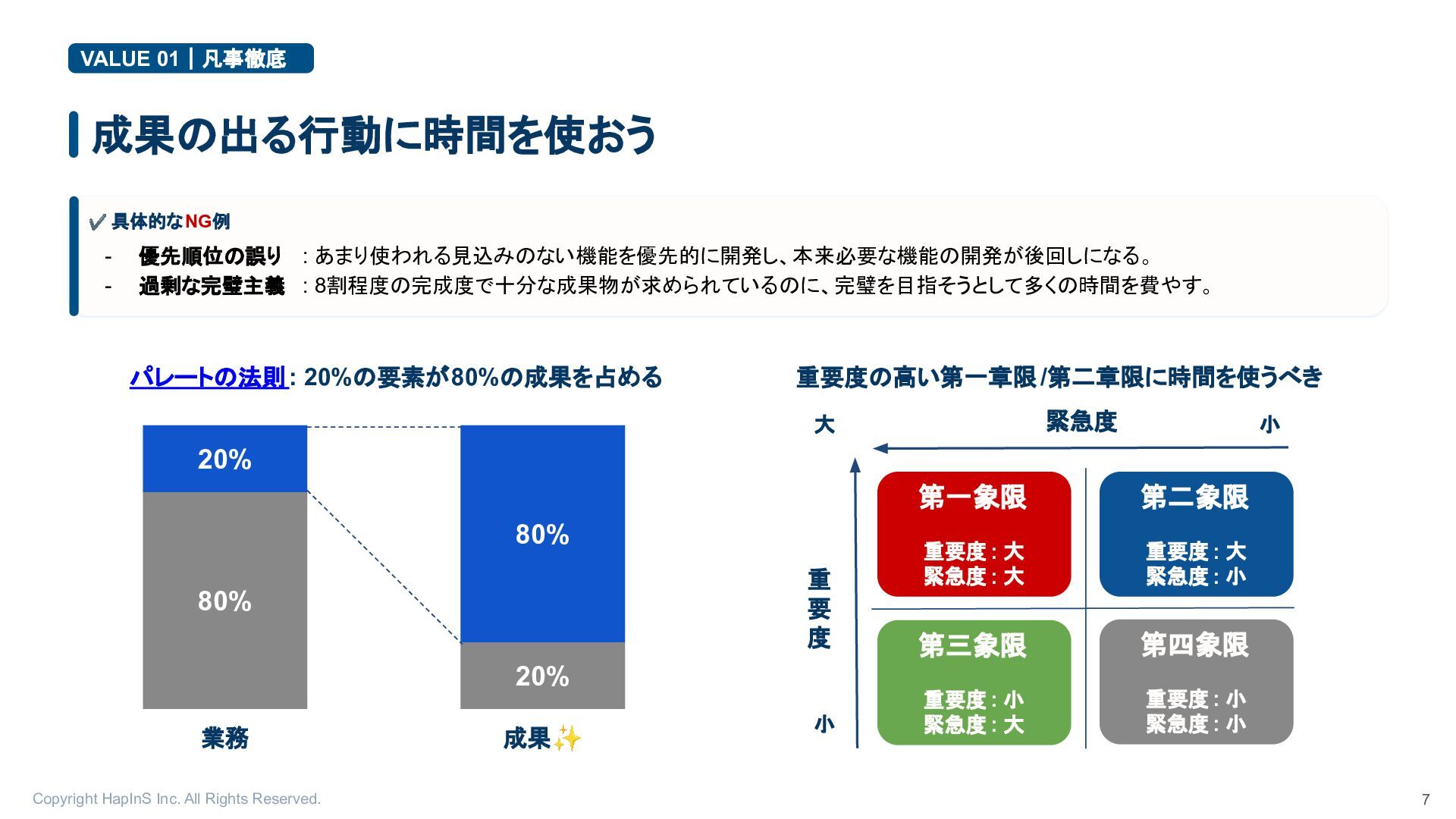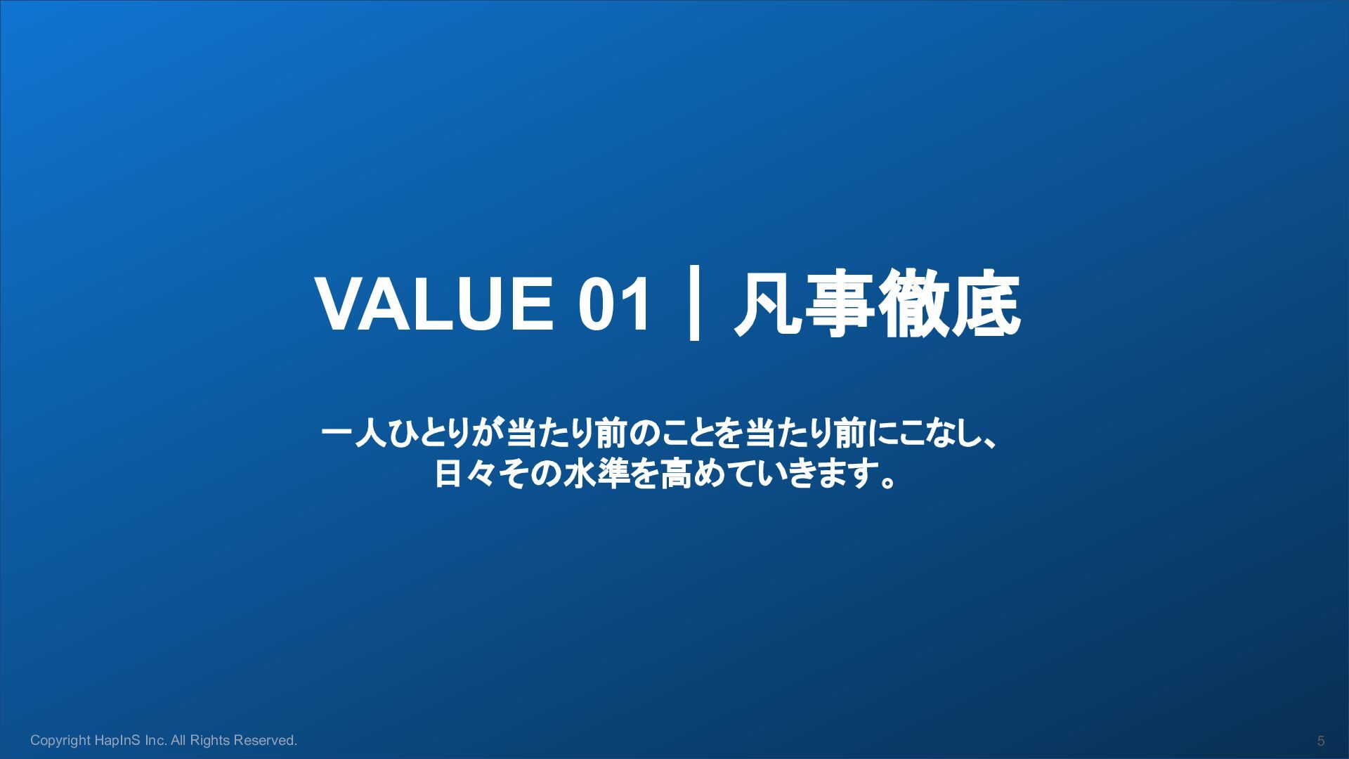 Copyright HapInS Inc. All Rights Reserved. 一人ひとりが当たり前のことを当たり前にこなし、 日々その水準を高めていきます。 VALUE 01|凡事徹底