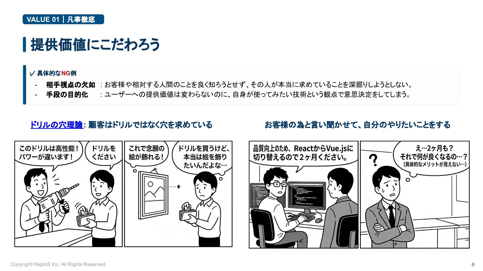 提供価値にこだわろう 6 Copyright HapInS Inc. All Rights Reserved. VALUE 01|凡事徹底 ドリルの穴理論: 顧客はドリルではなく穴を求めている お客様の為と言い聞かせて、自分のやりたいことをする