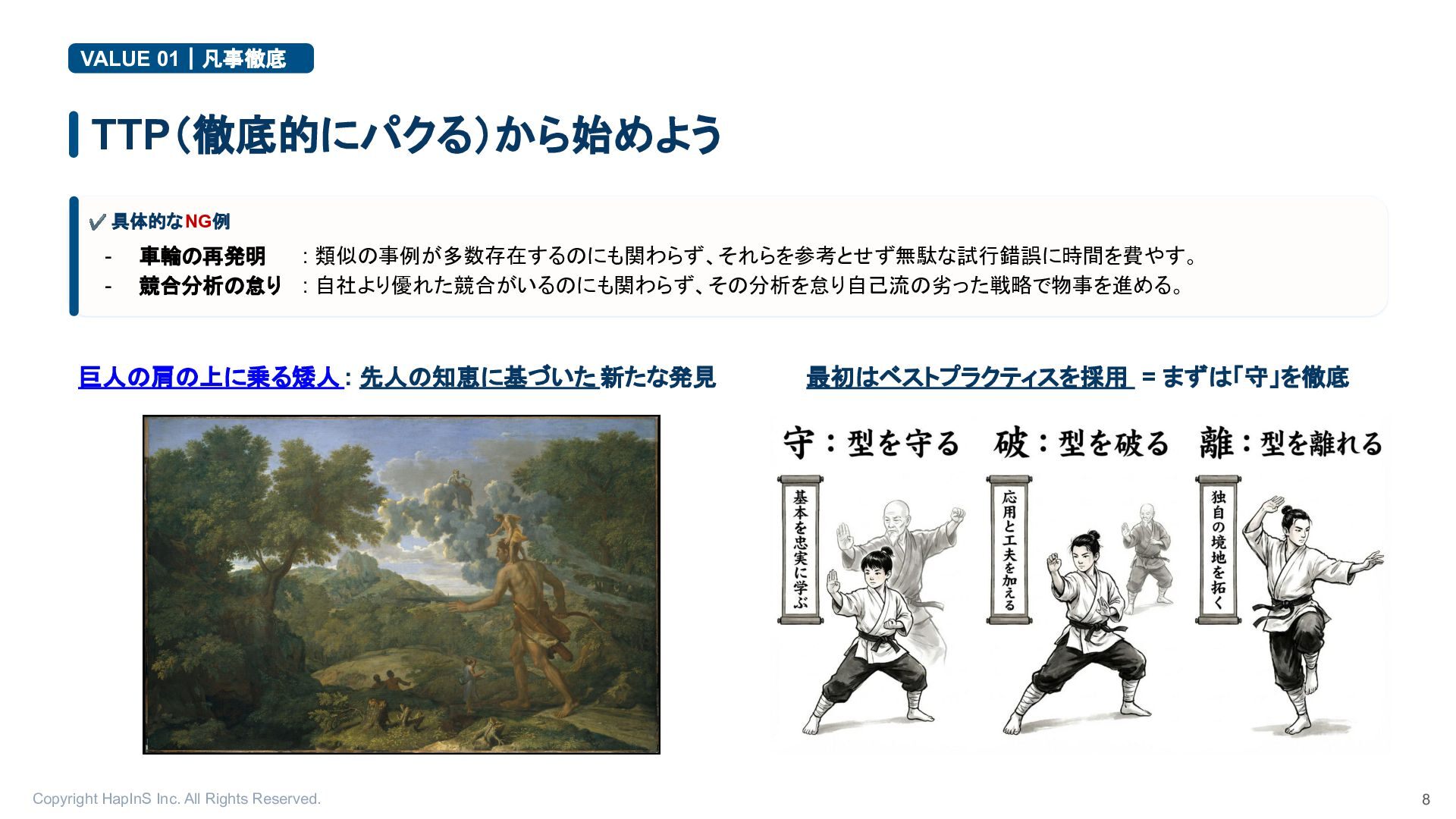 TTP(徹底的にパクる)から始めよう 8 Copyright HapInS Inc. All Rights Reserved. VALUE 01|凡事徹底 巨人の肩の上に乗る矮人 : 先人の知恵に基づいた 新たな発見 最初はベストプラクティスを採用 = まずは「守」を徹底