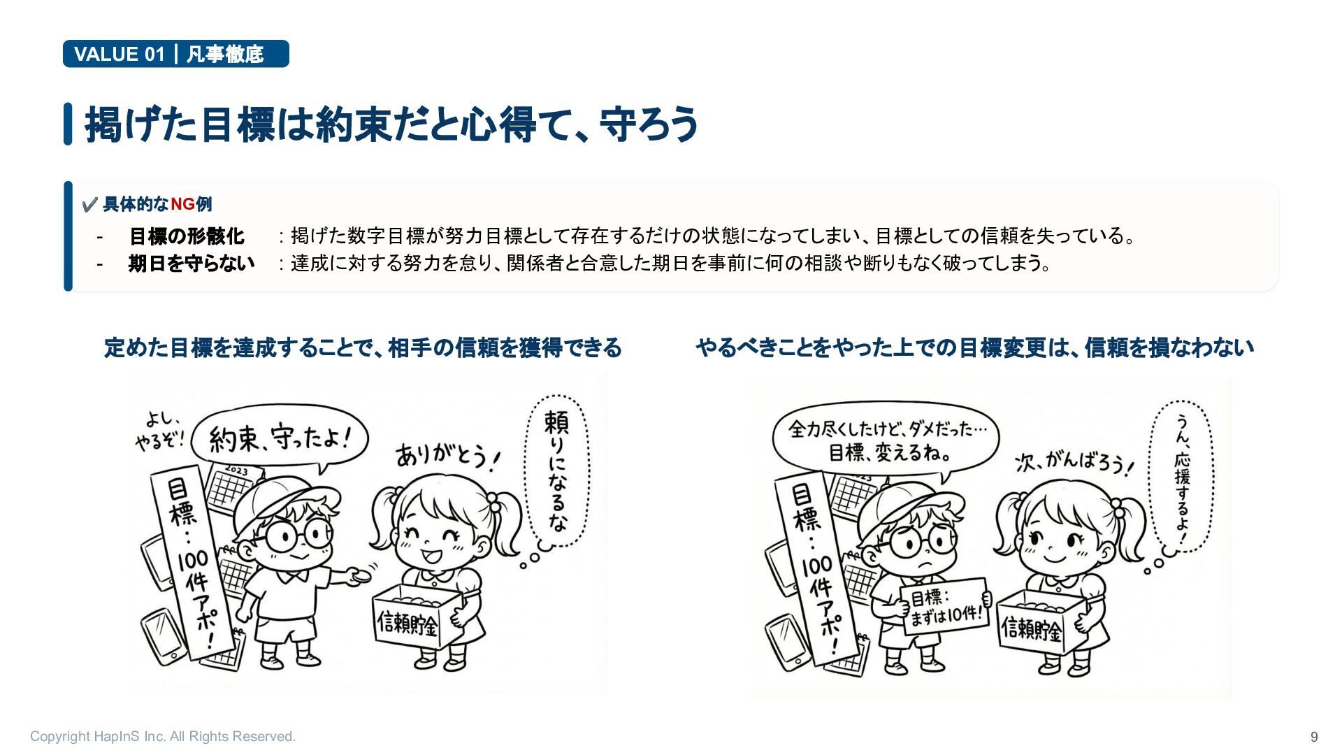 掲げた目標は約束だと心得て、守ろう 9 Copyright HapInS Inc. All Rights Reserved. VALUE 01|凡事徹底 定めた目標を達成することで、相手の信頼を獲得できる やるべきことをやった上での目標変更は、信頼を損なわない