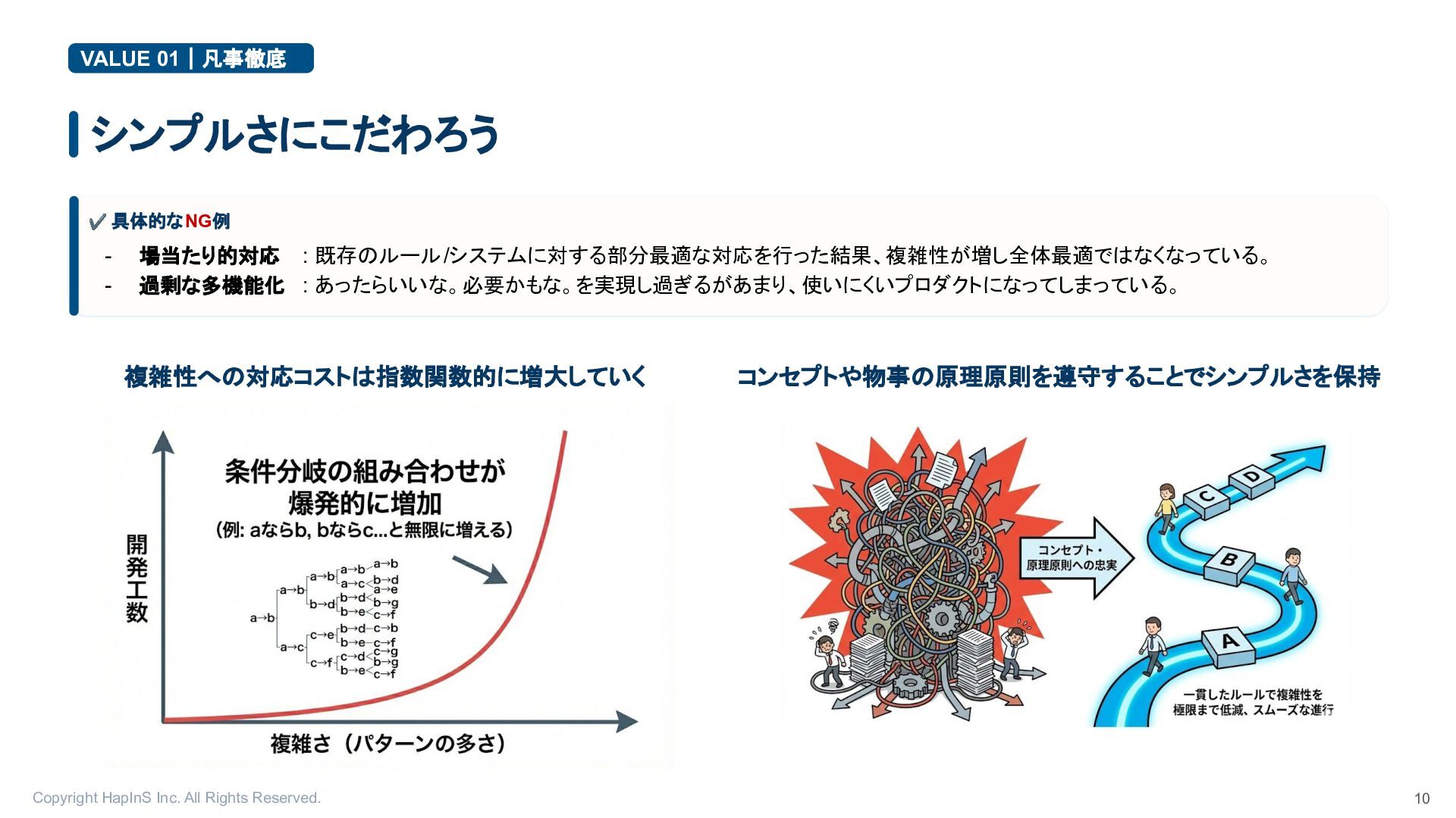 シンプルさにこだわろう 10 Copyright HapInS Inc. All Rights Reserved. VALUE 01|凡事徹底 複雑性への対応コストは指数関数的に増大していく コンセプトや物事の原理原則を遵守することでシンプルさを保持