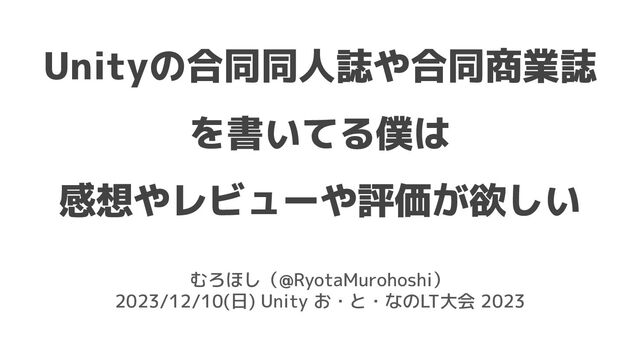 Unityの合同同人誌や合同商業誌 を書いてる僕は 感想やレビューや評価が欲しい むろほし(@RyotaMurohoshi) 2023/12/10(日) Unity お・と・なのLT大会 2023