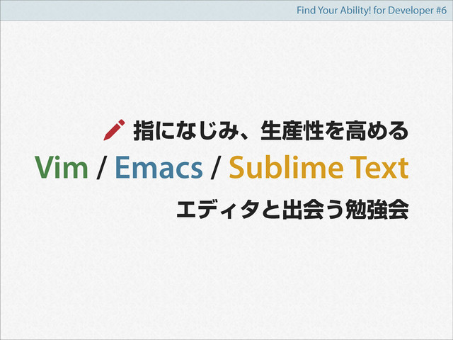 Developer #6 ✎ ࢦʹͳ͡Έɺੜ࢈ੑΛߴΊΔ ΤσΟλͱग़ձ͏ษڧձ Vim / Emacs / Sublime Text Vim / Emacs / Sublime Text ࢦʹͳ͡Έɺੜ࢈ੑΛߴΊΔ ΤσΟλͱग़ձ͏ษڧձ ✎