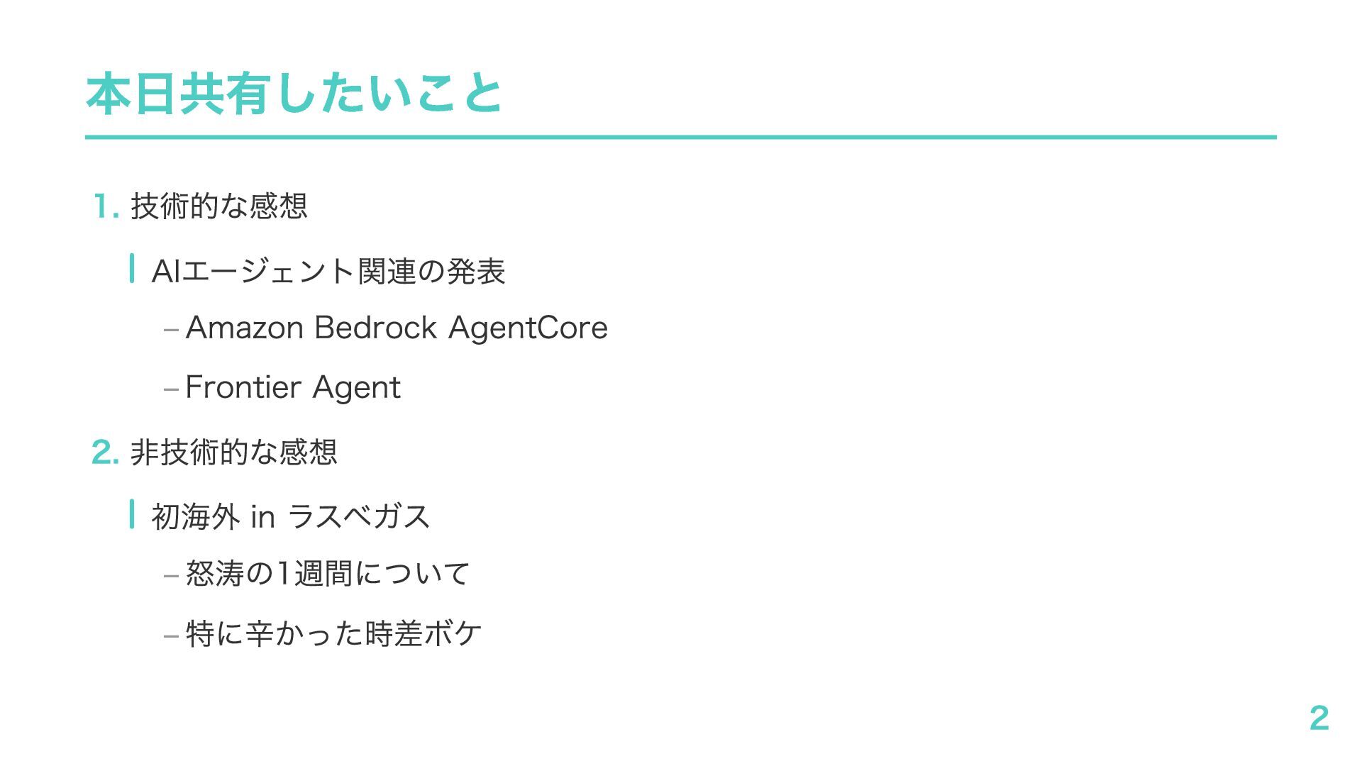 1. 本日共有したいこと 1. 技術的な感想 2. 非技術的な感想 AIエージェント関連の発表 Amazon Bedrock AgentCore –