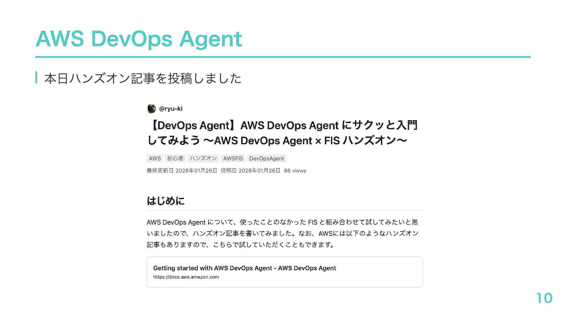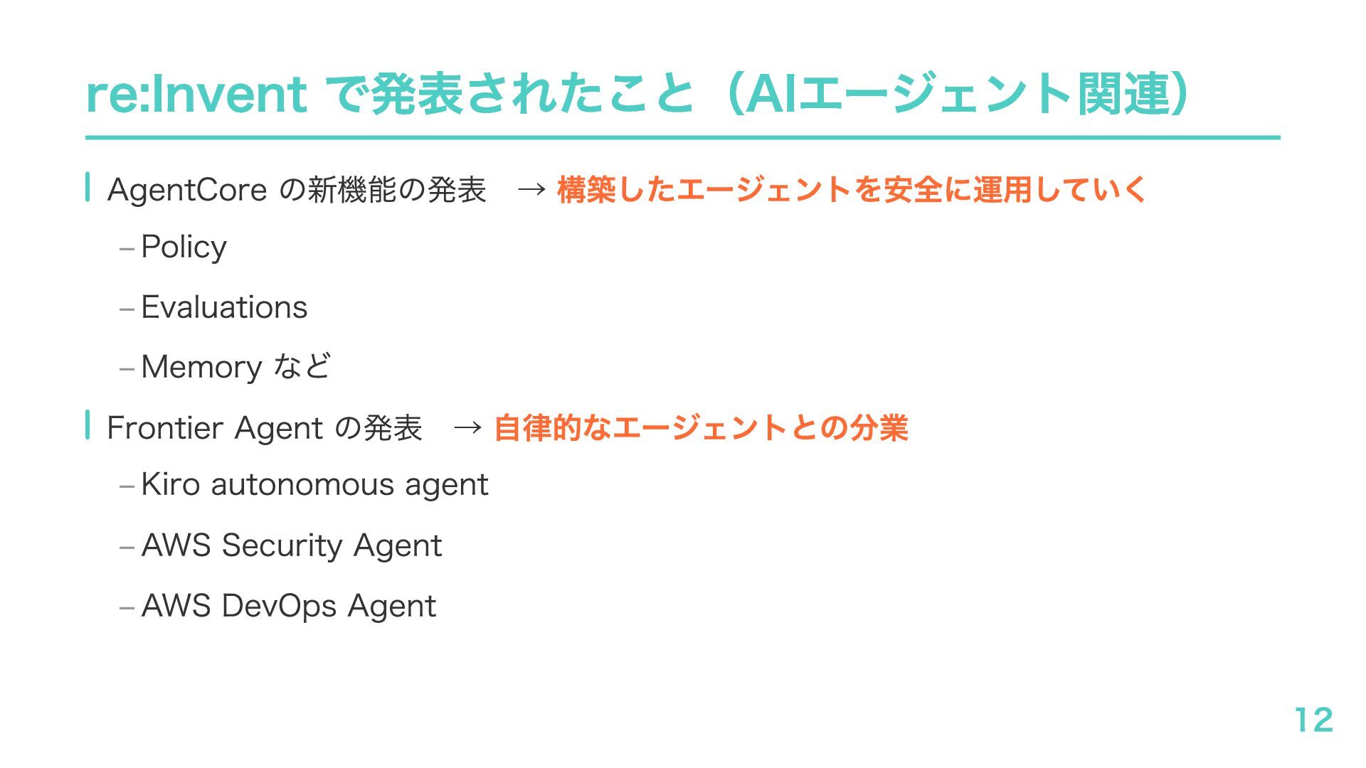 など – Frontier Agent の発表 → 自律的なエージェントとの分業 Kiro autonomous agent – AWS Security Agent – AWS DevOps Agent – 12