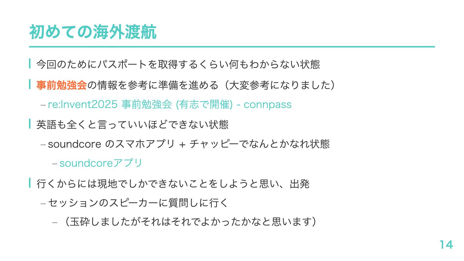 4. 初めての海外渡航 今回のためにパスポートを取得するくらい何もわからない状態 事前勉強会の情報を参考に準備を進める(大変参考になりました) re:Invent2025 事前勉強会 (有志で開催) - connpass – 英語も全くと言っていいほどできない状態