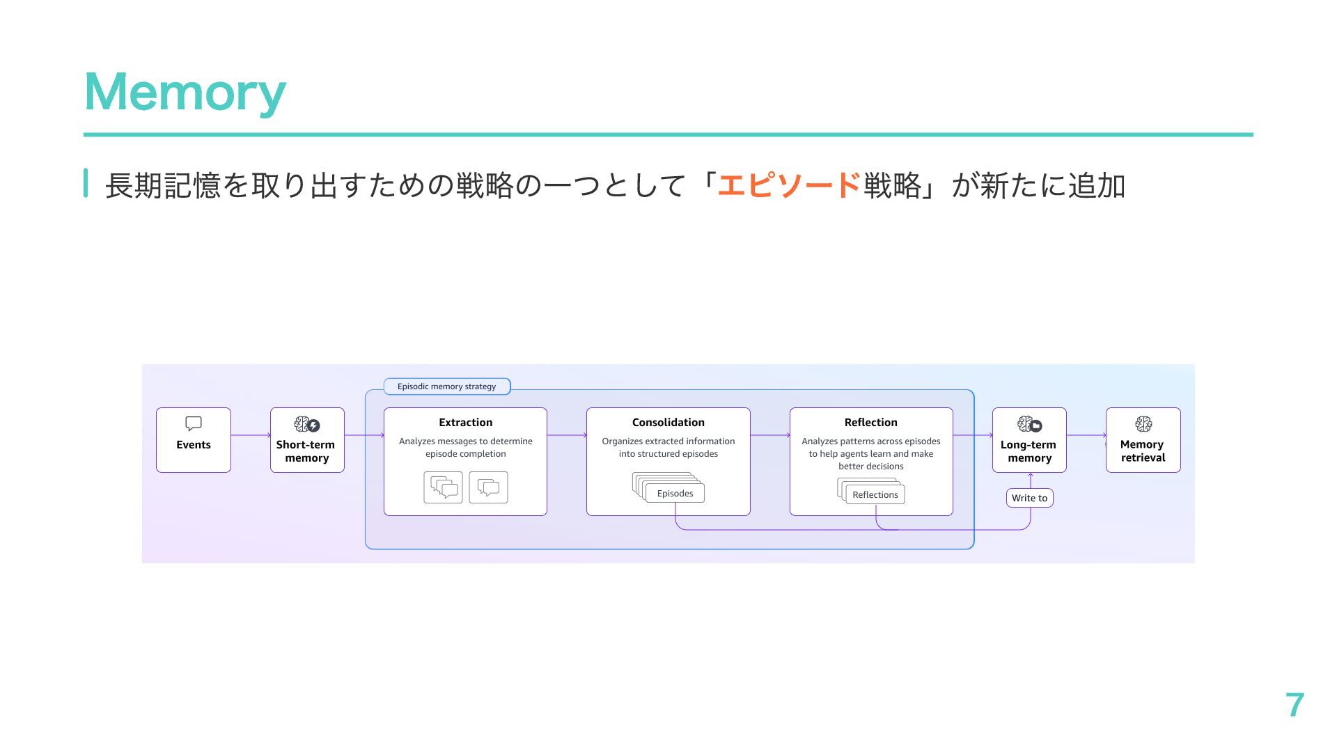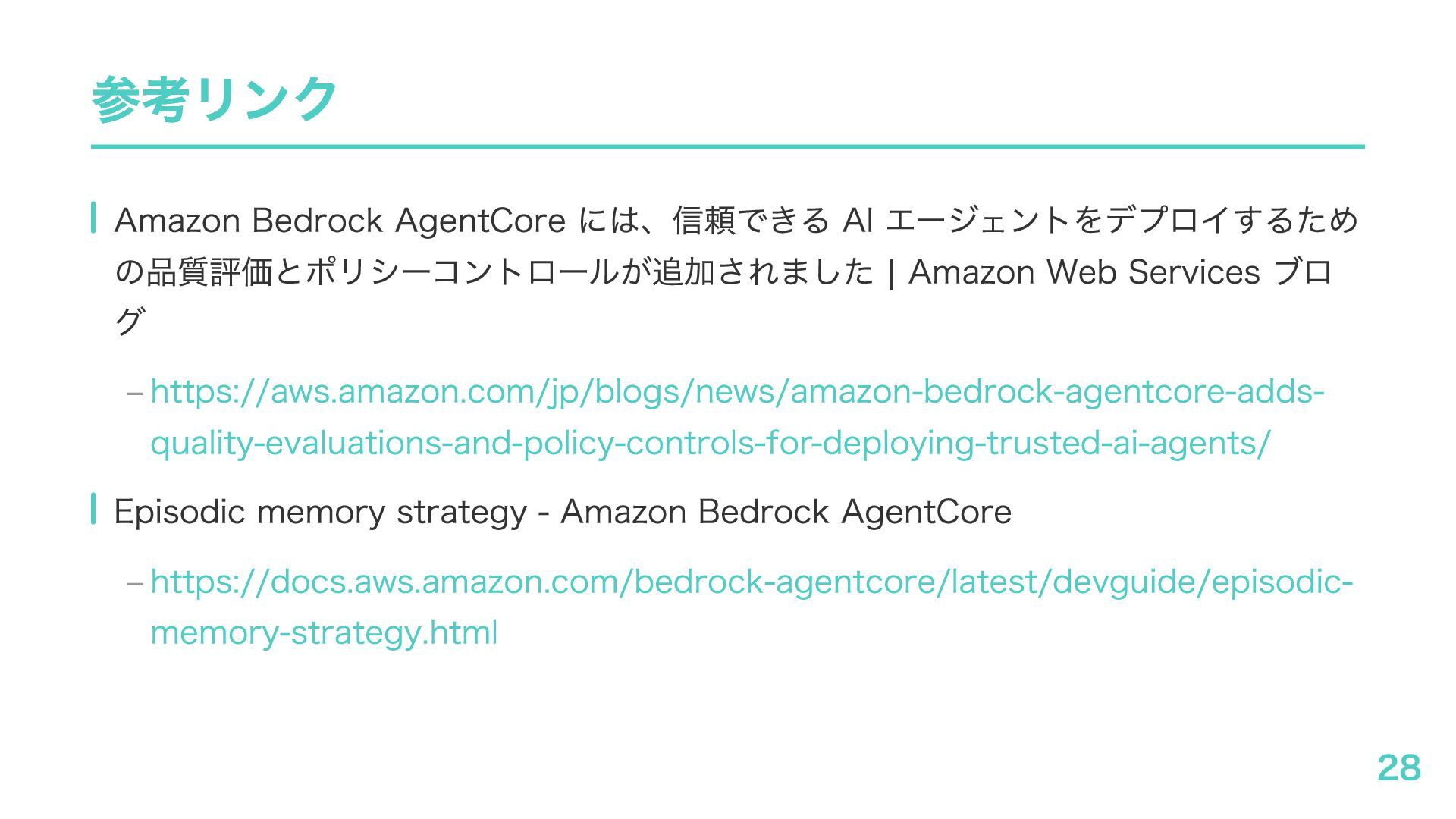 Web Services ブロ グ https://aws.amazon.com/jp/blogs/news/amazon-bedrock-agentcore-adds- quality-evaluations-and-policy-controls-for-deploying-trusted-ai-agents/ – Episodic memory strategy - Amazon Bedrock AgentCore https://docs.aws.amazon.com/bedrock-agentcore/latest/devguide/episodic- memory-strategy.html – 28