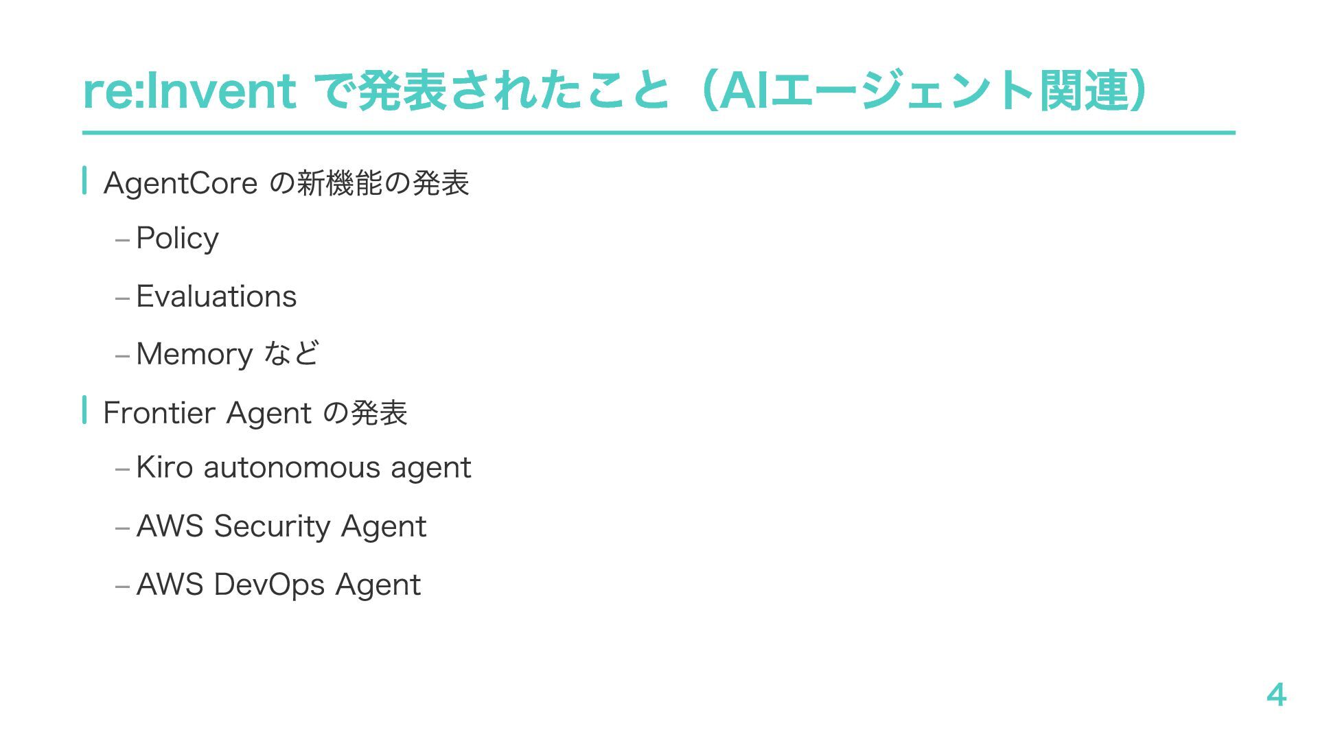 – Frontier Agent の発表 Kiro autonomous agent – AWS Security Agent – AWS DevOps Agent – 4