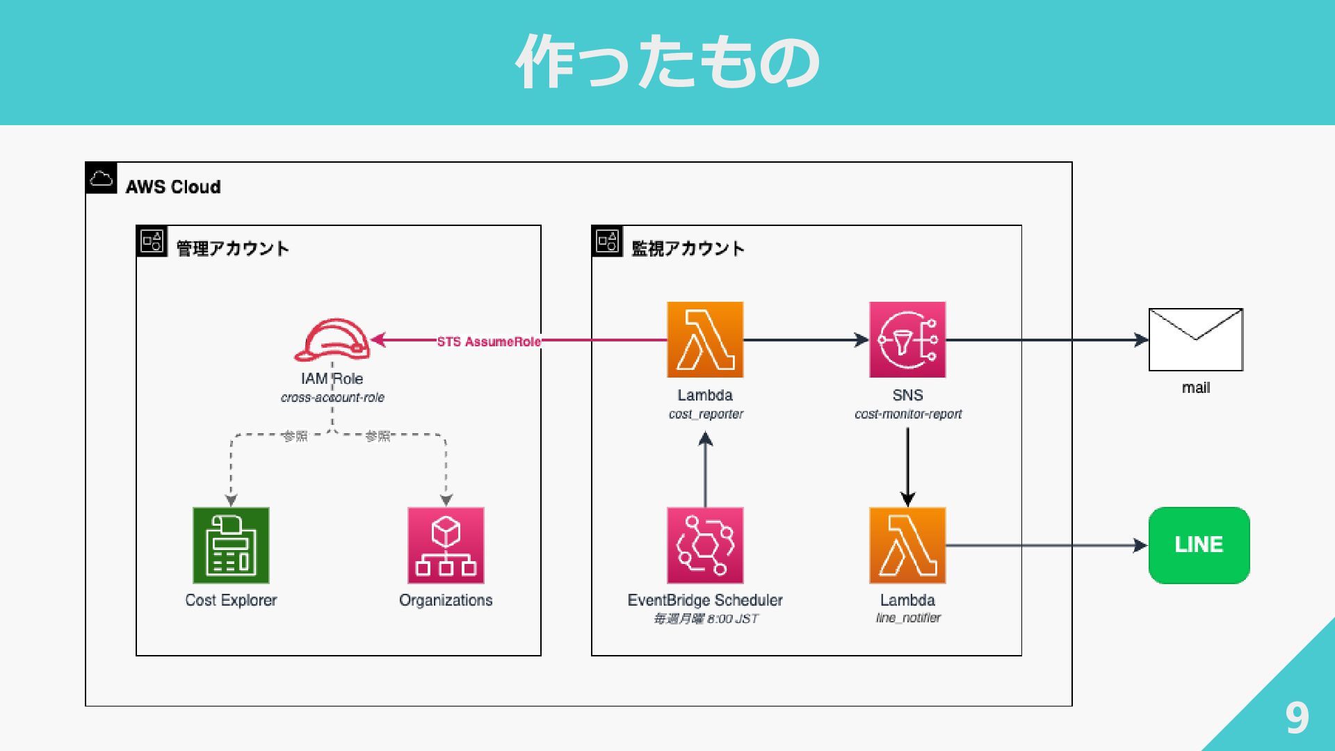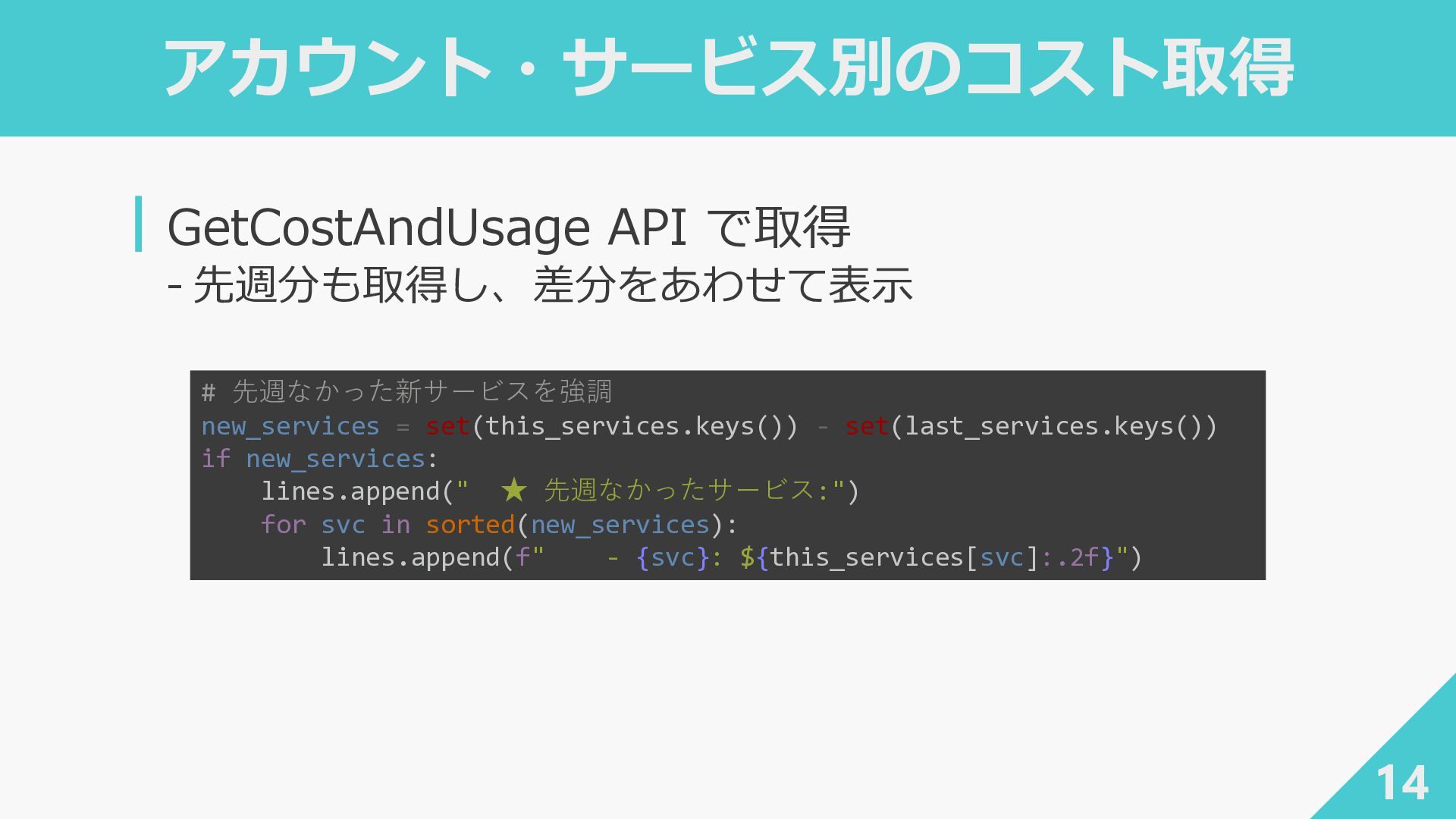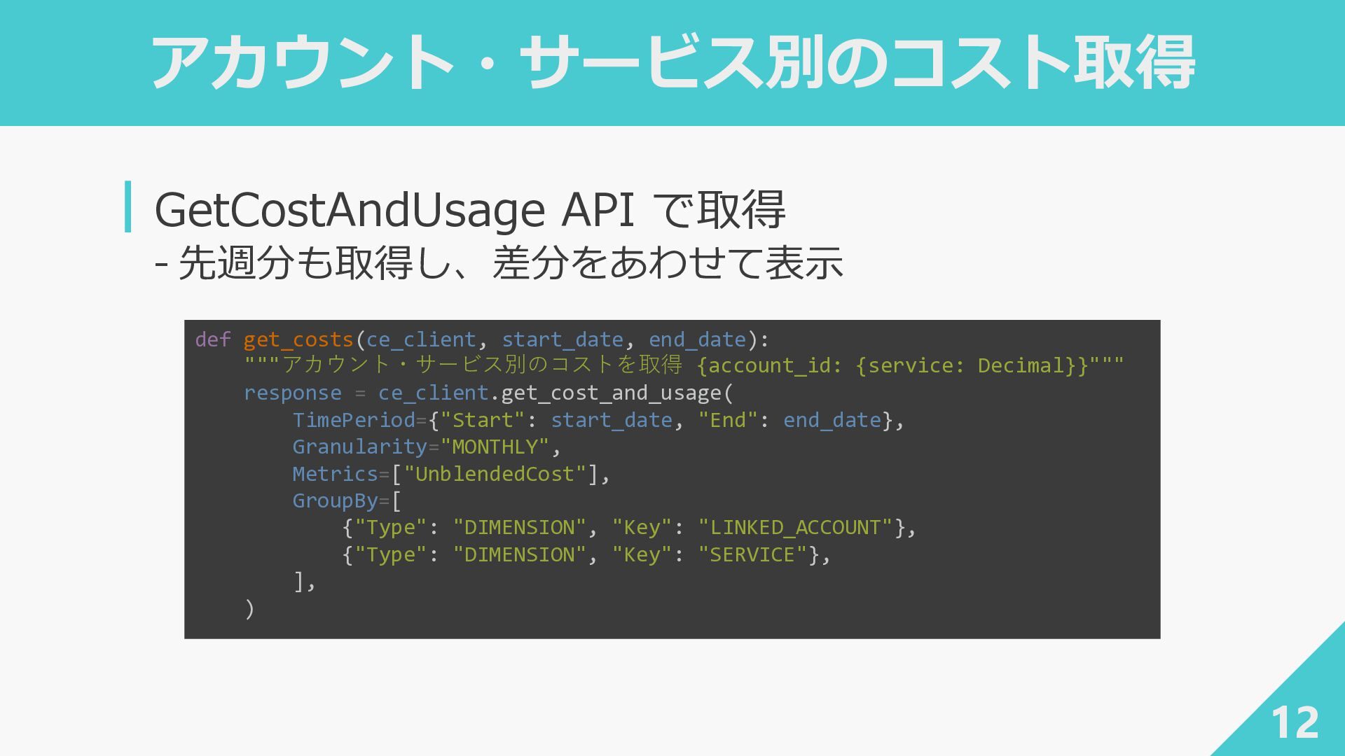 end_date): """アカウント・サービス別のコストを取得 {account_id: {service: Decimal}}""" response = ce_client.get_cost_and_usage( TimePeriod={"Start": start_date, "End": end_date}, Granularity="MONTHLY", Metrics=["UnblendedCost"], GroupBy=[ {"Type": "DIMENSION", "Key": "LINKED_ACCOUNT"}, {"Type": "DIMENSION", "Key": "SERVICE"}, ], )