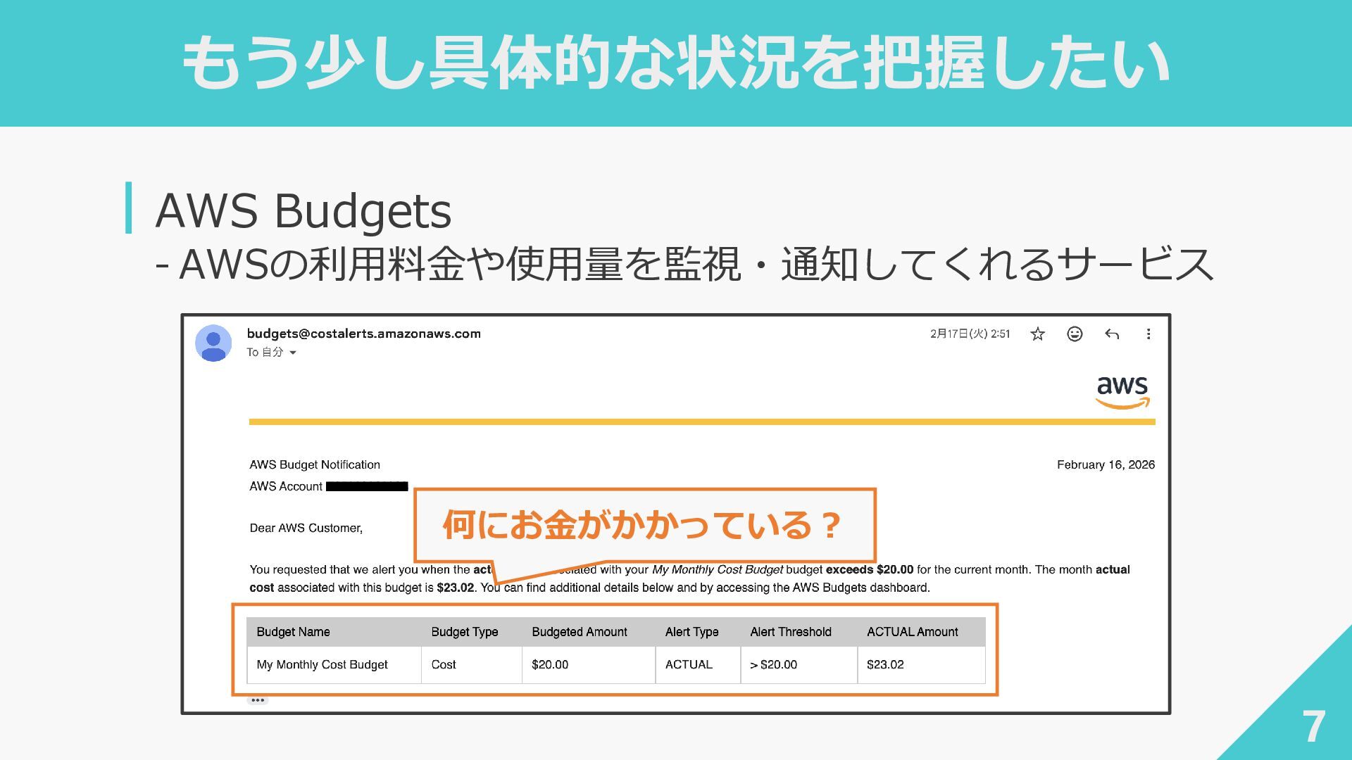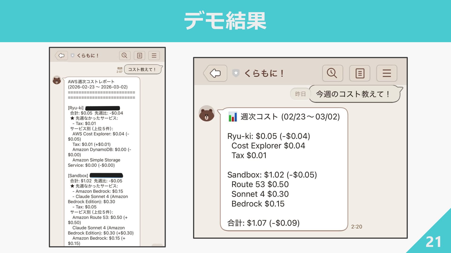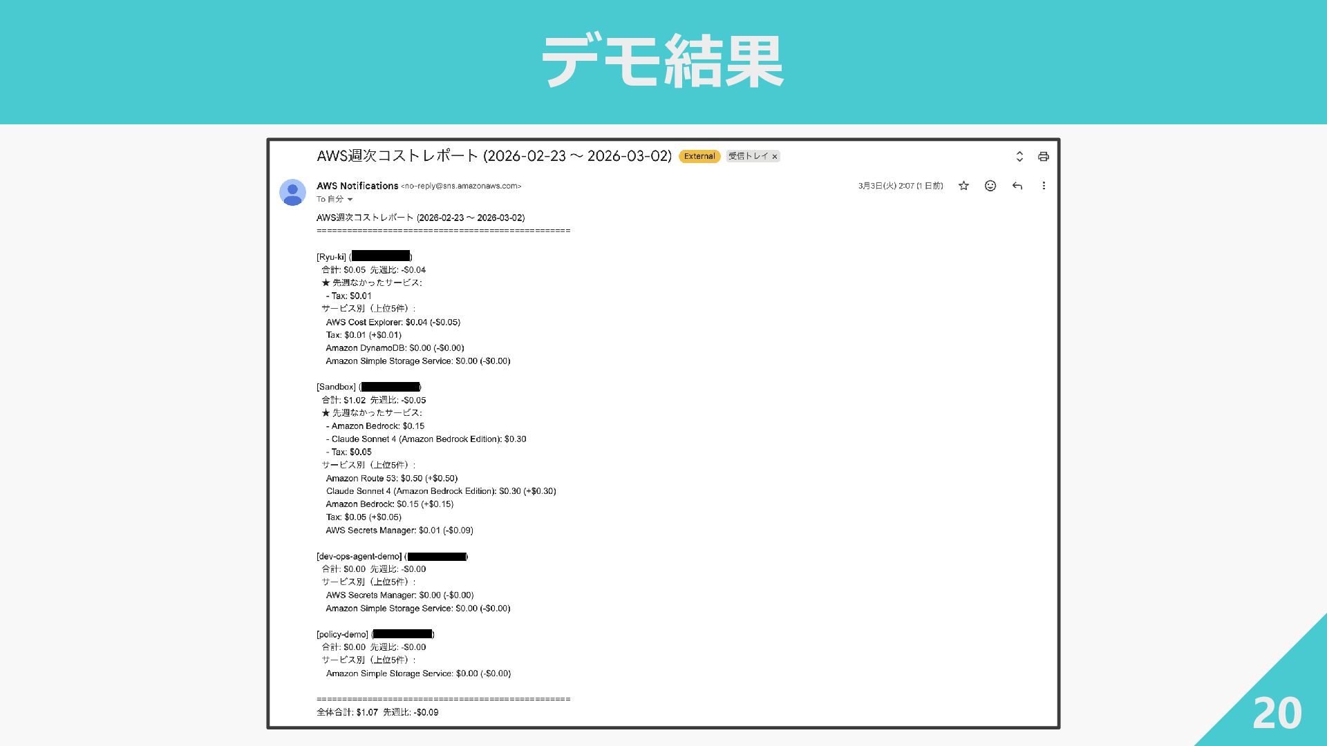 end_date): """アカウント・サービス別のコストを取得 {account_id: {service: Decimal}}""" response = ce_client.get_cost_and_usage( TimePeriod={"Start": start_date, "End": end_date}, Granularity="MONTHLY", Metrics=["UnblendedCost"], GroupBy=[ {"Type": "DIMENSION", "Key": "LINKED_ACCOUNT"}, {"Type": "DIMENSION", "Key": "SERVICE"}, ], )