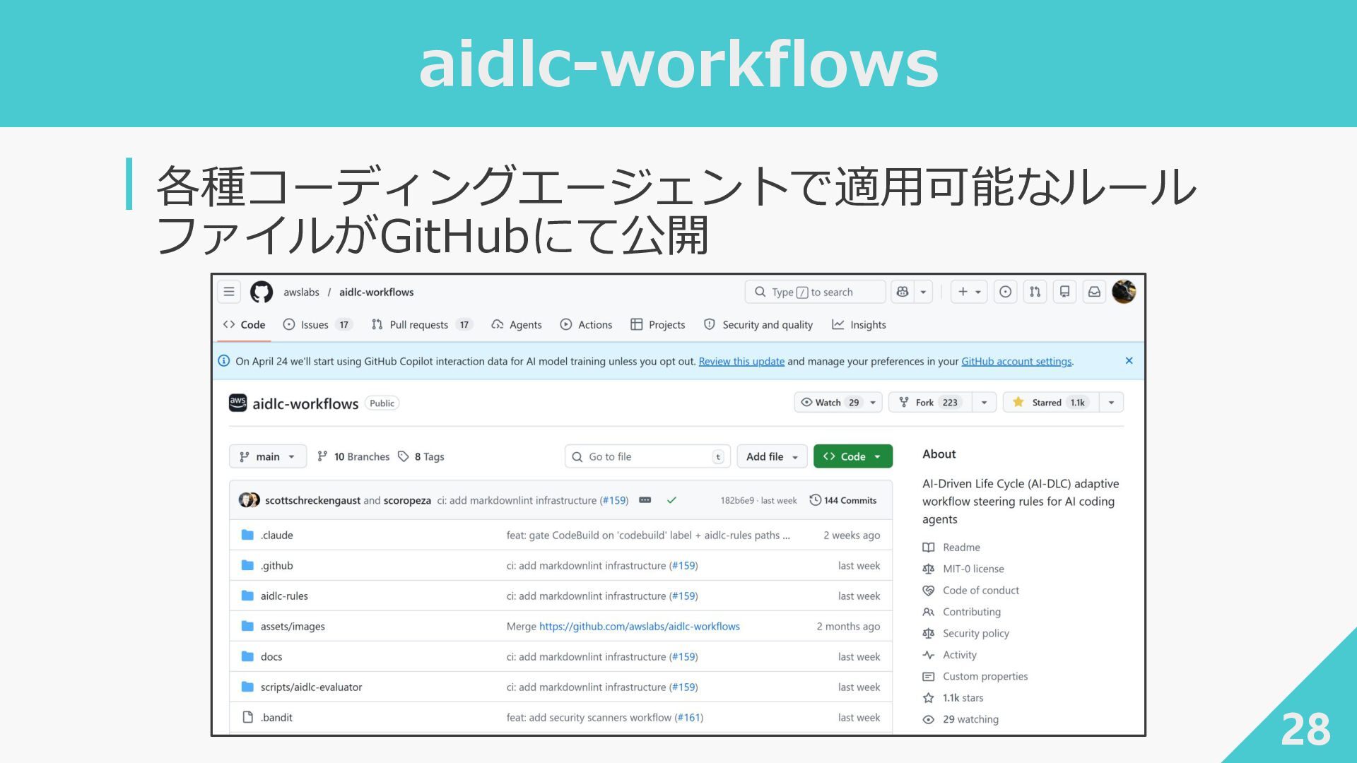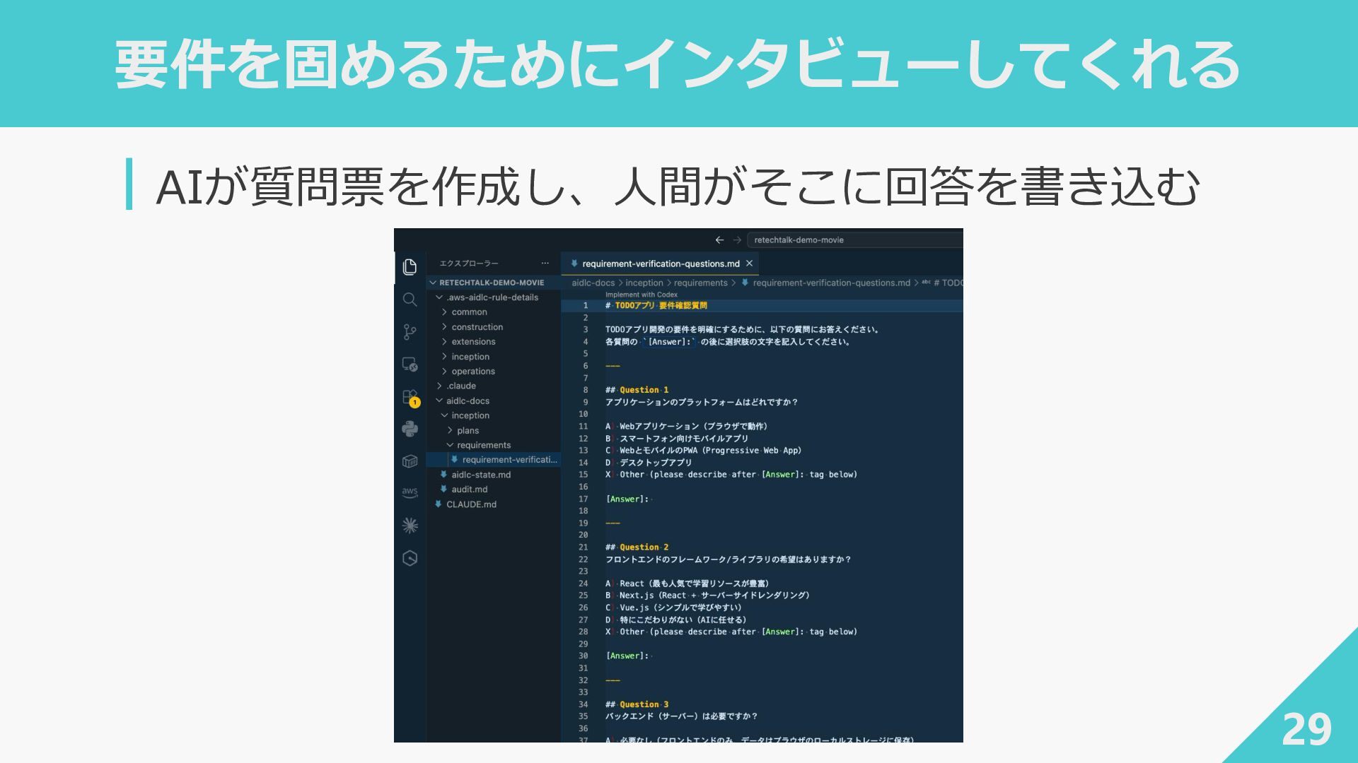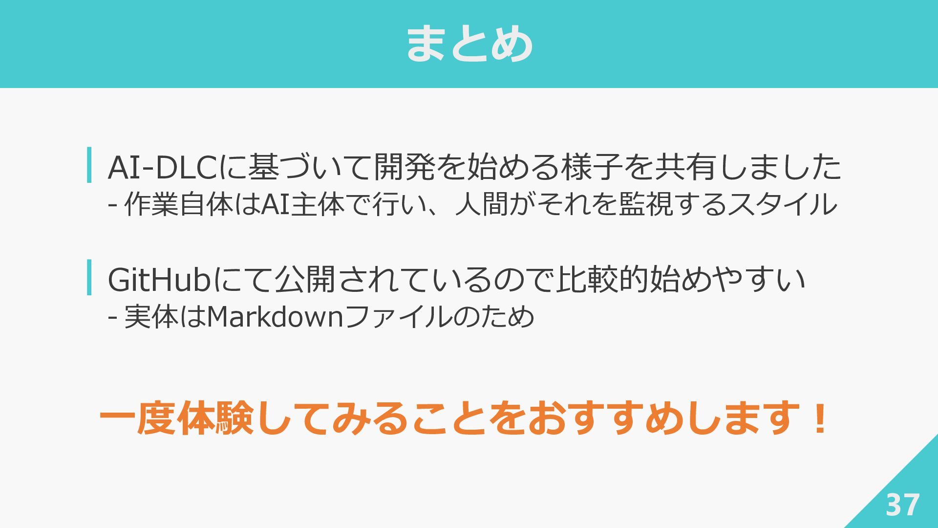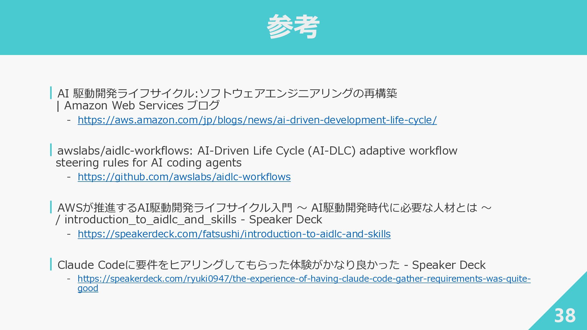 ┃awslabs/aidlc-workflows: AI-Driven Life Cycle (AI-DLC) adaptive workflow steering rules for AI coding agents ‐ https://github.com/awslabs/aidlc-workflows ┃AWSが推進するAI駆動開発ライフサイクル入門 〜 AI駆動開発時代に必要な人材とは 〜 / introduction_to_aidlc_and_skills - Speaker Deck ‐ https://speakerdeck.com/fatsushi/introduction-to-aidlc-and-skills ┃Claude Codeに要件をヒアリングしてもらった体験がかなり良かった - Speaker Deck ‐ https://speakerdeck.com/ryuki0947/the-experience-of-having-claude-code-gather-requirements-was-quite- good 38