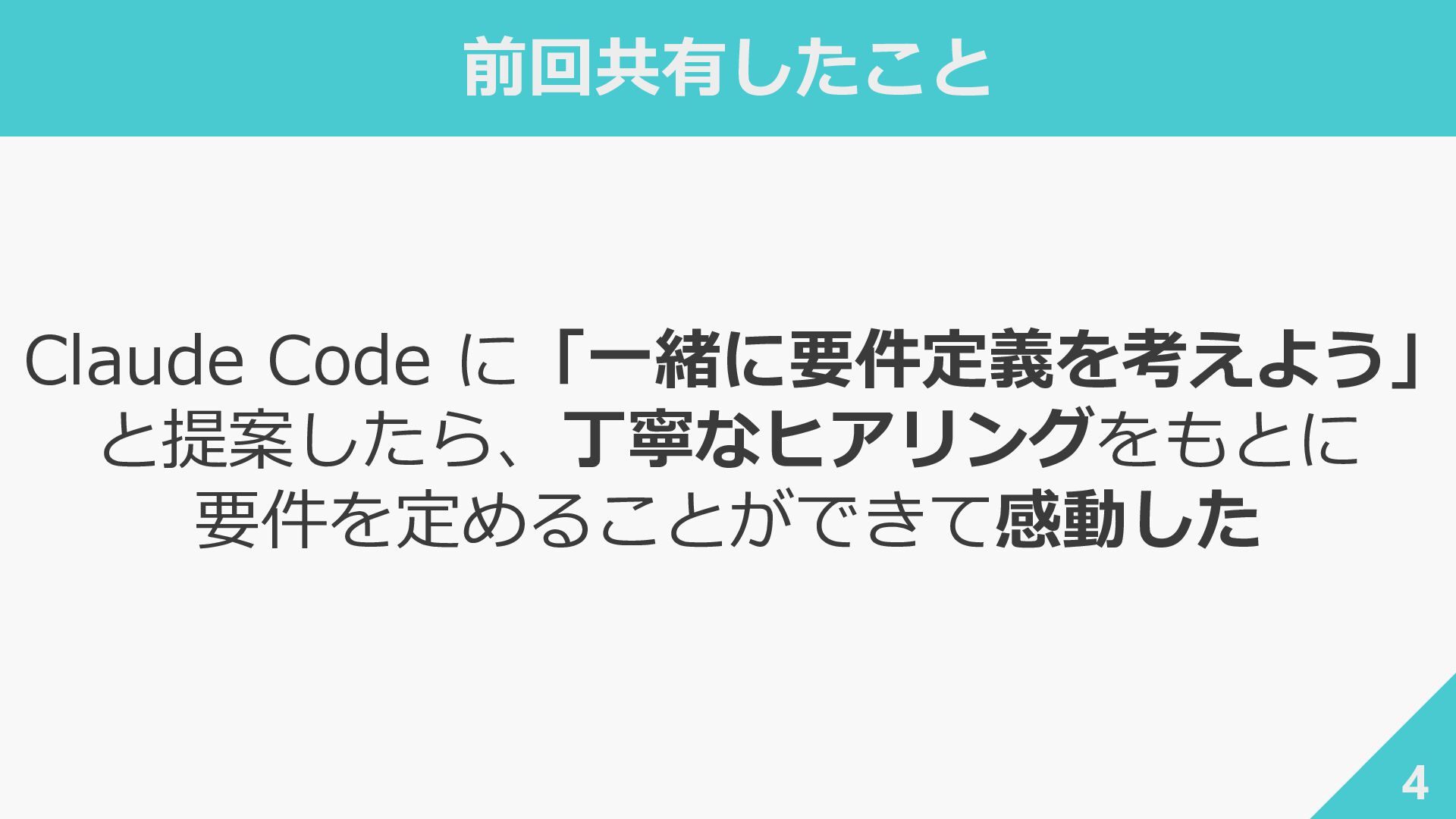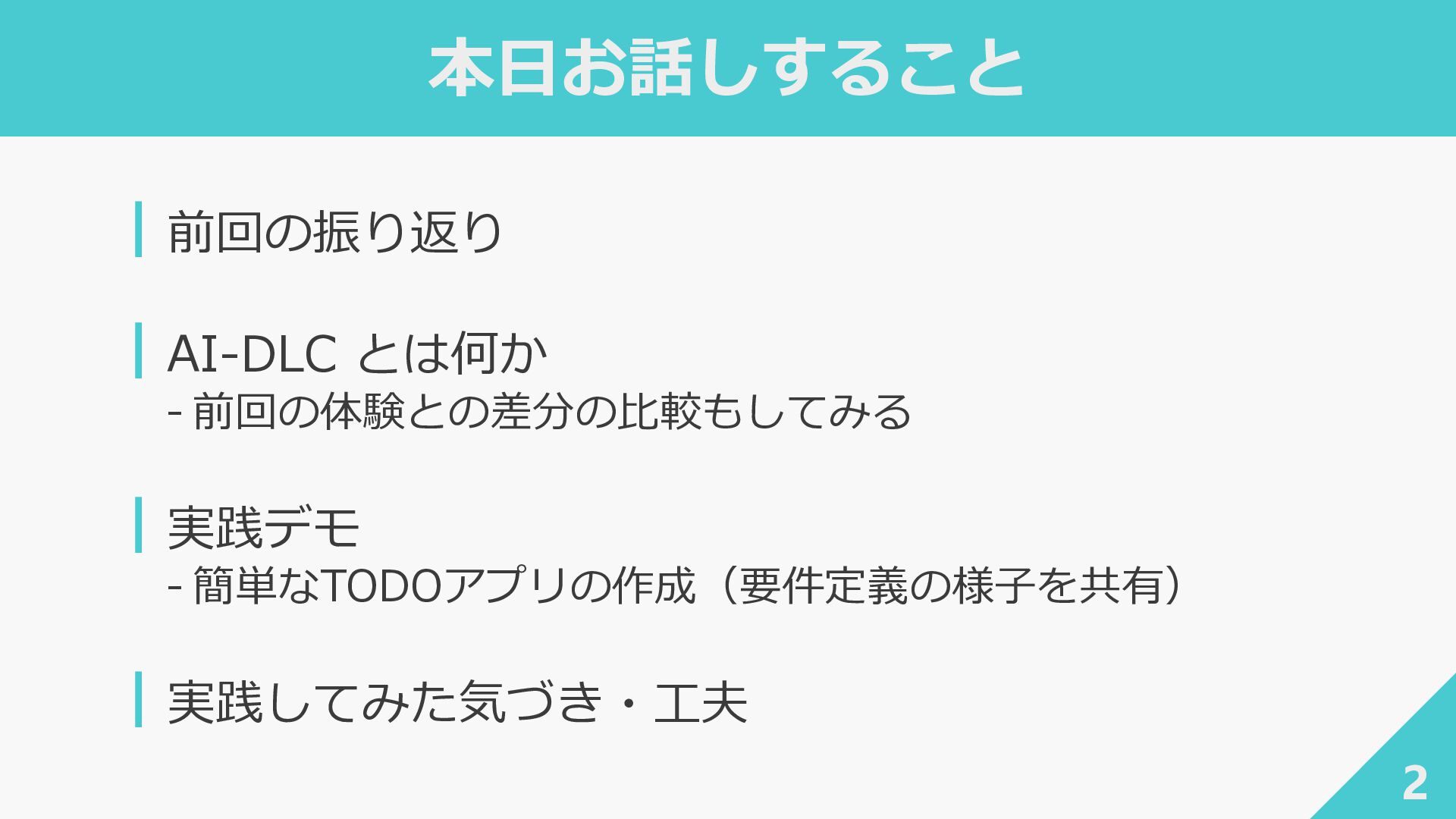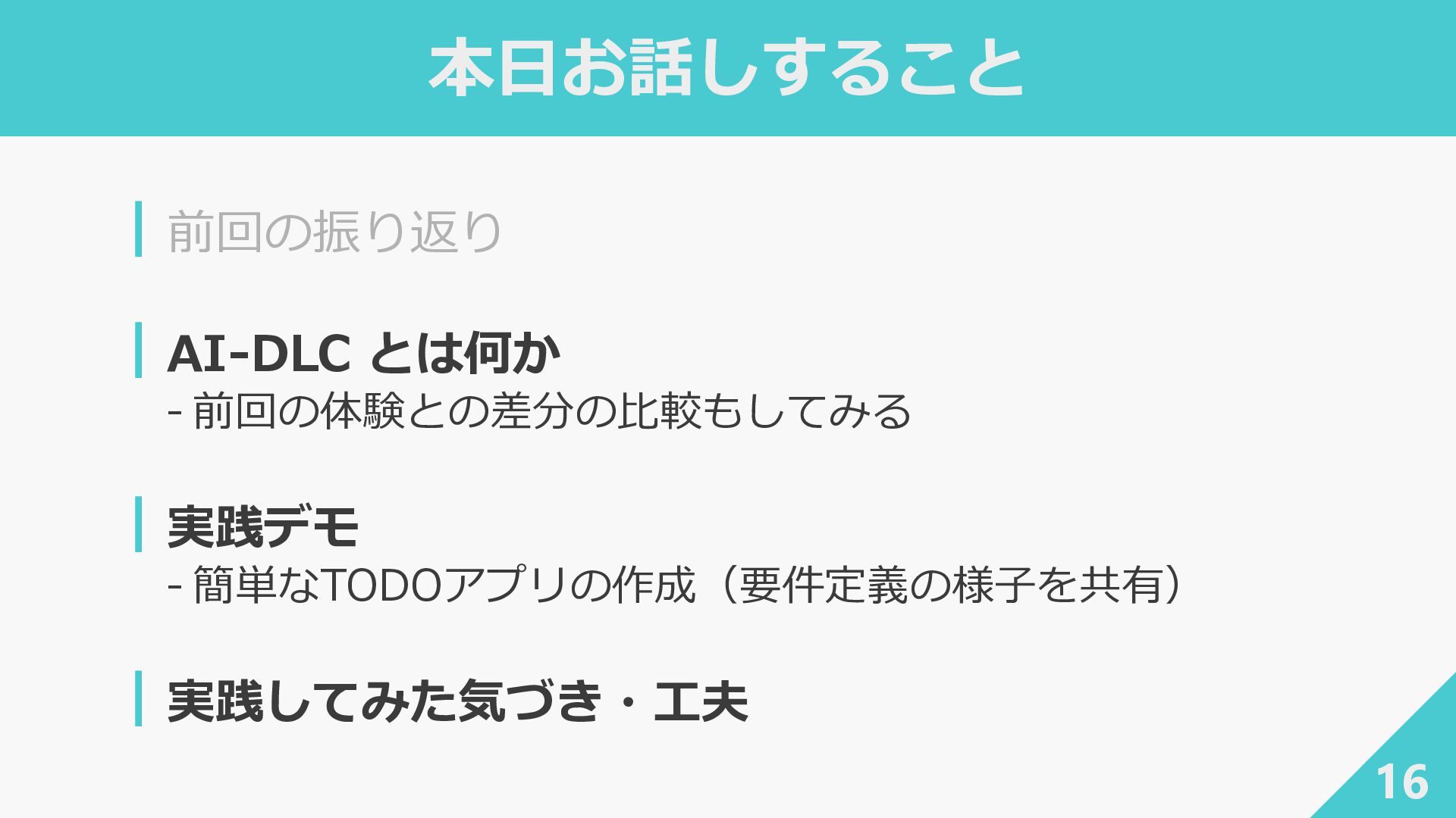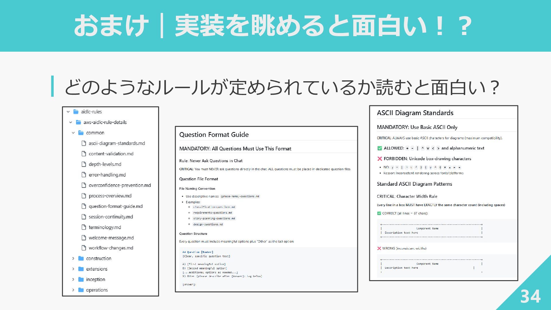 ┃awslabs/aidlc-workflows: AI-Driven Life Cycle (AI-DLC) adaptive workflow steering rules for AI coding agents ‐ https://github.com/awslabs/aidlc-workflows ┃AWSが推進するAI駆動開発ライフサイクル入門 〜 AI駆動開発時代に必要な人材とは 〜 / introduction_to_aidlc_and_skills - Speaker Deck ‐ https://speakerdeck.com/fatsushi/introduction-to-aidlc-and-skills ┃Claude Codeに要件をヒアリングしてもらった体験がかなり良かった - Speaker Deck ‐ https://speakerdeck.com/ryuki0947/the-experience-of-having-claude-code-gather-requirements-was-quite- good 38