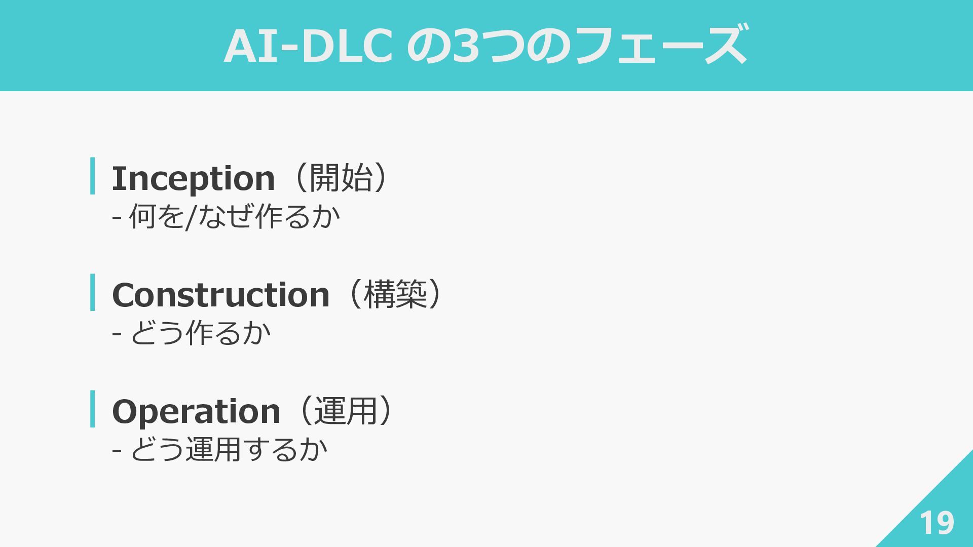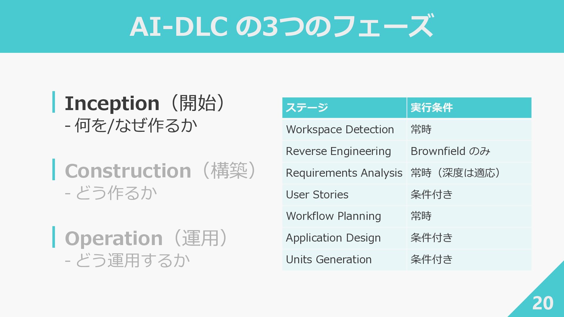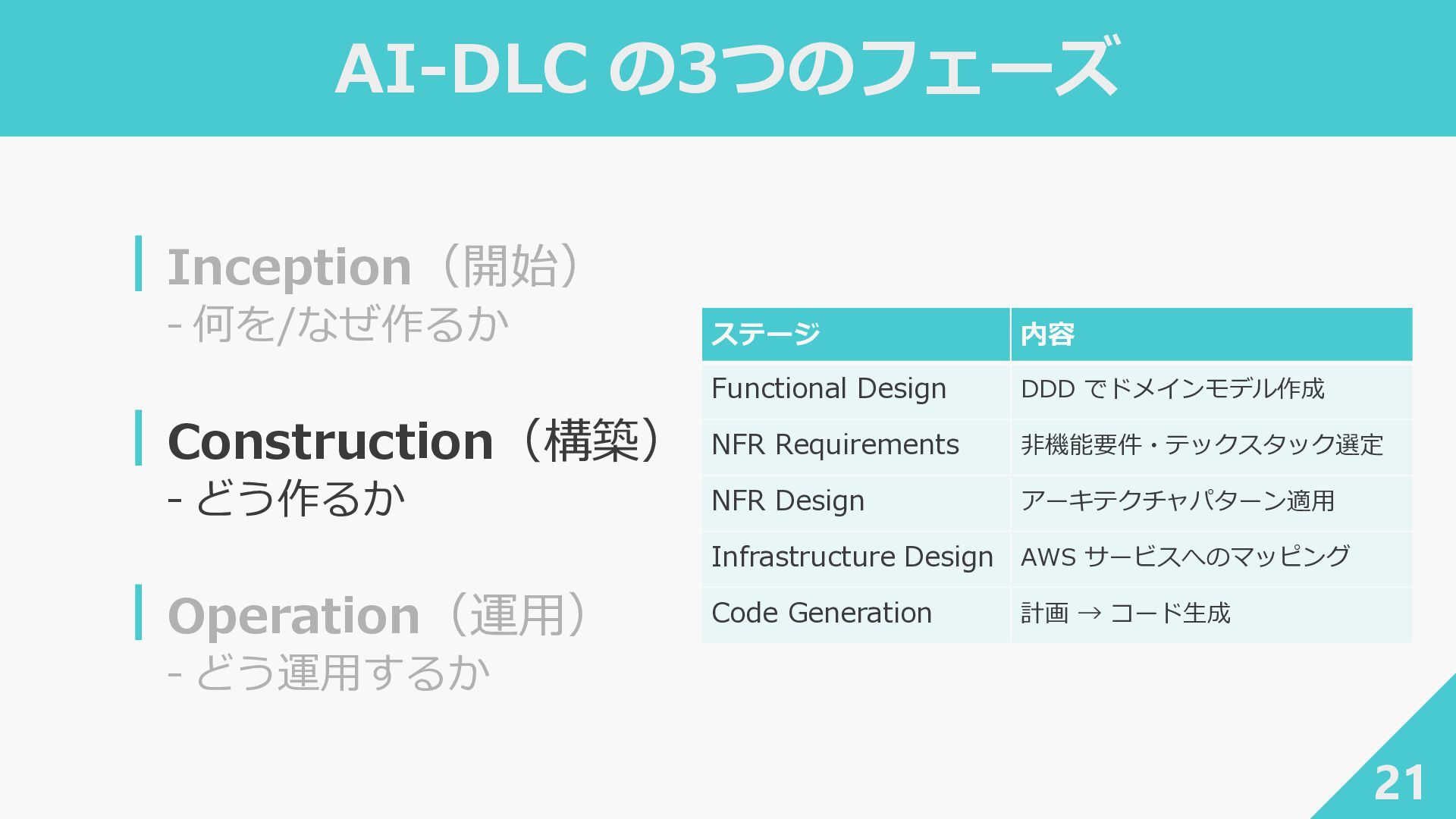 2. AI-DLC の3つのフェーズ 20 ┃Inception(開始) ‐ 何を/なぜ作るか ┃Construction(構築) ‐ どう作るか ┃Operation(運用)