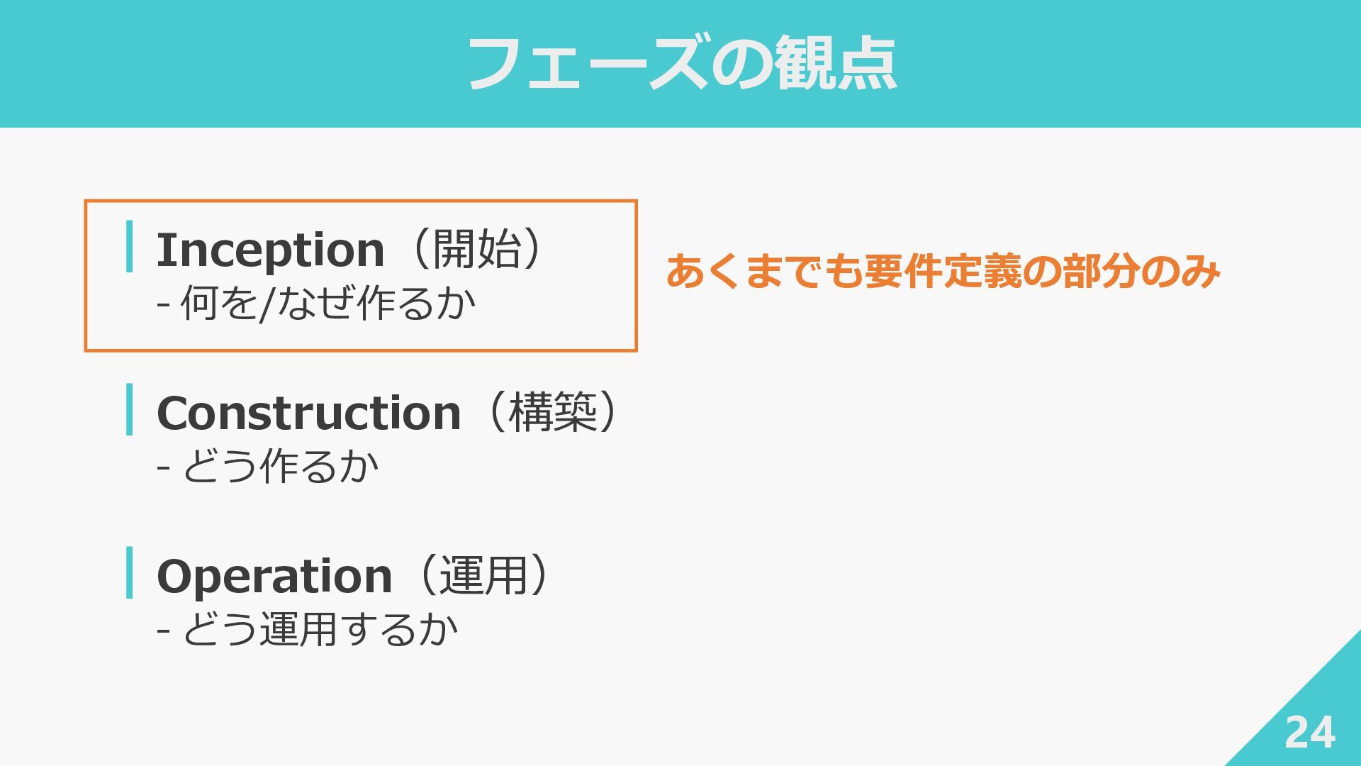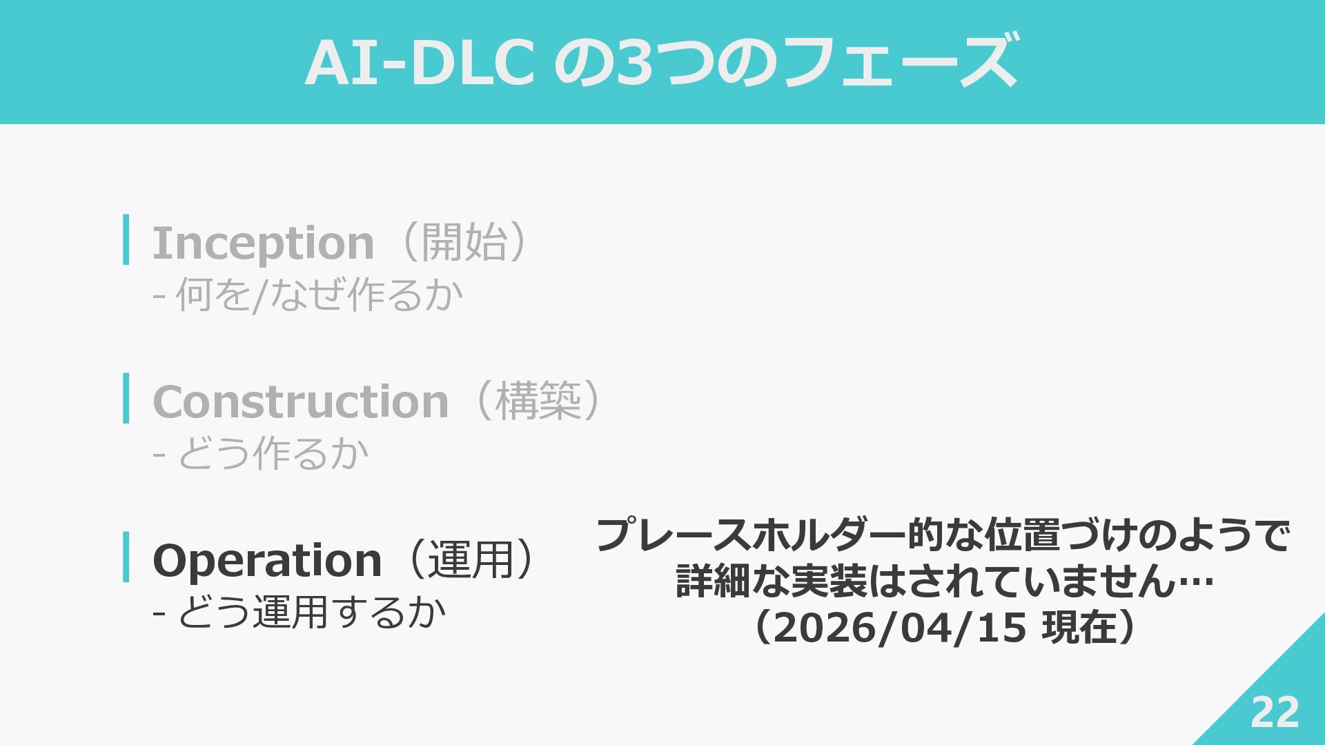 3. AI-DLC の3つのフェーズ 21 ┃Inception(開始) ‐ 何を/なぜ作るか ┃Construction(構築) ‐ どう作るか ┃Operation(運用)