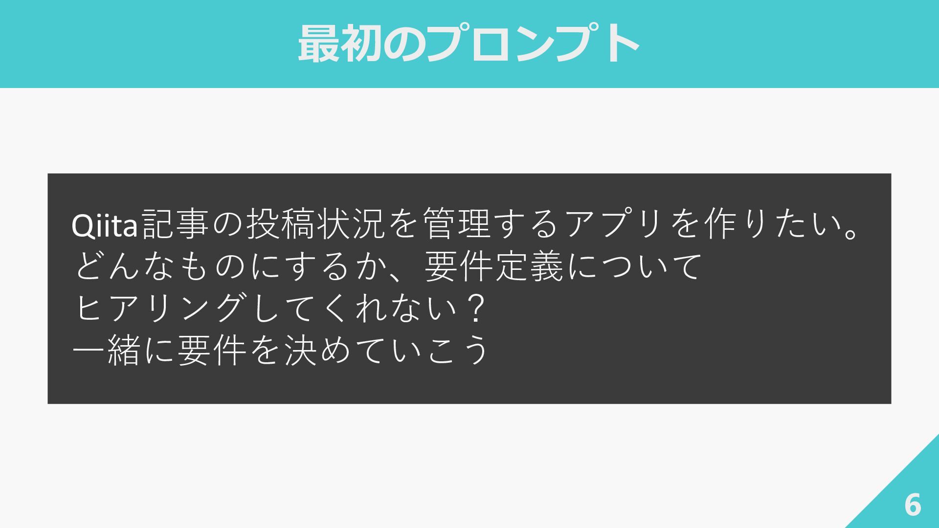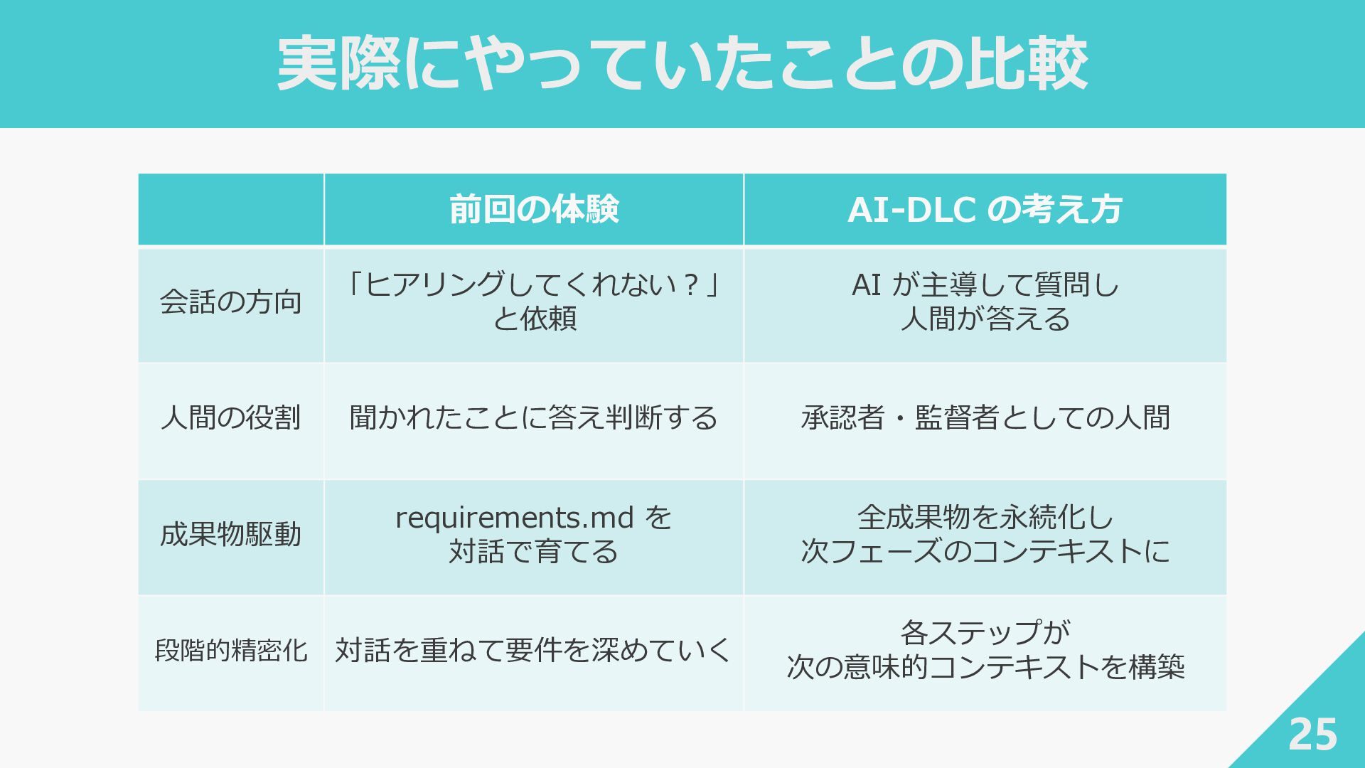 5. 実際にやっていたことの比較 25 前回の体験 AI-DLC の考え方 会話の方向 「ヒアリングしてくれない?」 と依頼 AI が主導して質問し