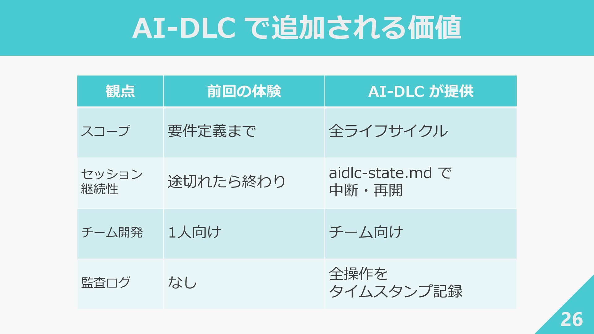 6. AI-DLC で追加される価値 26 観点 前回の体験 AI-DLC が提供 スコープ 要件定義まで 全ライフサイクル