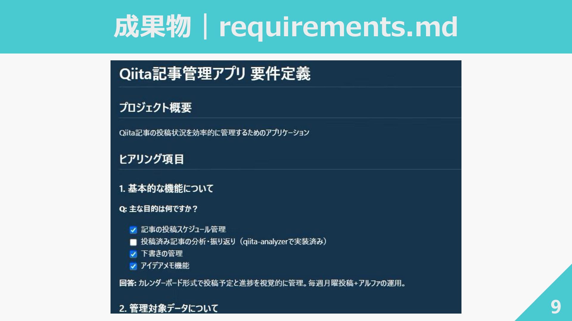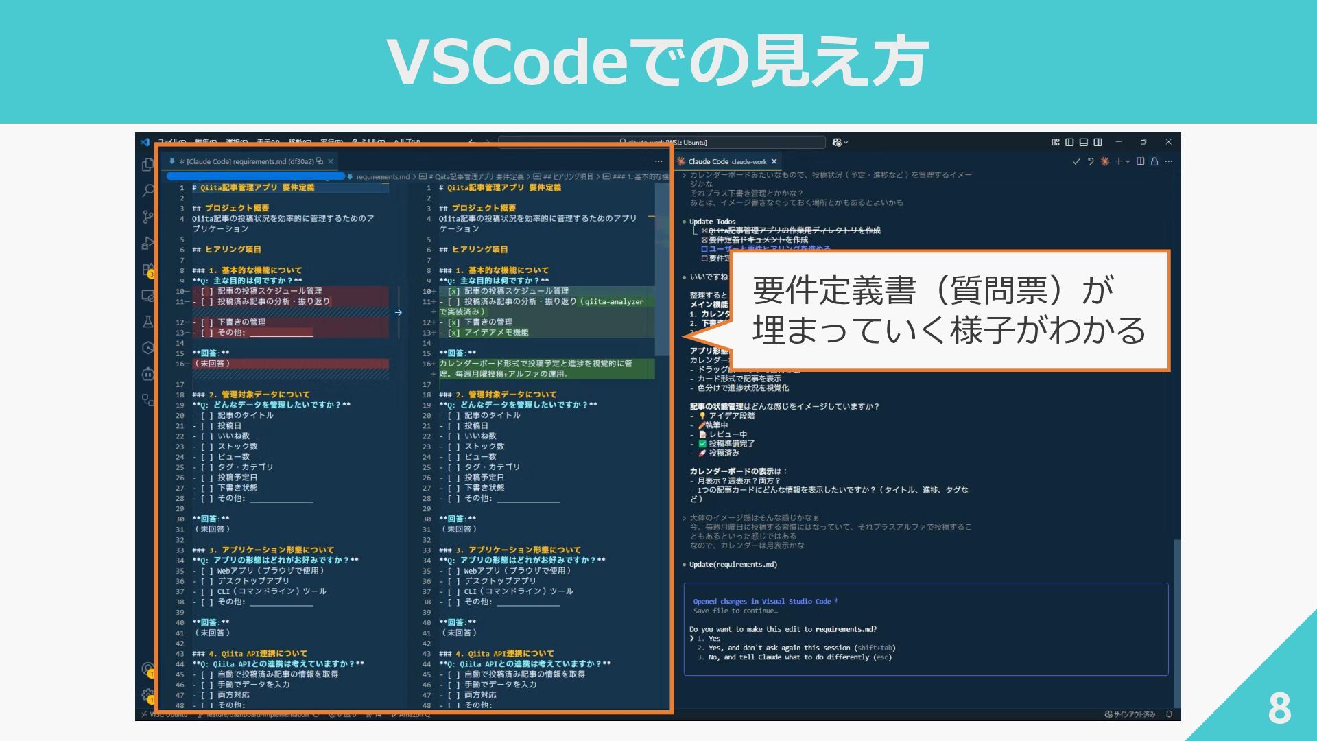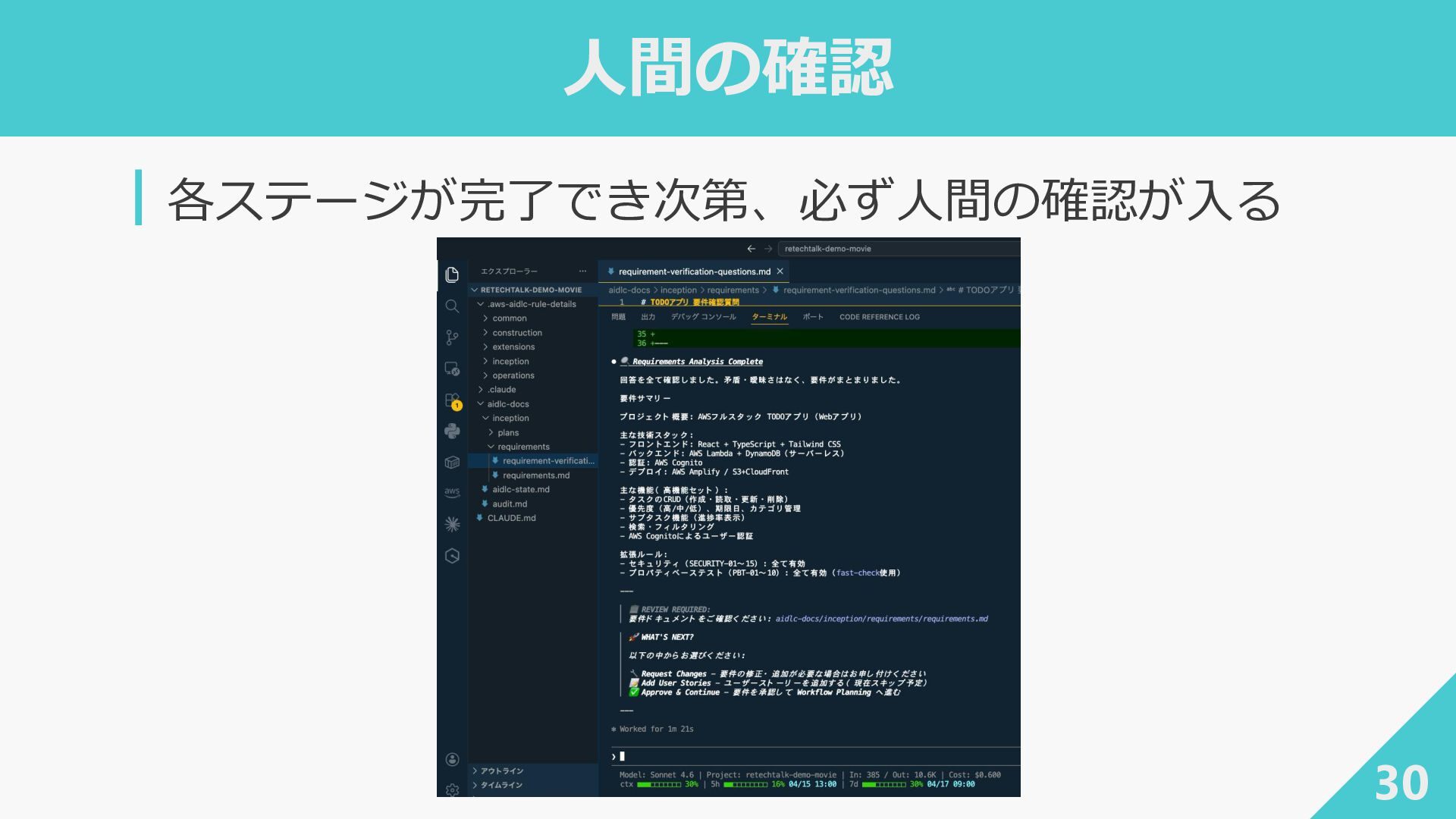 人間が答える 人間の役割 聞かれたことに答え判断する 承認者・監督者としての人間 成果物駆動 requirements.md を 対話で育てる 全成果物を永続化し 次フェーズのコンテキストに 段階的精密化 対話を重ねて要件を深めていく 各ステップが 次の意味的コンテキストを構築