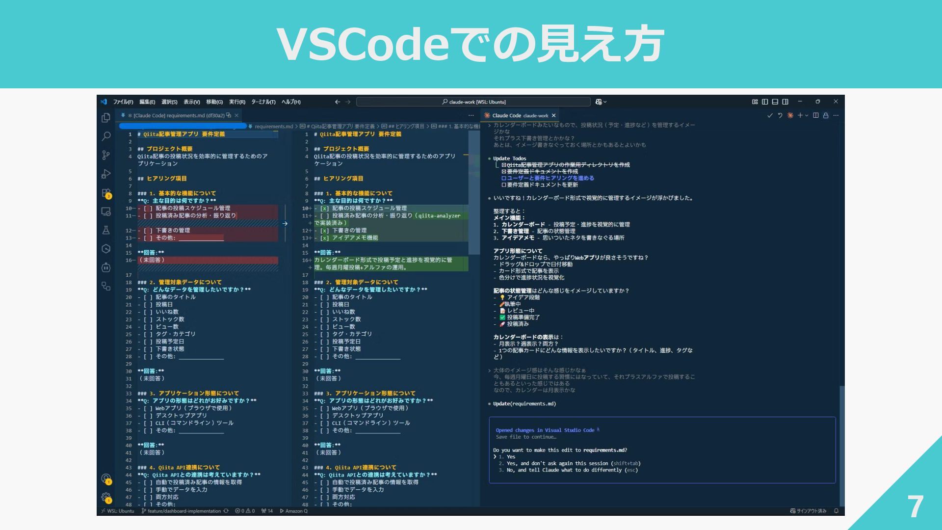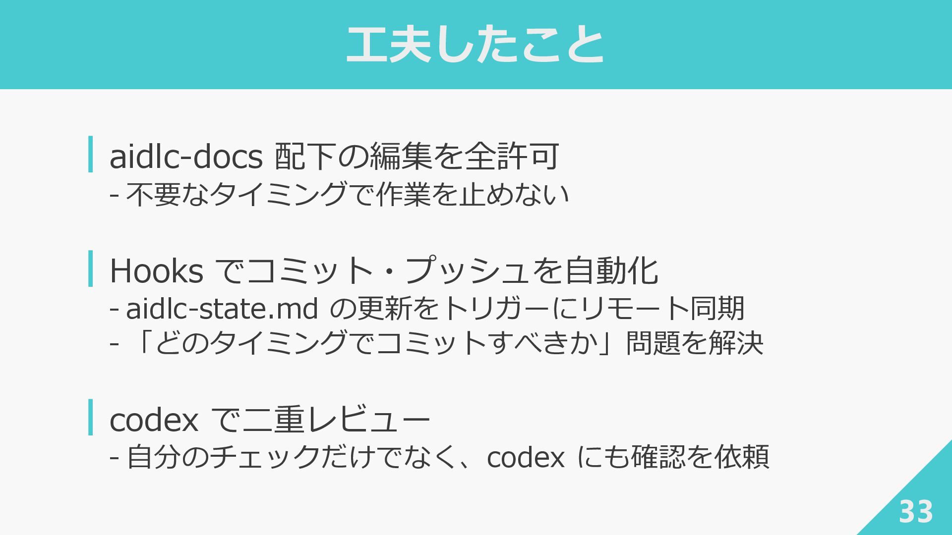 7. 工夫したこと 33 ┃aidlc-docs 配下の編集を全許可 ‐ 不要なタイミングで作業を止めない ┃Hooks でコミット・プッシュを自動化 ‐ aidlc-state.md