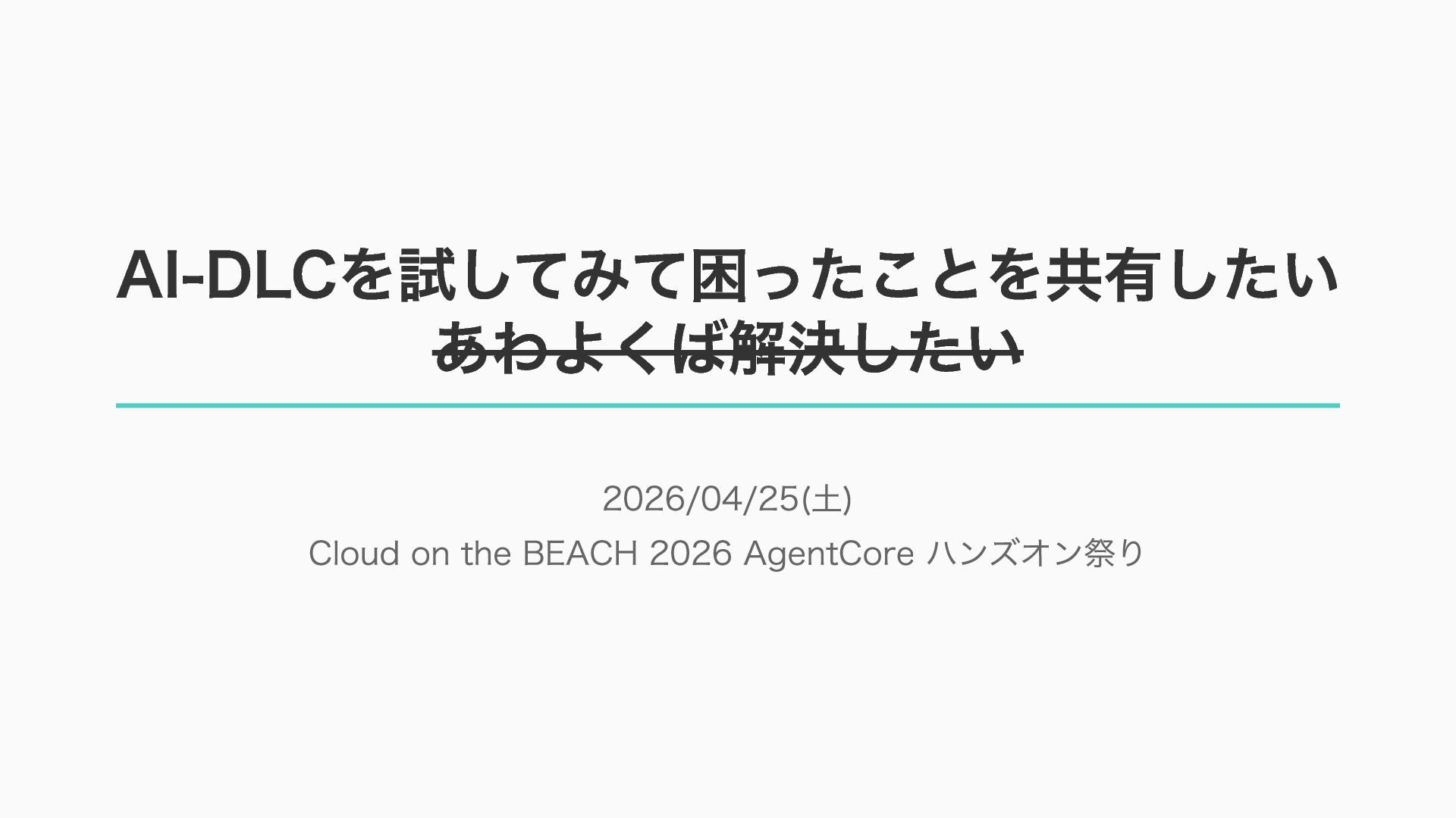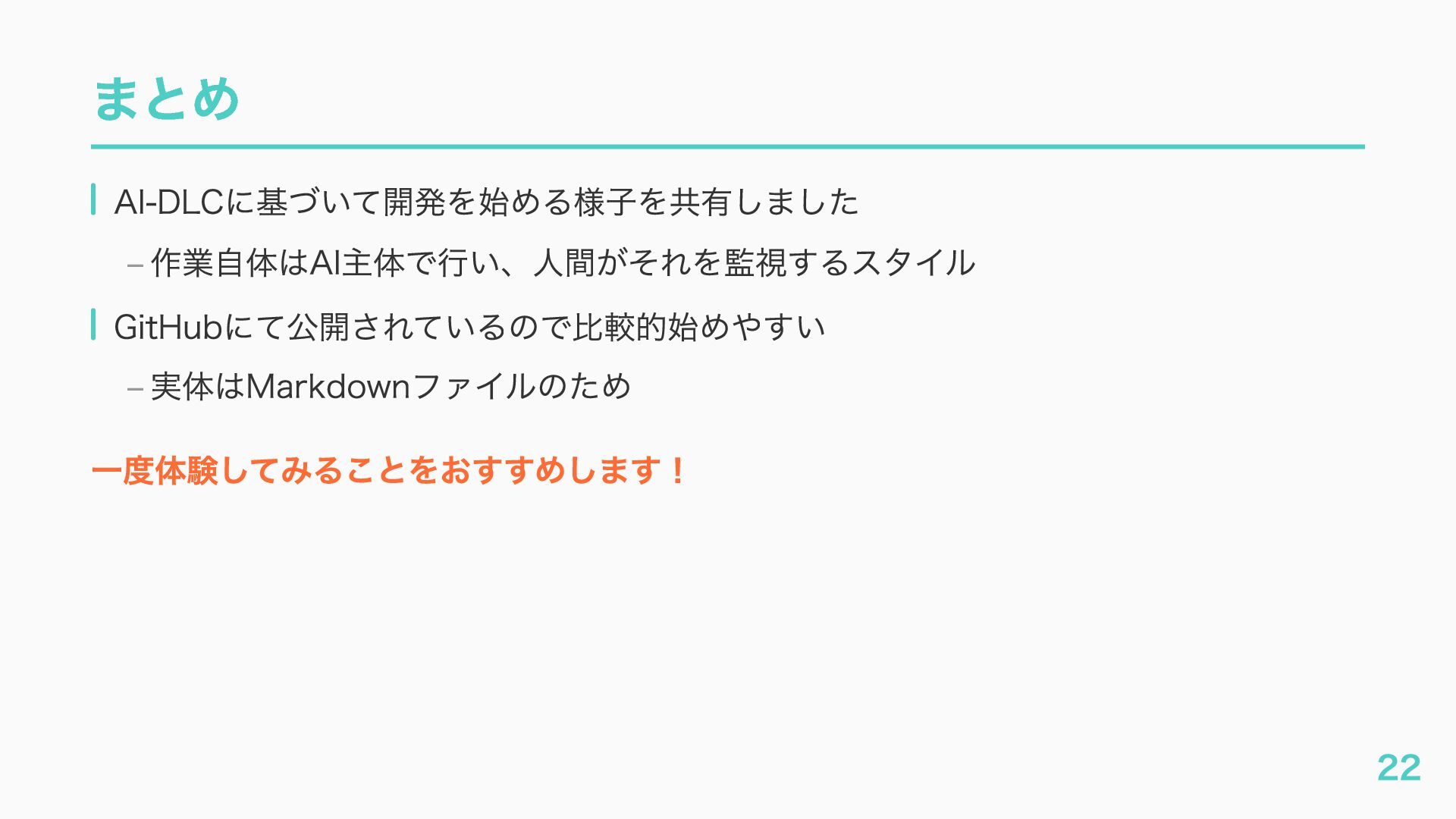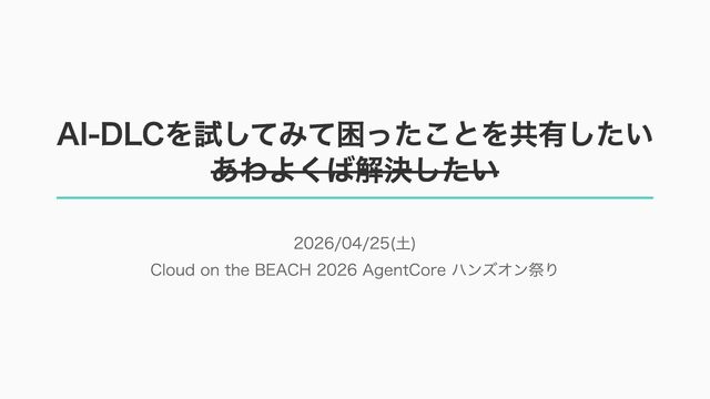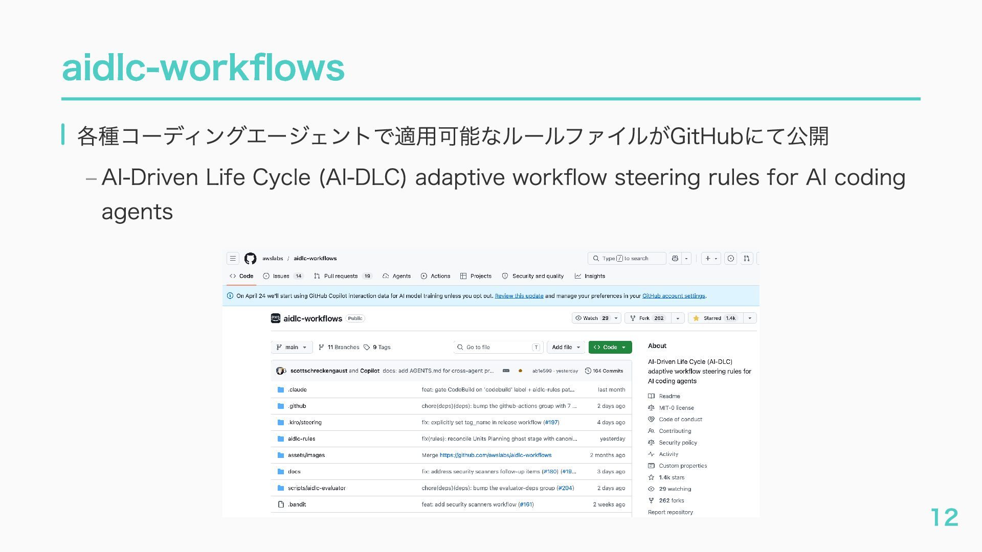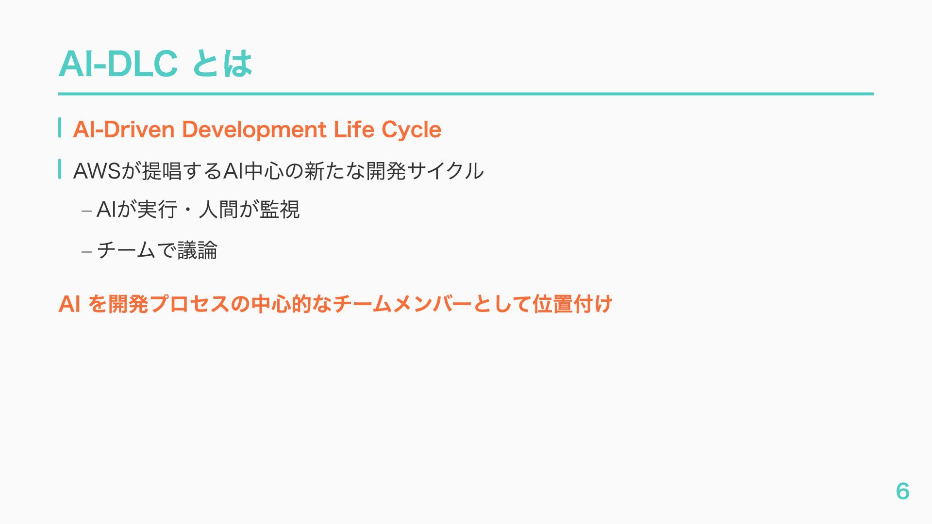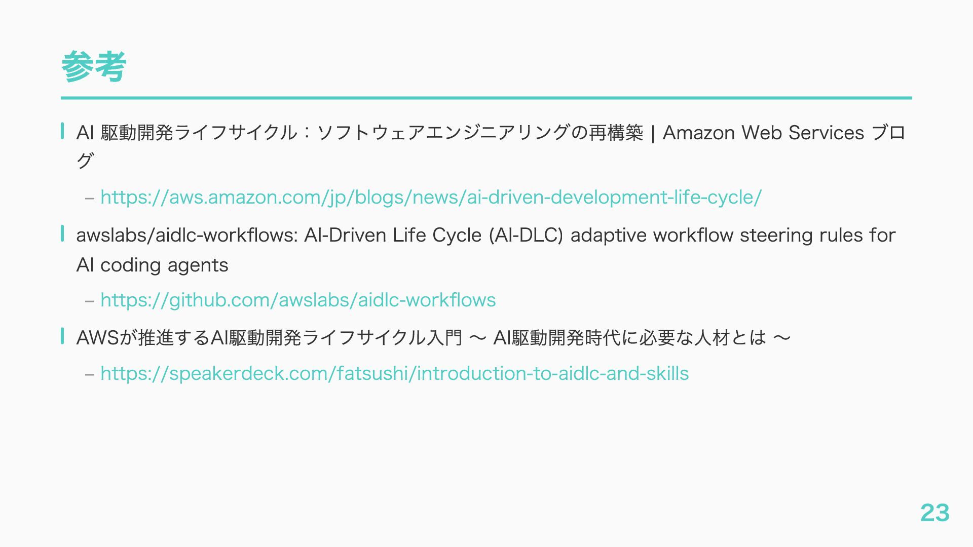 – awslabs/aidlc-workflows: AI-Driven Life Cycle (AI-DLC) adaptive workflow steering rules for AI coding agents https://github.com/awslabs/aidlc-workflows – AWSが推進するAI駆動開発ライフサイクル入門 〜 AI駆動開発時代に必要な人材とは 〜 https://speakerdeck.com/fatsushi/introduction-to-aidlc-and-skills – 23