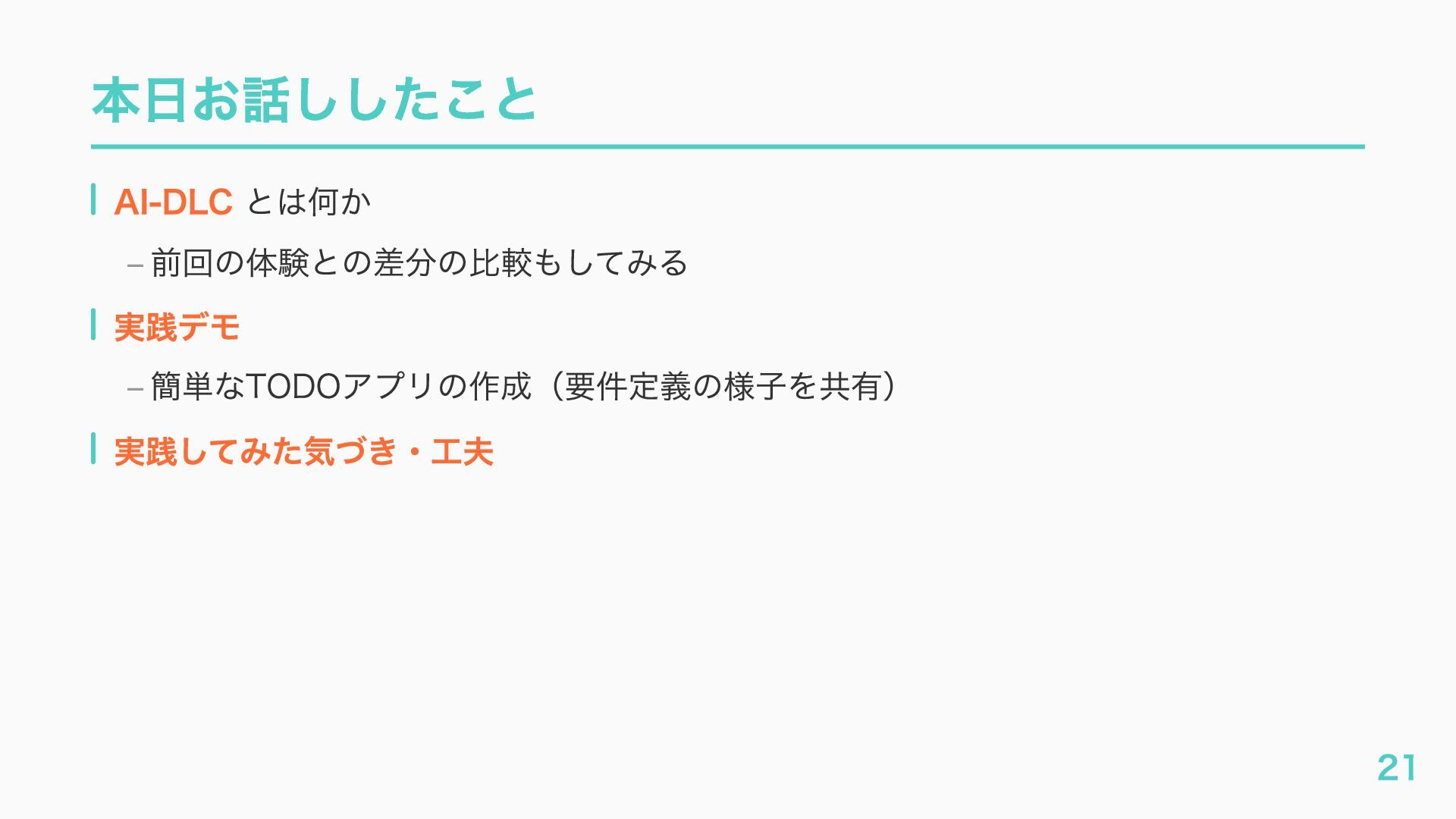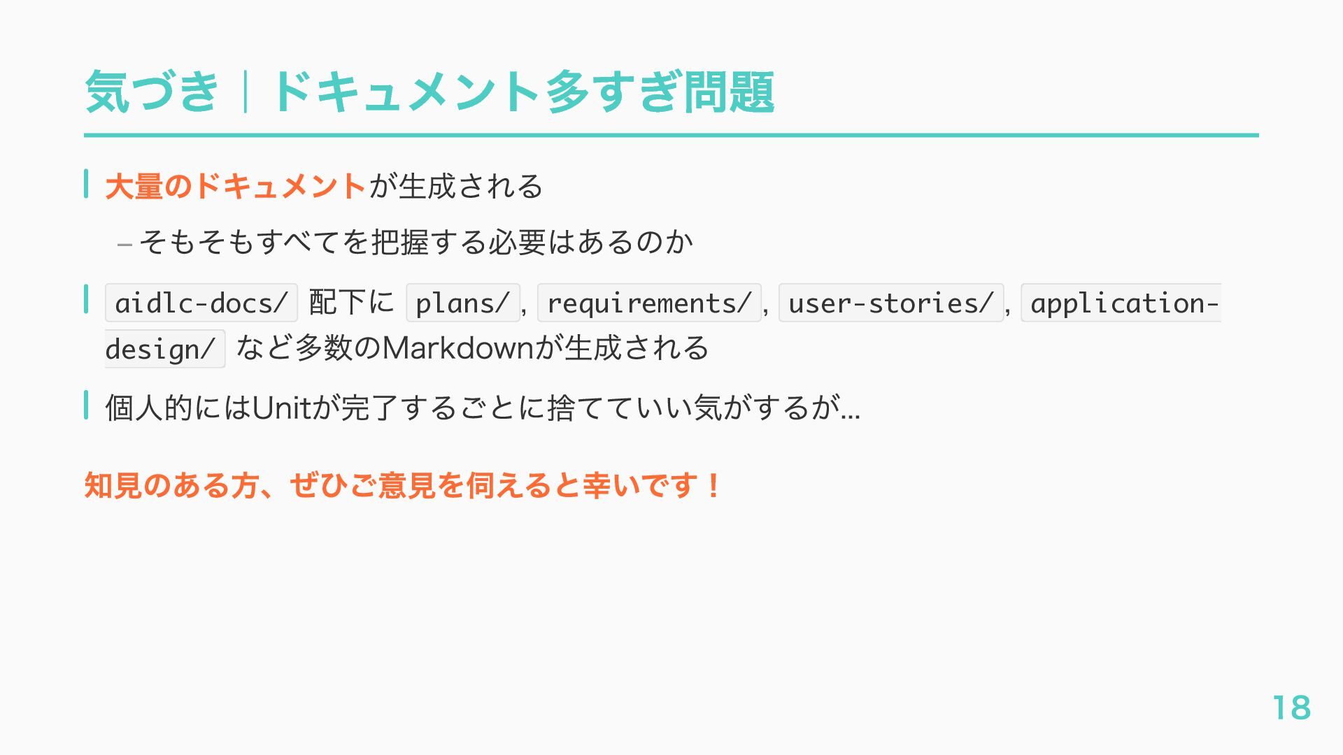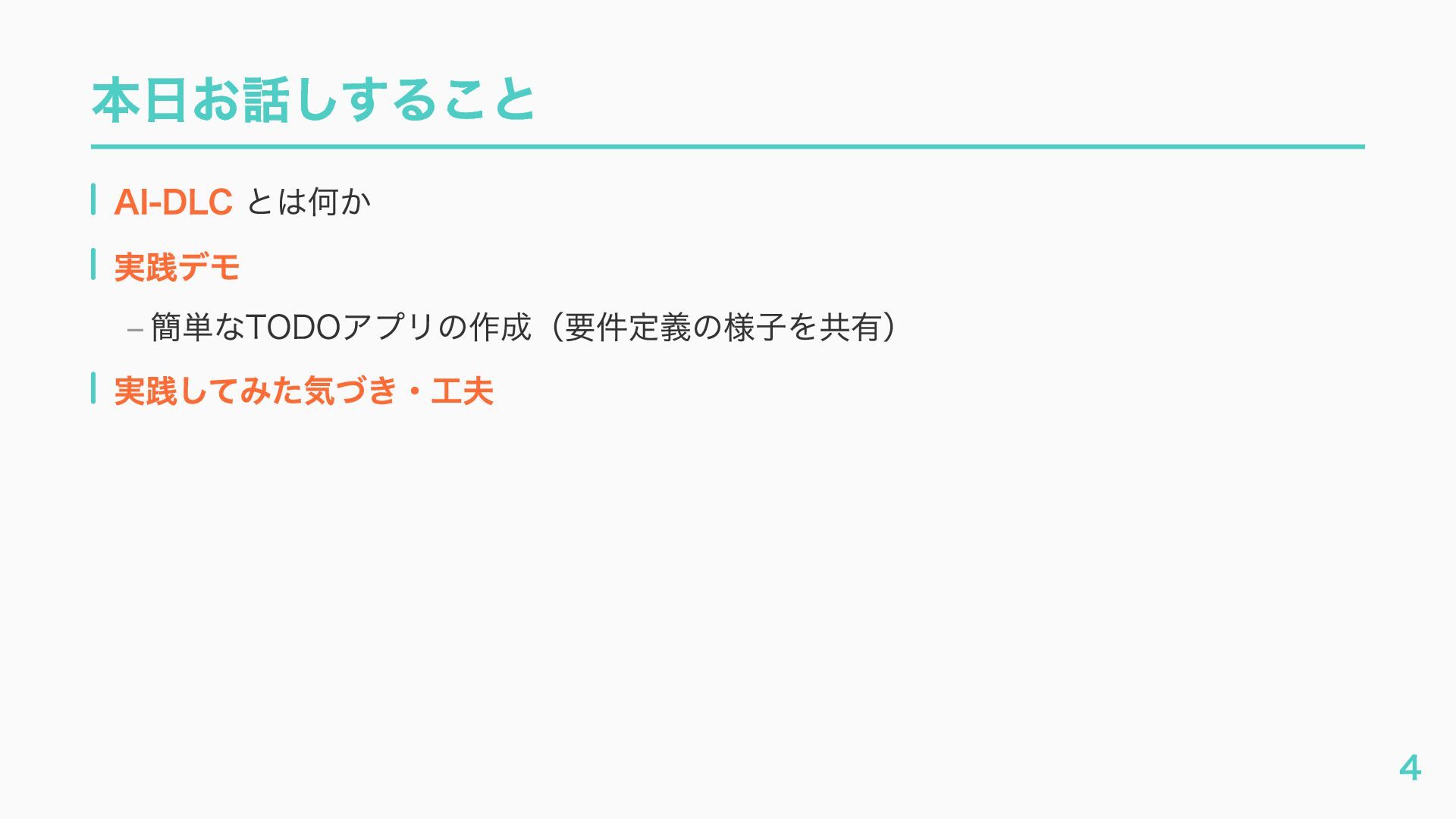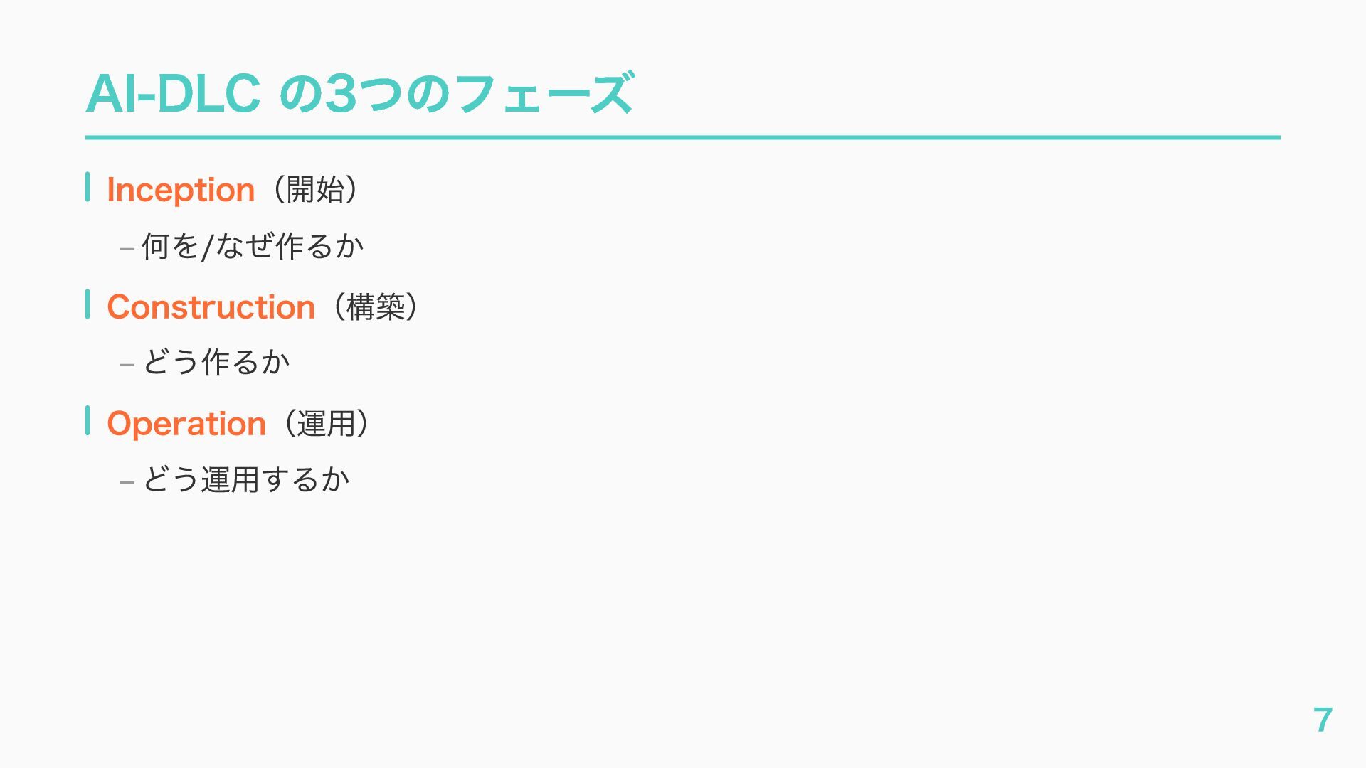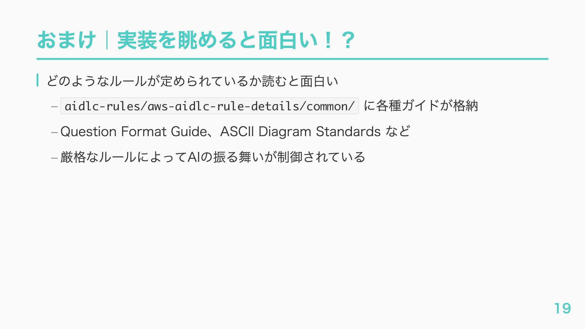 – awslabs/aidlc-workflows: AI-Driven Life Cycle (AI-DLC) adaptive workflow steering rules for AI coding agents https://github.com/awslabs/aidlc-workflows – AWSが推進するAI駆動開発ライフサイクル入門 〜 AI駆動開発時代に必要な人材とは 〜 https://speakerdeck.com/fatsushi/introduction-to-aidlc-and-skills – 23