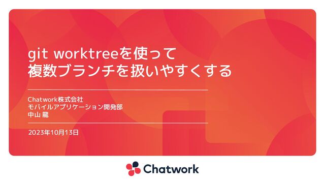 Chatwork株式会社 モバイルアプリケーション開発部 中山 龍 2023年10月13日 git worktreeを使って 複数ブランチを扱いやすくする