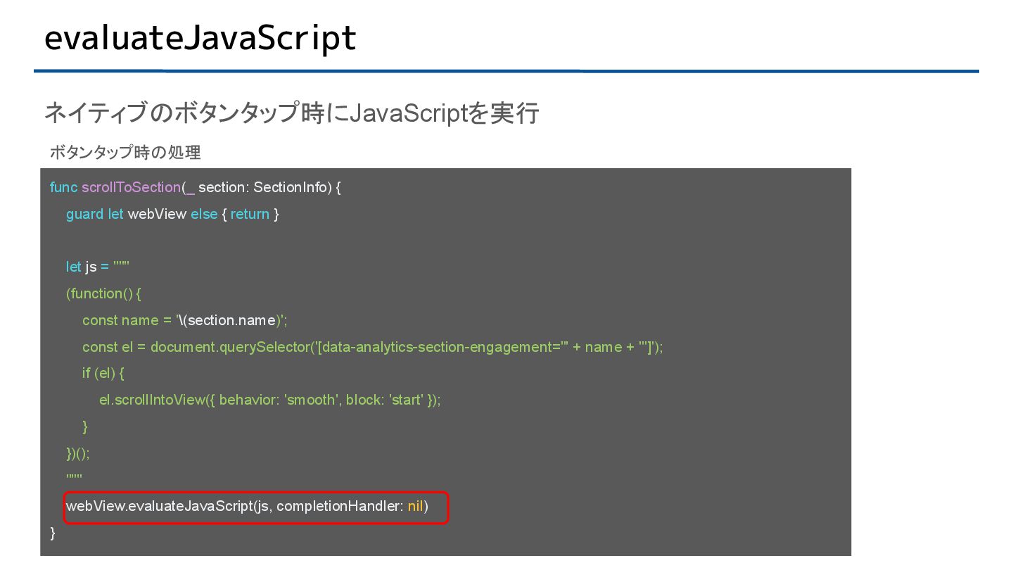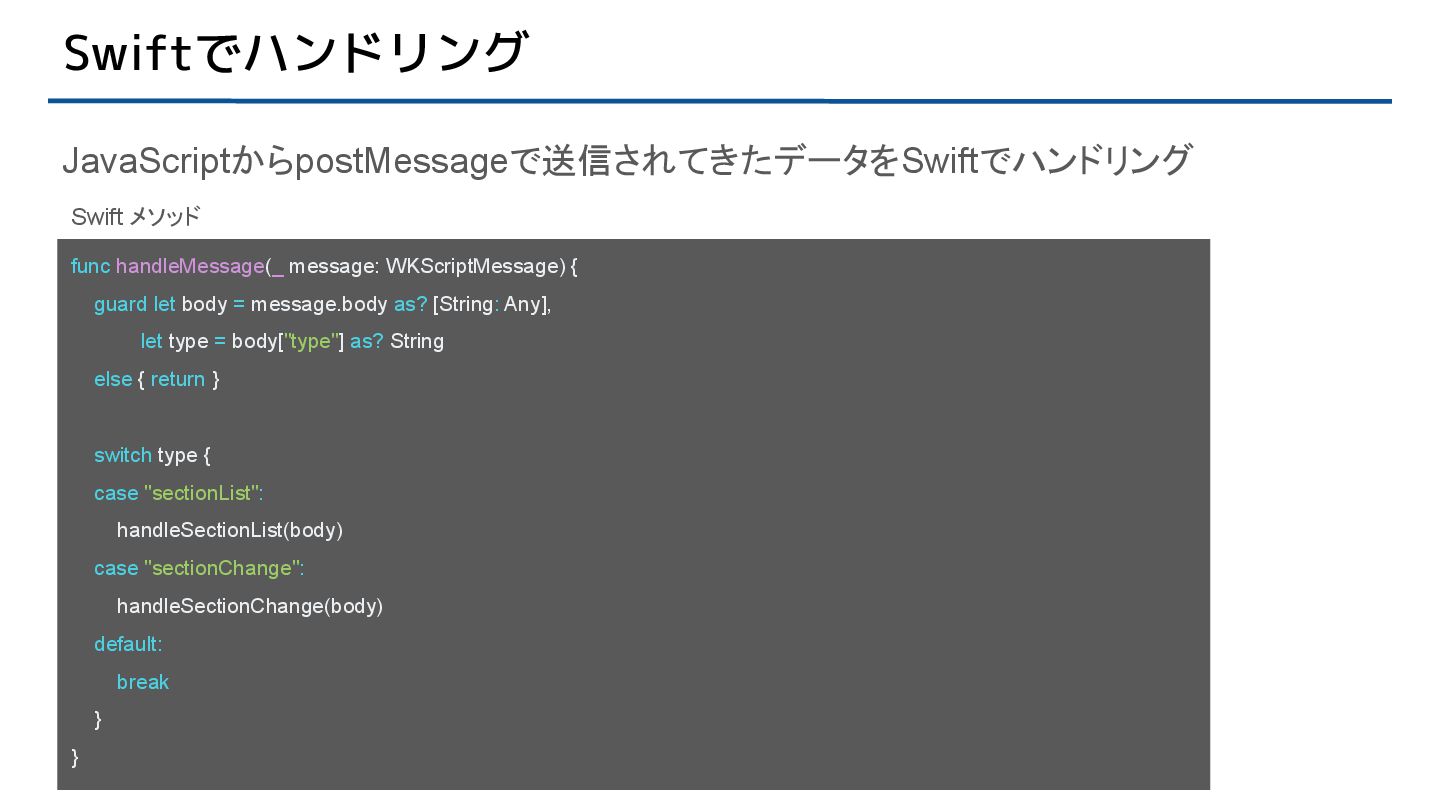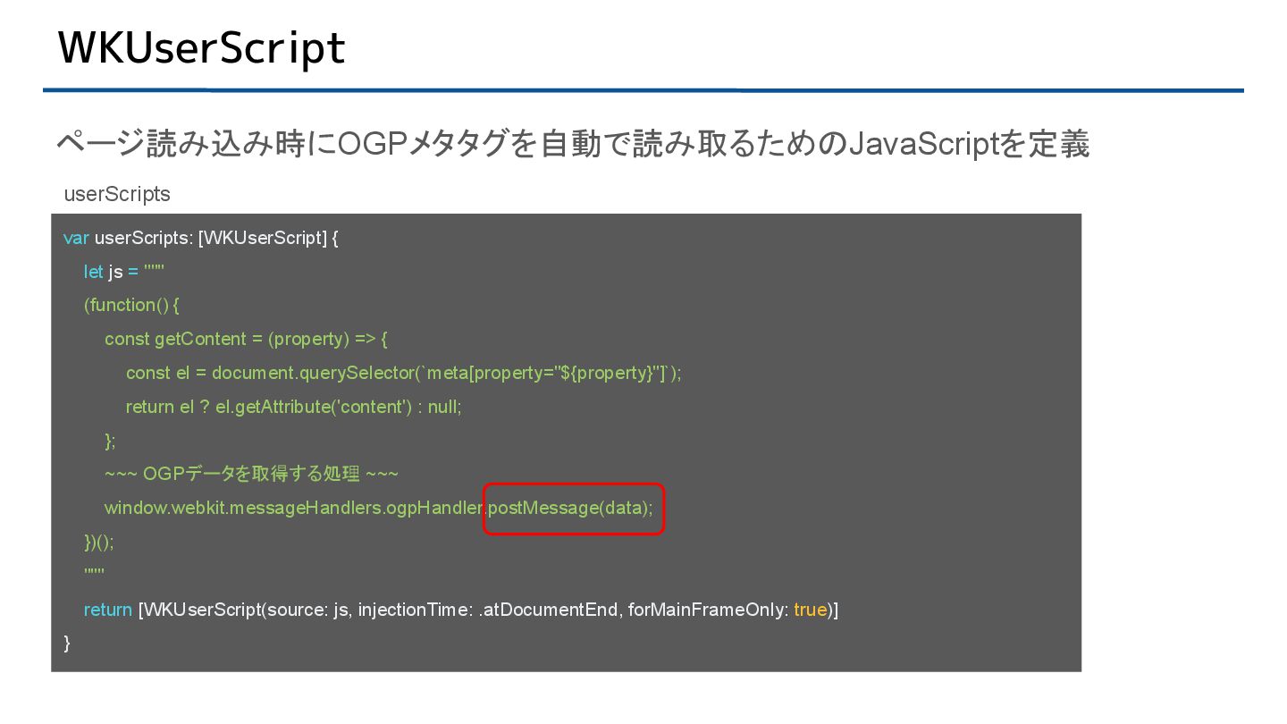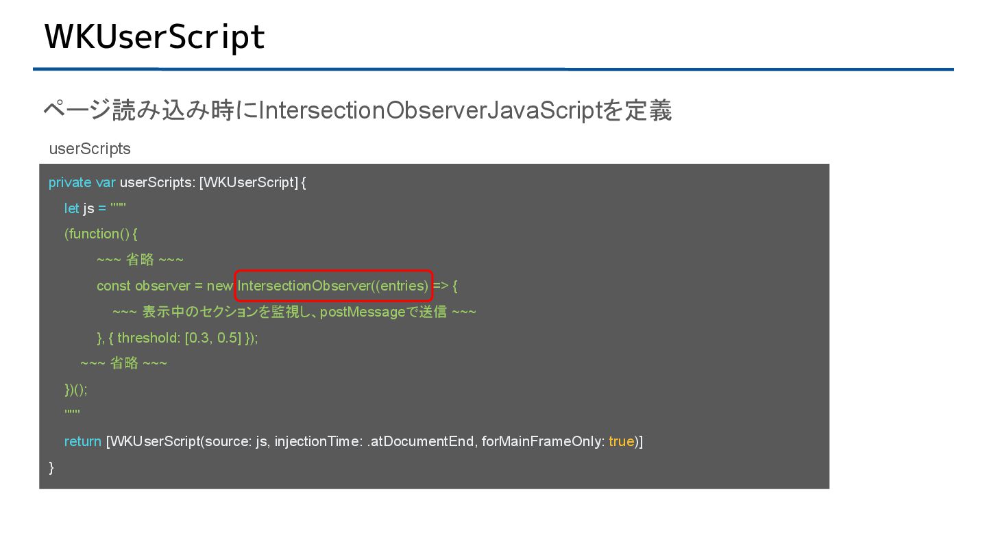 """ (function() { ~~~ 省略 ~~~ const observer = new IntersectionObserver((entries) => { ~~~ 表示中のセクションを監視し、postMessageで送信 ~~~ }, { threshold: [0.3, 0.5] }); ~~~ 省略 ~~~ })(); """ return [WKUserScript(source: js, injectionTime: .atDocumentEnd, forMainFrameOnly: true)] } userScripts