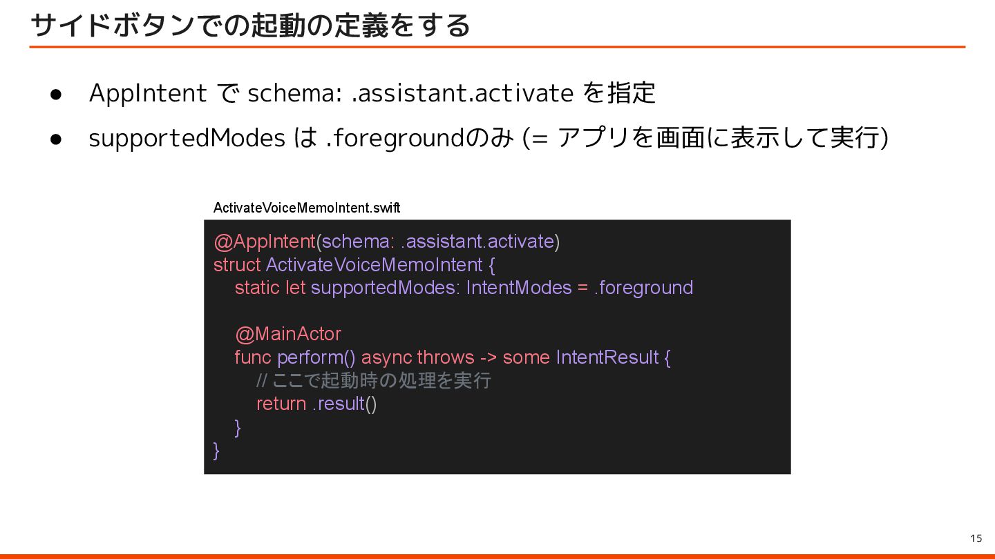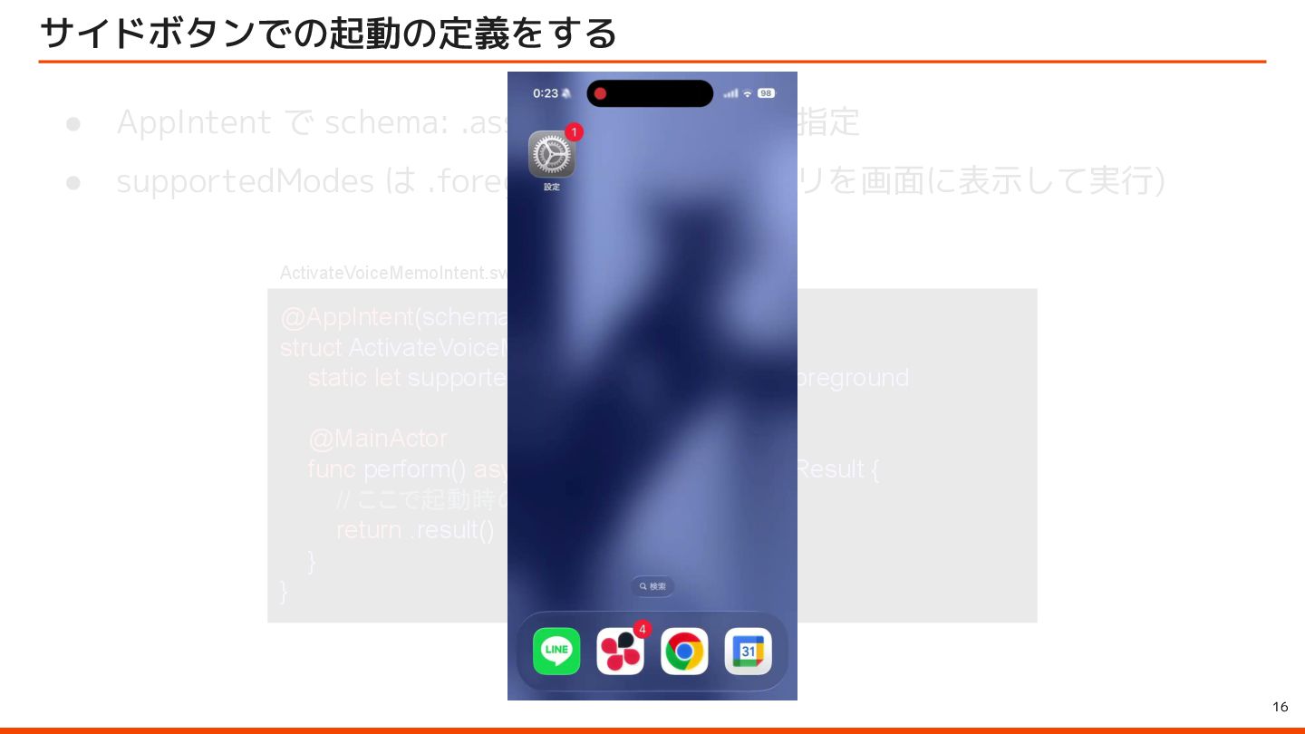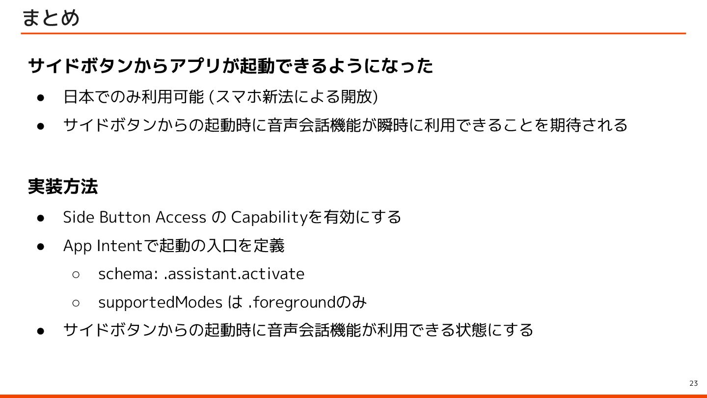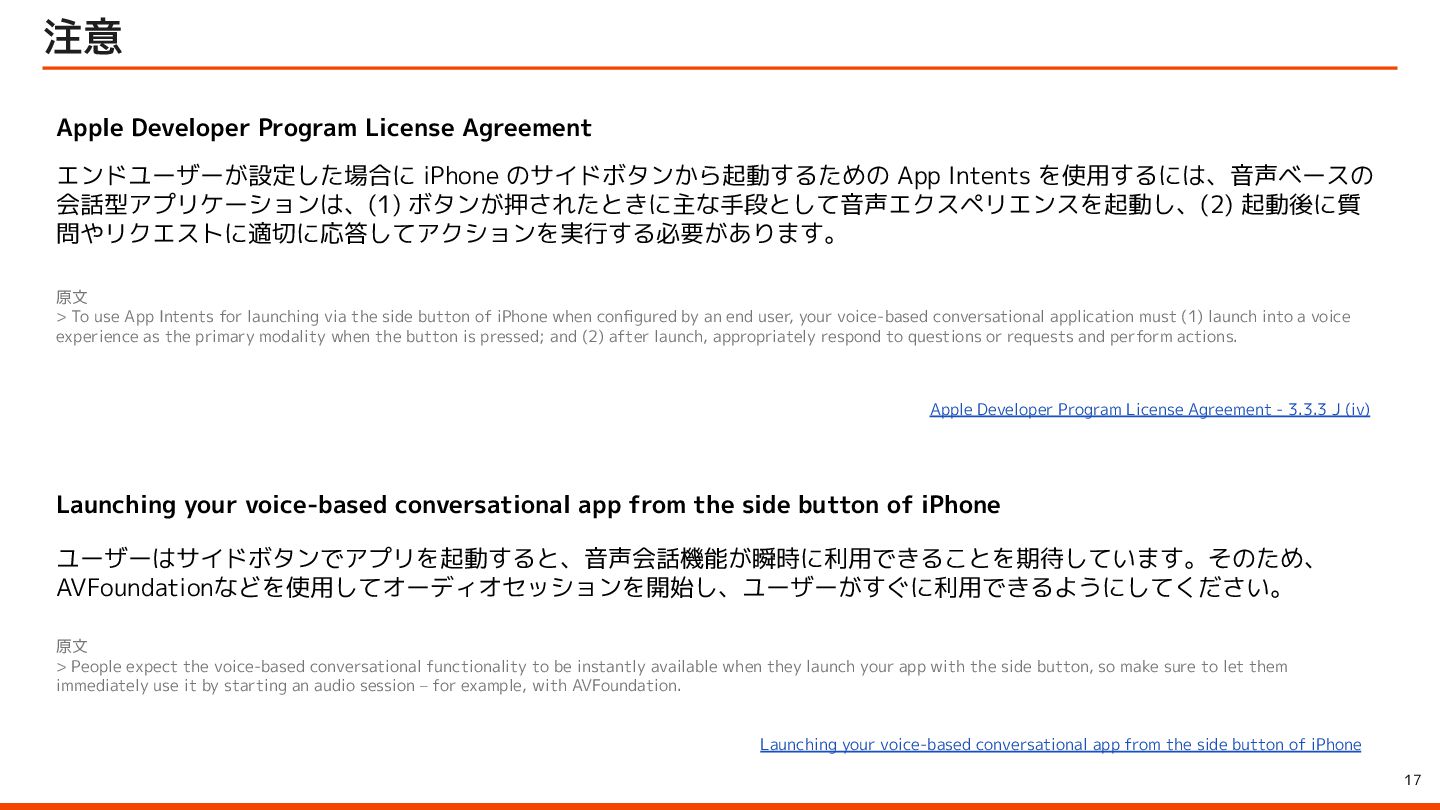 to be instantly available when they launch your app with the side button, so make sure to let them immediately use it by starting an audio session – for example, with AVFoundation. ユーザーはサイドボタンでアプリを起動すると、音声会話機能が瞬時に利用できることを期待しています。そのため、 AVFoundationなどを使用してオーディオセッションを開始し、ユーザーがすぐに利用できるようにしてください。 Launching your voice-based conversational app from the side button of iPhone Apple Developer Program License Agreement 原文 > To use App Intents for launching via the side button of iPhone when configured by an end user, your voice-based conversational application must (1) launch into a voice experience as the primary modality when the button is pressed; and (2) after launch, appropriately respond to questions or requests and perform actions. エンドユーザーが設定した場合に iPhone のサイドボタンから起動するための App Intents を使用するには、音声ベースの 会話型アプリケーションは、(1) ボタンが押されたときに主な手段として音声エクスペリエンスを起動し、(2) 起動後に質 問やリクエストに適切に応答してアクションを実行する必要があります。 Apple Developer Program License Agreement - 3.3.3 J (iv) Launching your voice-based conversational app from the side button of iPhone