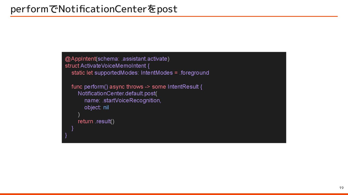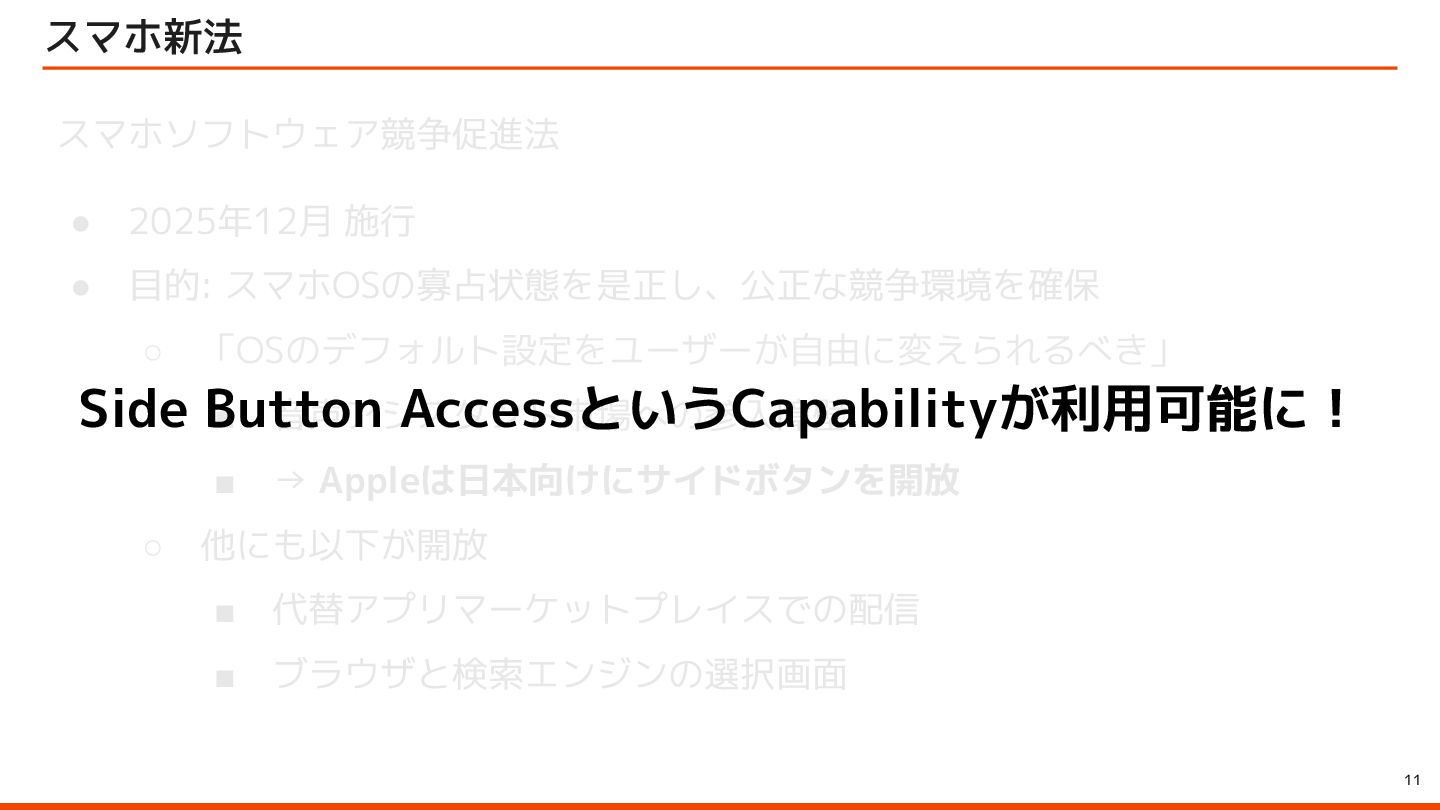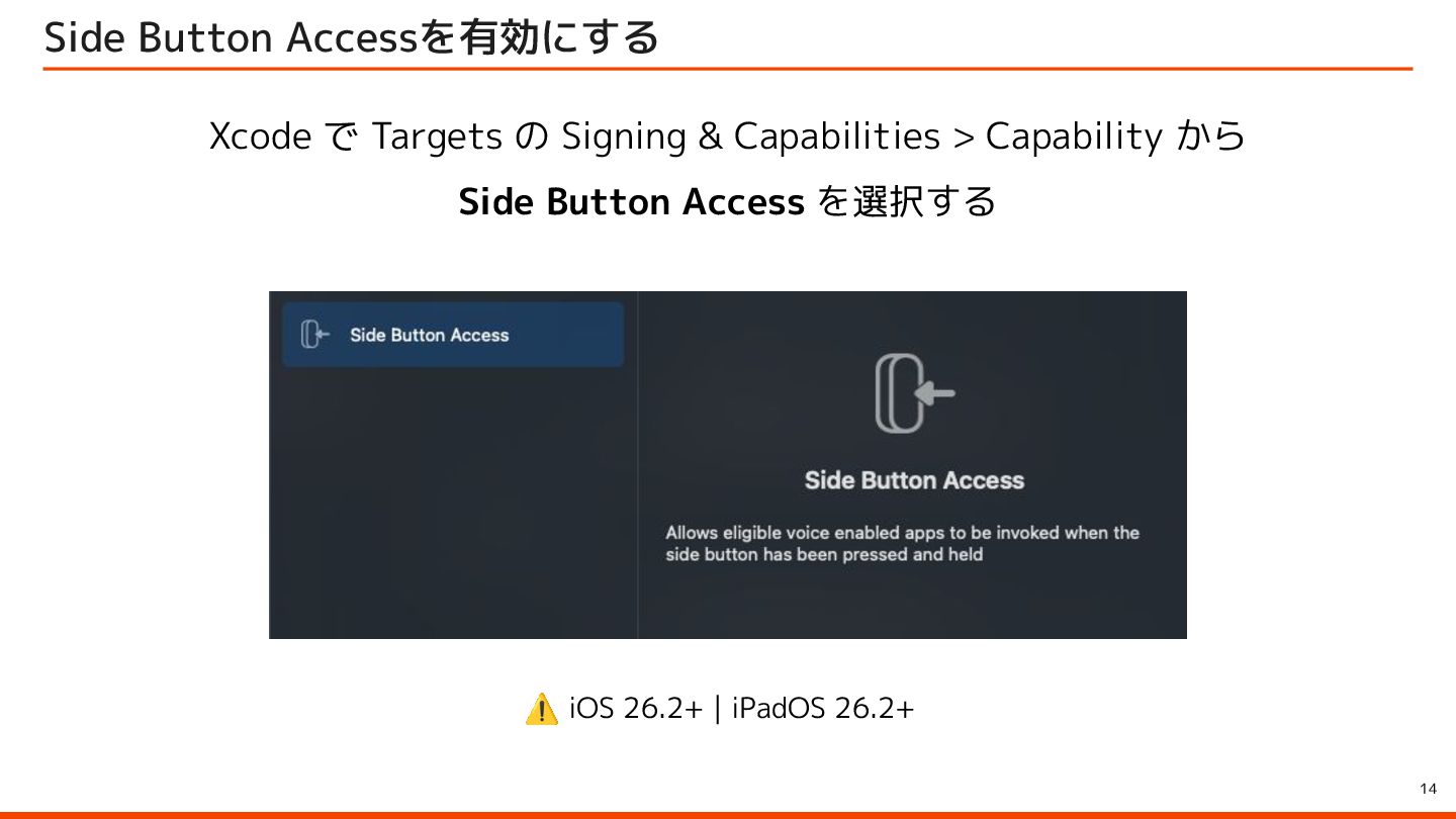 to be instantly available when they launch your app with the side button, so make sure to let them immediately use it by starting an audio session – for example, with AVFoundation. ユーザーはサイドボタンでアプリを起動すると、音声会話機能が瞬時に利用できることを期待しています。そのため、 AVFoundationなどを使用してオーディオセッションを開始し、ユーザーがすぐに利用できるようにしてください。 Launching your voice-based conversational app from the side button of iPhone Apple Developer Program License Agreement 原文 > To use App Intents for launching via the side button of iPhone when configured by an end user, your voice-based conversational application must (1) launch into a voice experience as the primary modality when the button is pressed; and (2) after launch, appropriately respond to questions or requests and perform actions. エンドユーザーが設定した場合に iPhone のサイドボタンから起動するための App Intents を使用するには、音声ベースの 会話型アプリケーションは、(1) ボタンが押されたときに主な手段として音声エクスペリエンスを起動し、(2) 起動後に質 問やリクエストに適切に応答してアクションを実行する必要があります。 Apple Developer Program License Agreement - 3.3.3 J (iv) Launching your voice-based conversational app from the side button of iPhone