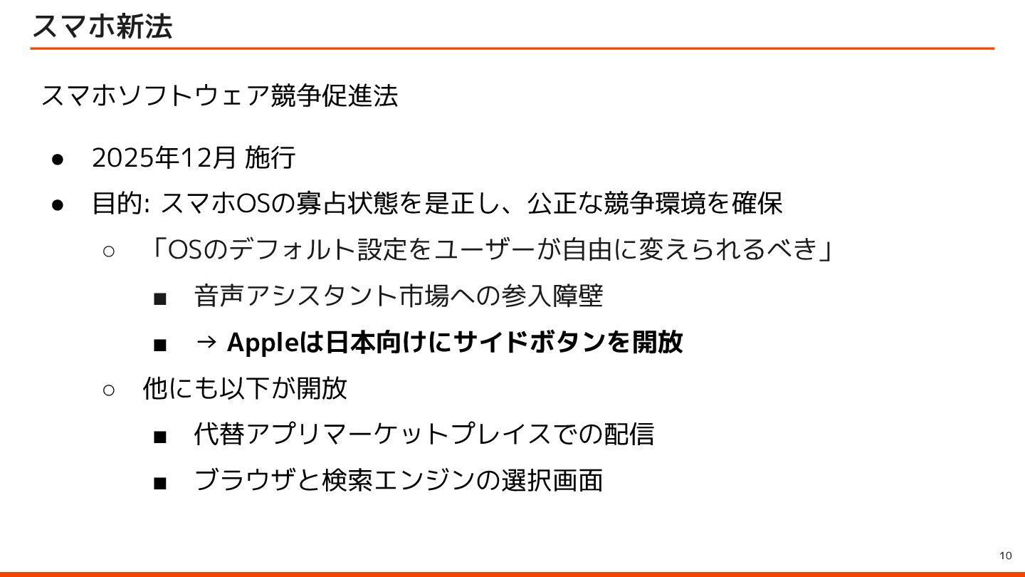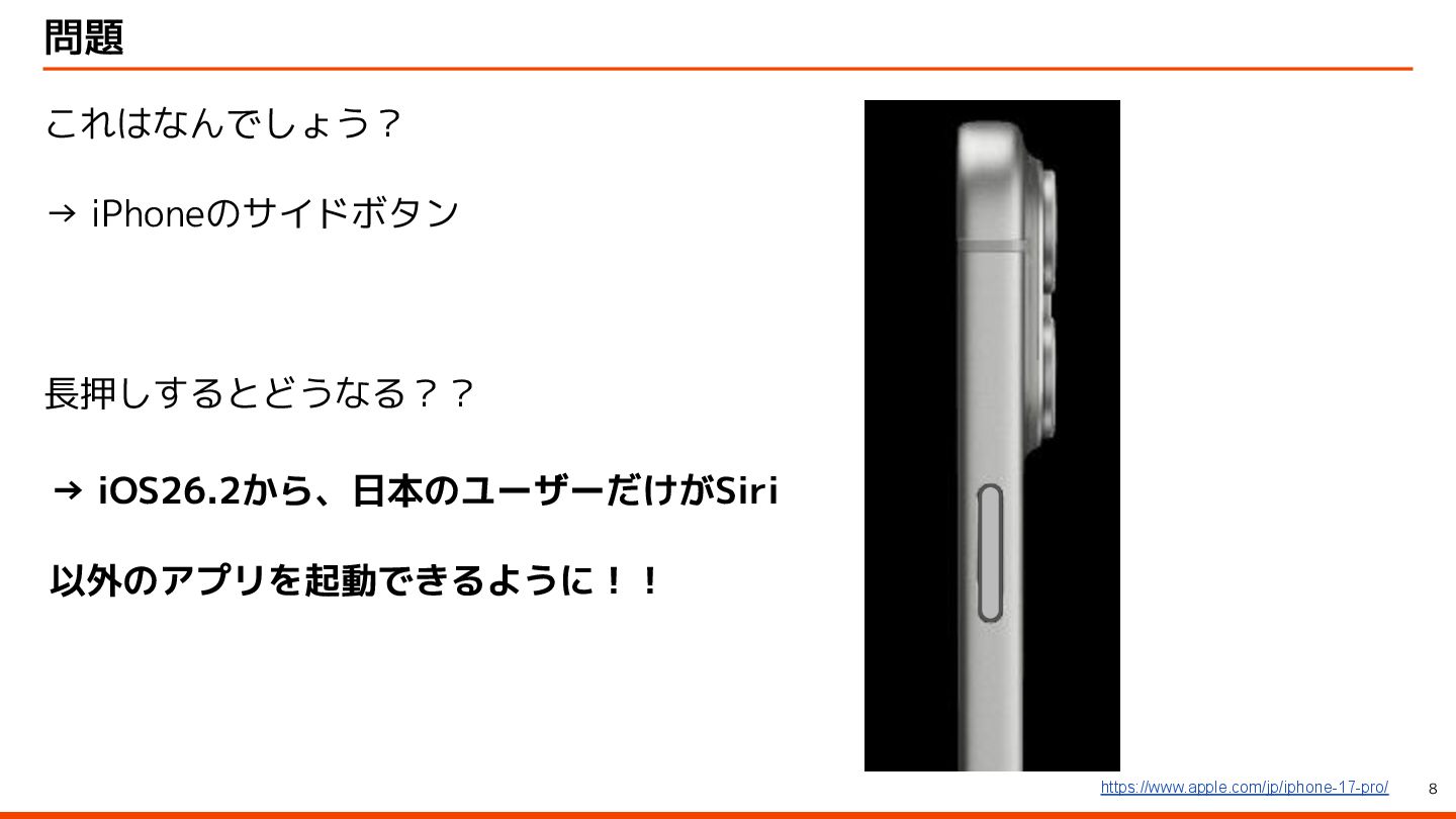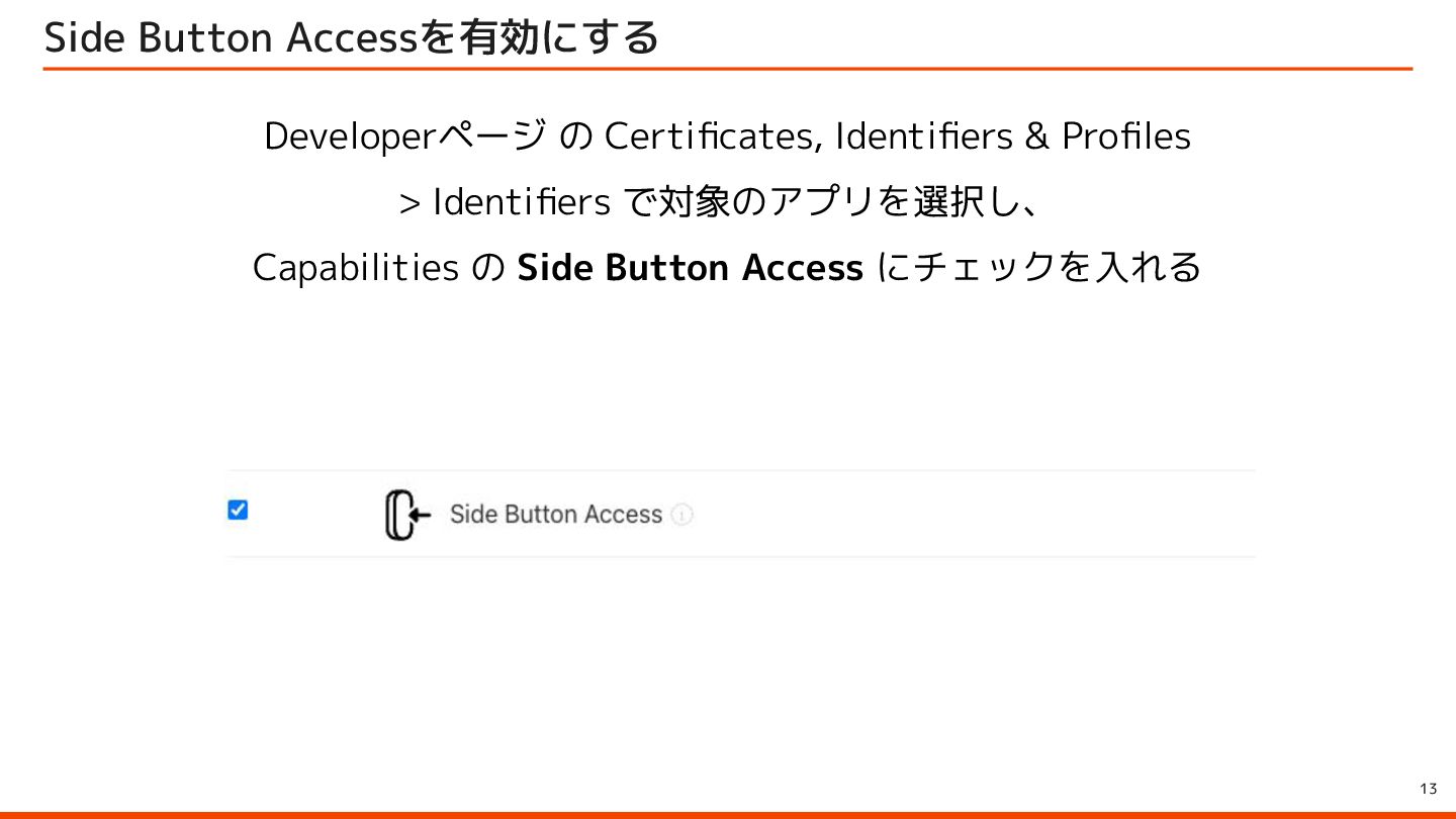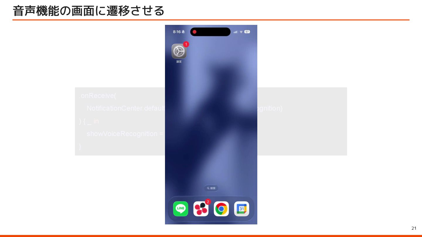 to be instantly available when they launch your app with the side button, so make sure to let them immediately use it by starting an audio session – for example, with AVFoundation. ユーザーはサイドボタンでアプリを起動すると、音声会話機能が瞬時に利用できることを期待しています。そのため、 AVFoundationなどを使用してオーディオセッションを開始し、ユーザーがすぐに利用できるようにしてください。 Launching your voice-based conversational app from the side button of iPhone Apple Developer Program License Agreement 原文 > To use App Intents for launching via the side button of iPhone when configured by an end user, your voice-based conversational application must (1) launch into a voice experience as the primary modality when the button is pressed; and (2) after launch, appropriately respond to questions or requests and perform actions. エンドユーザーが設定した場合に iPhone のサイドボタンから起動するための App Intents を使用するには、音声ベースの 会話型アプリケーションは、(1) ボタンが押されたときに主な手段として音声エクスペリエンスを起動し、(2) 起動後に質 問やリクエストに適切に応答してアクションを実行する必要があります。 Apple Developer Program License Agreement - 3.3.3 J (iv) Launching your voice-based conversational app from the side button of iPhone
