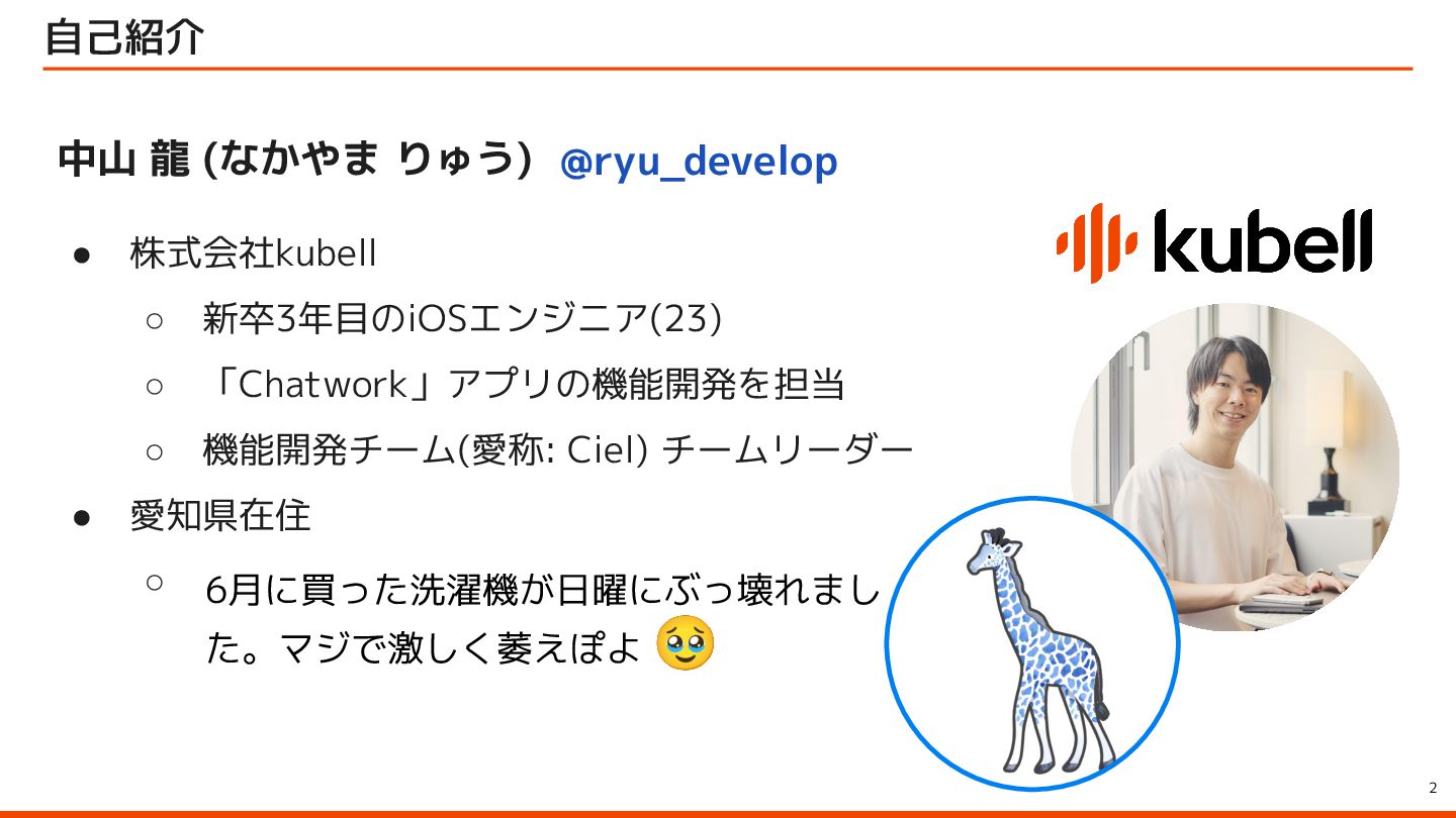 「Chatwork」アプリの機能開発を担当 ◦ 機能開発チーム(愛称: Ciel) チームリーダー • 愛知県在住 ◦ 自己紹介 @ryu_develop 6月に買った洗濯機が日曜にぶっ壊れまし た。マジで激しく萎えぽよ 🥹
