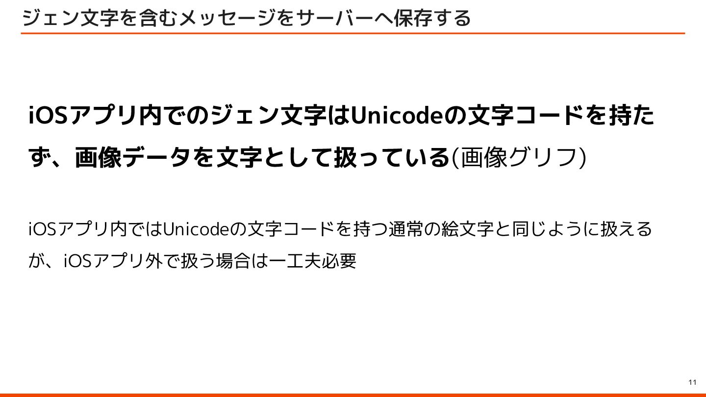 11 ジェン文字を含むメッセージをサーバーへ保存する iOSアプリ内でのジェン文字はUnicodeの文字コードを持た ず、画像データを文字として扱っている(画像グリフ) iOSアプリ内ではUnicodeの文字コードを持つ通常の絵文字と同じように扱える が、iOSアプリ外で扱う場合は一工夫必要