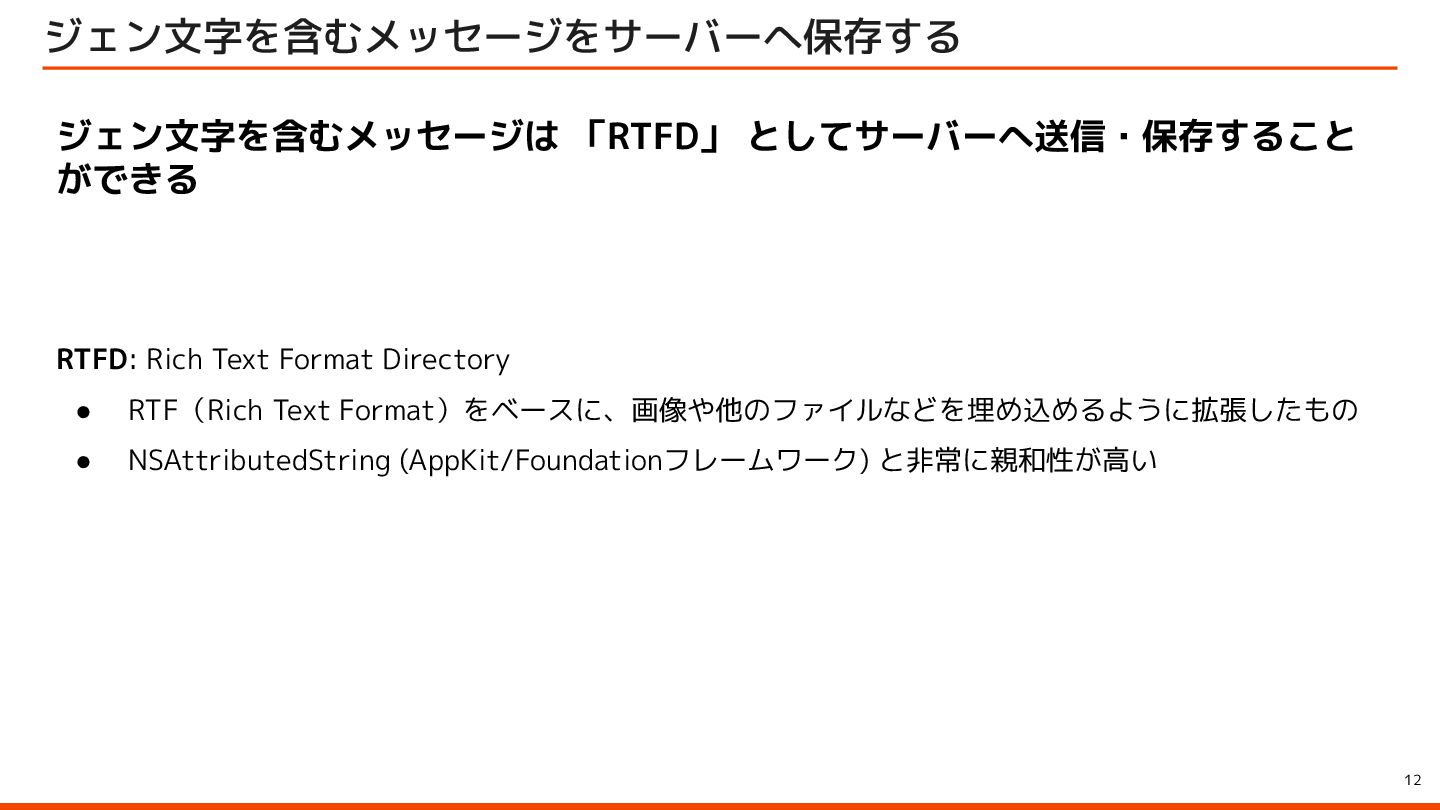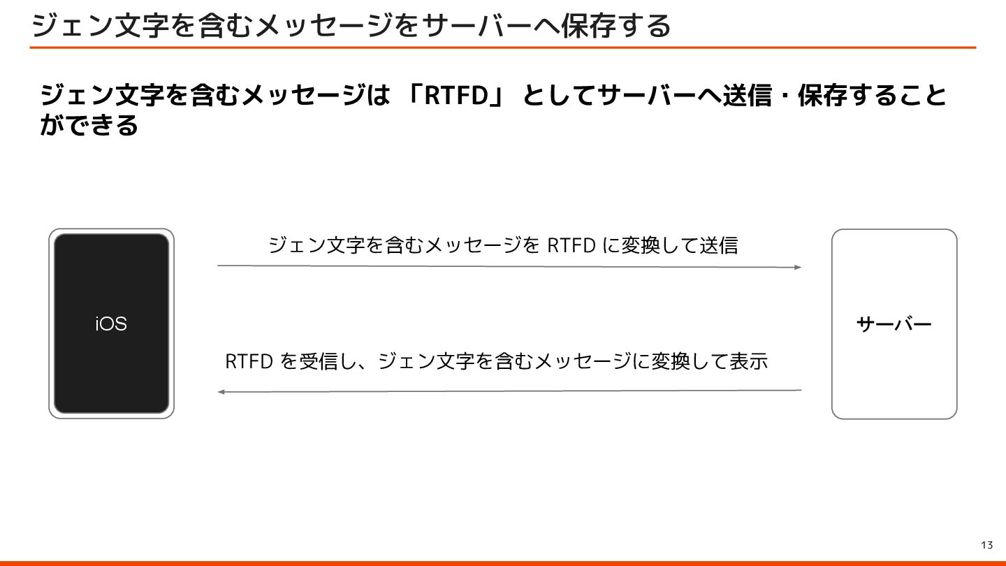 12 ジェン文字を含むメッセージをサーバーへ保存する ジェン文字を含むメッセージは 「RTFD」 としてサーバーへ送信・保存すること ができる RTFD: Rich Text Format