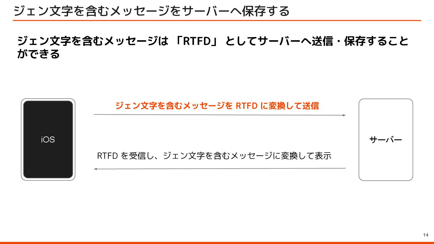 13 ジェン文字を含むメッセージをサーバーへ保存する ジェン文字を含むメッセージは 「RTFD」 としてサーバーへ送信・保存すること ができる iOS ジェン文字を含むメッセージを RTFD に変換して送信