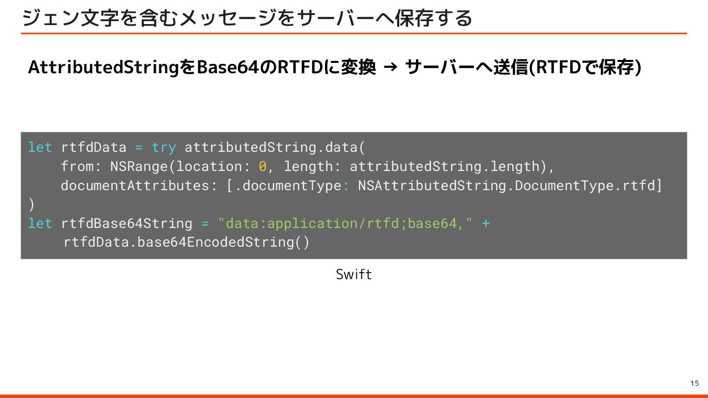 15 ジェン文字を含むメッセージをサーバーへ保存する AttributedStringをBase64のRTFDに変換 → サーバーへ送信(RTFDで保存) let rtfdData = try attributedString.data(