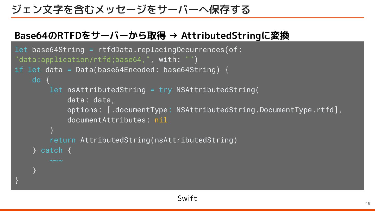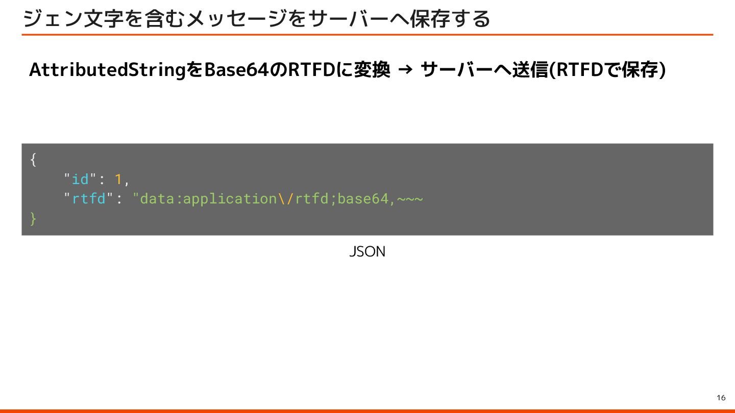 16 ジェン文字を含むメッセージをサーバーへ保存する AttributedStringをBase64のRTFDに変換 → サーバーへ送信(RTFDで保存) { "id": 1, "rtfd": "data:application\/rtfd;base64,~~~