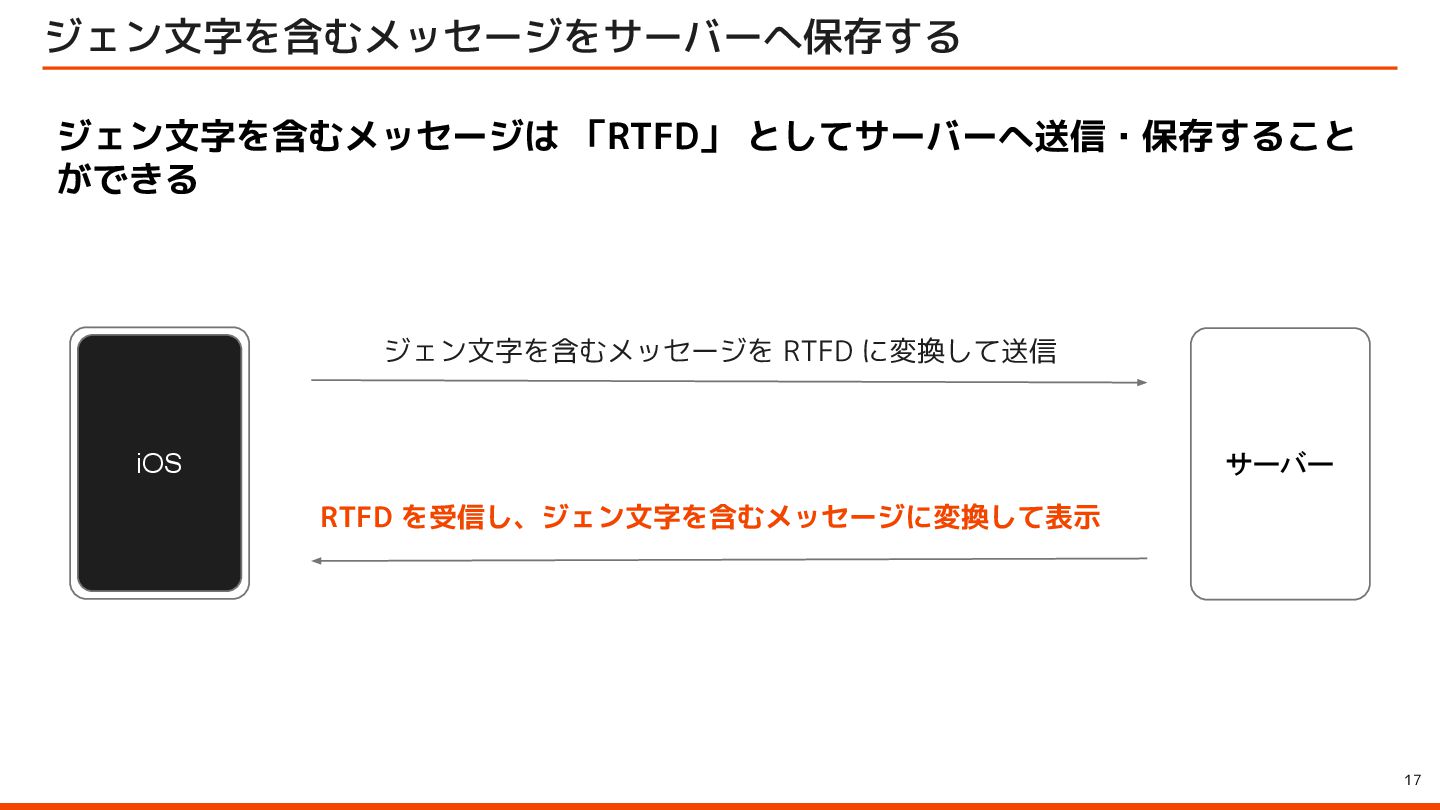 17 ジェン文字を含むメッセージをサーバーへ保存する ジェン文字を含むメッセージは 「RTFD」 としてサーバーへ送信・保存すること ができる iOS ジェン文字を含むメッセージを RTFD に変換して送信