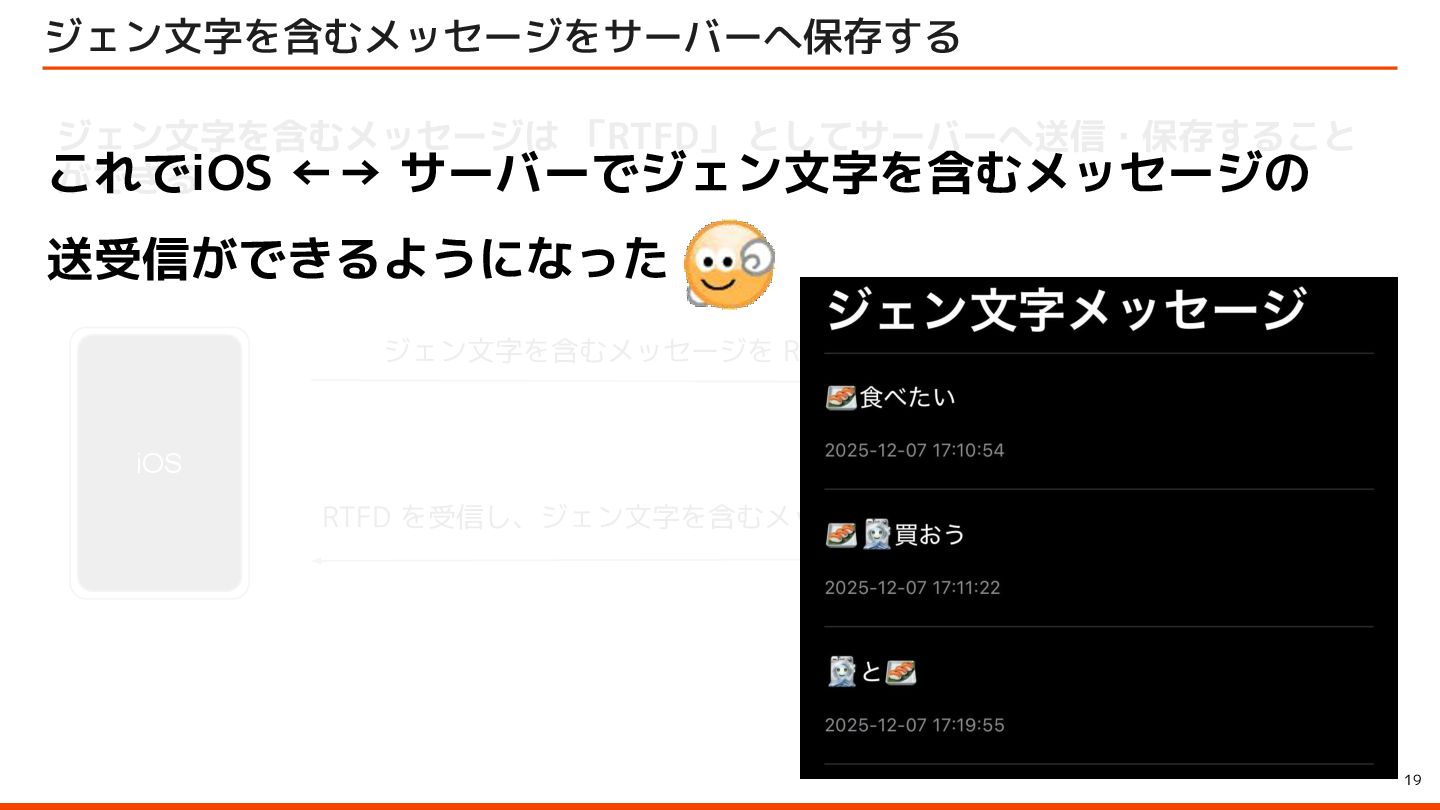 サーバー RTFD を受信し、ジェン文字を含むメッセージに変換して表示 これでiOS ←→ サーバーでジェン文字を含むメッセージの 送受信ができるようになった