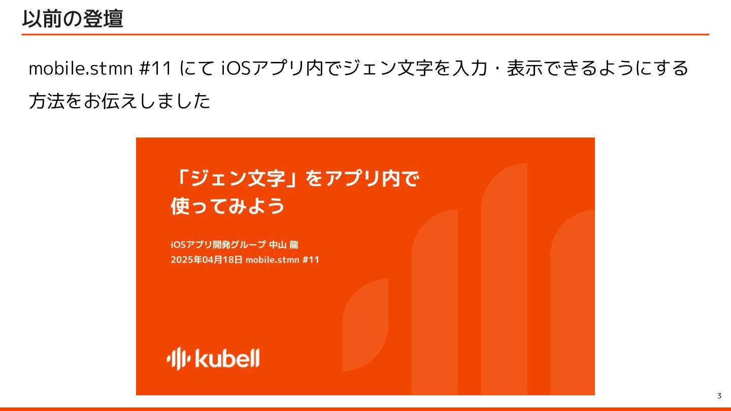 3 以前の登壇 mobile.stmn #11 にて iOSアプリ内でジェン文字を入力・表示できるようにする 方法をお伝えしました