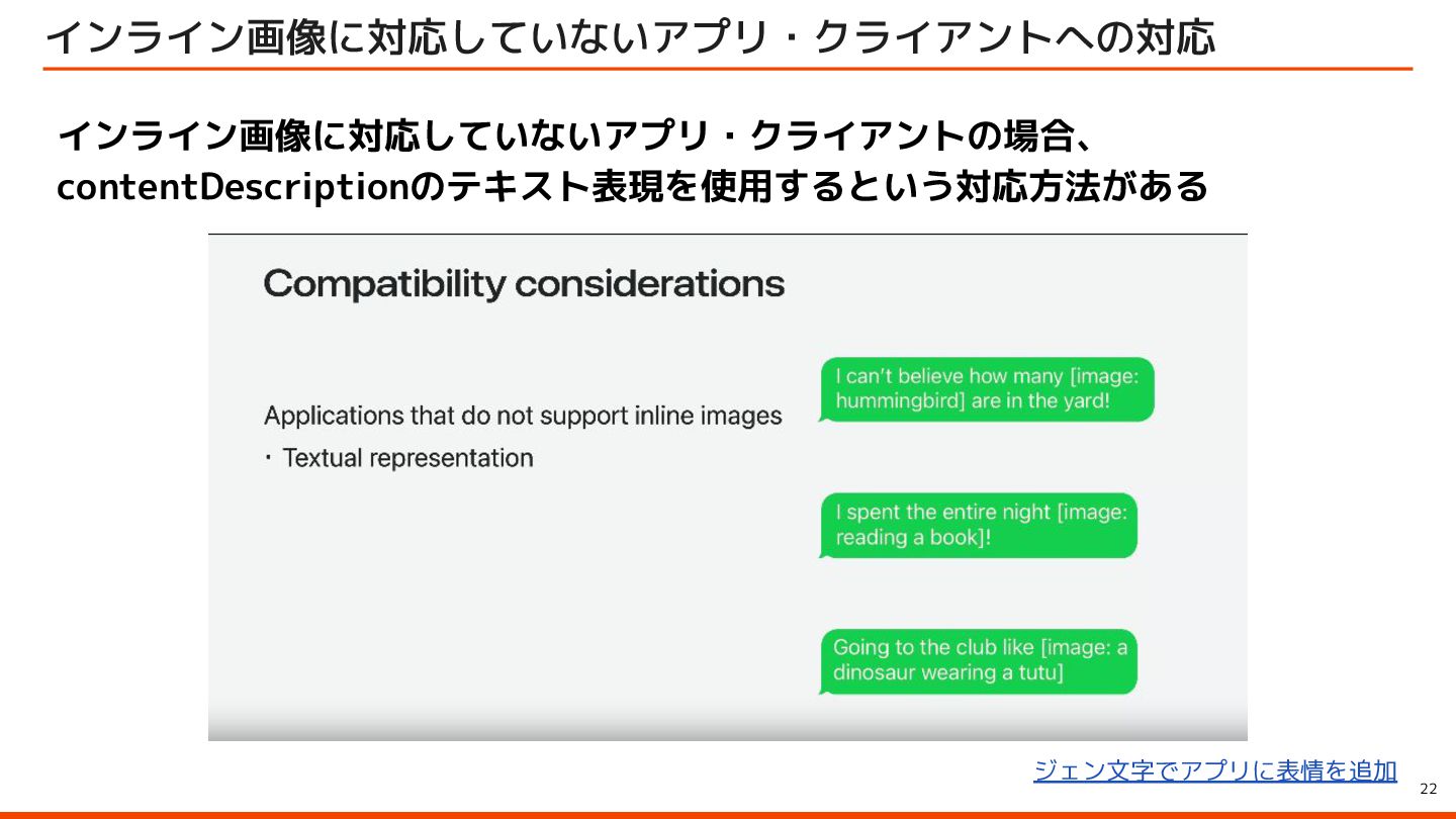 22 インライン画像に対応していないアプリ・クライアントへの対応 インライン画像に対応していないアプリ・クライアントの場合、 contentDescriptionのテキスト表現を使用するという対応方法がある ジェン文字でアプリに表情を追加