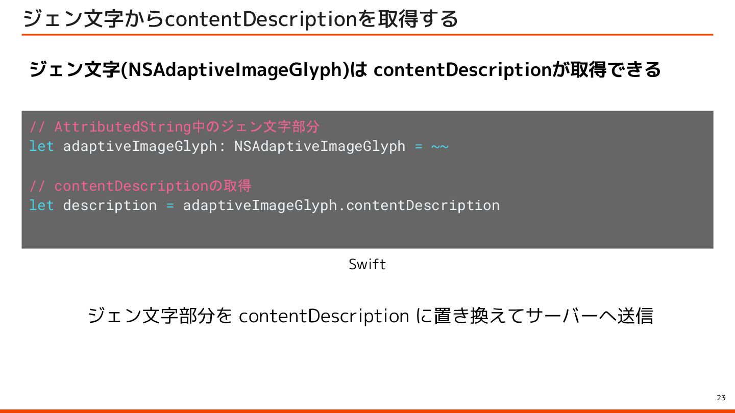 23 ジェン文字からcontentDescriptionを取得する ジェン文字(NSAdaptiveImageGlyph)は contentDescriptionが取得できる // AttributedString中のジェン文字部分 let adaptiveImageGlyph: NSAdaptiveImageGlyph =