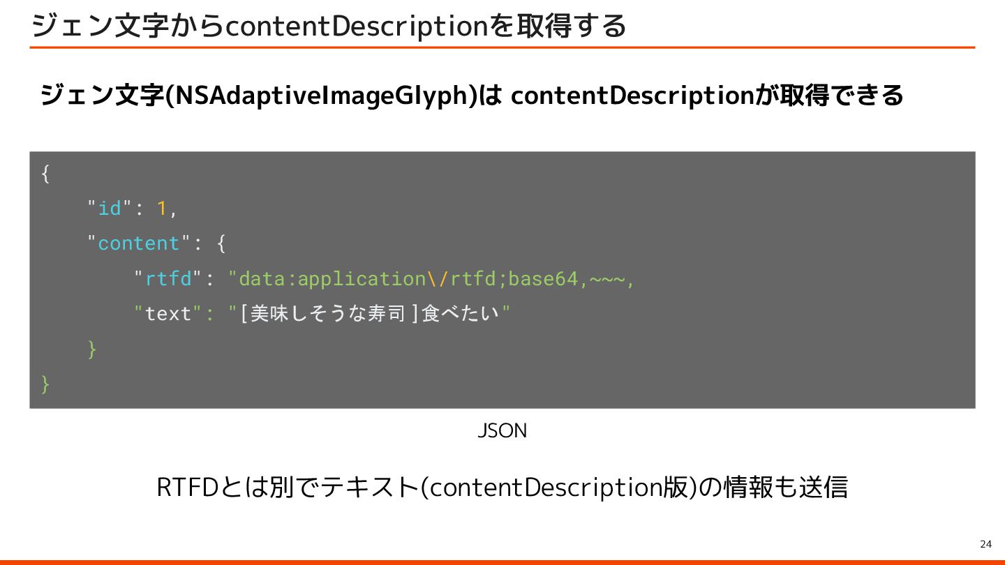 24 ジェン文字からcontentDescriptionを取得する ジェン文字(NSAdaptiveImageGlyph)は contentDescriptionが取得できる { "id": 1, "content": { "rtfd":
