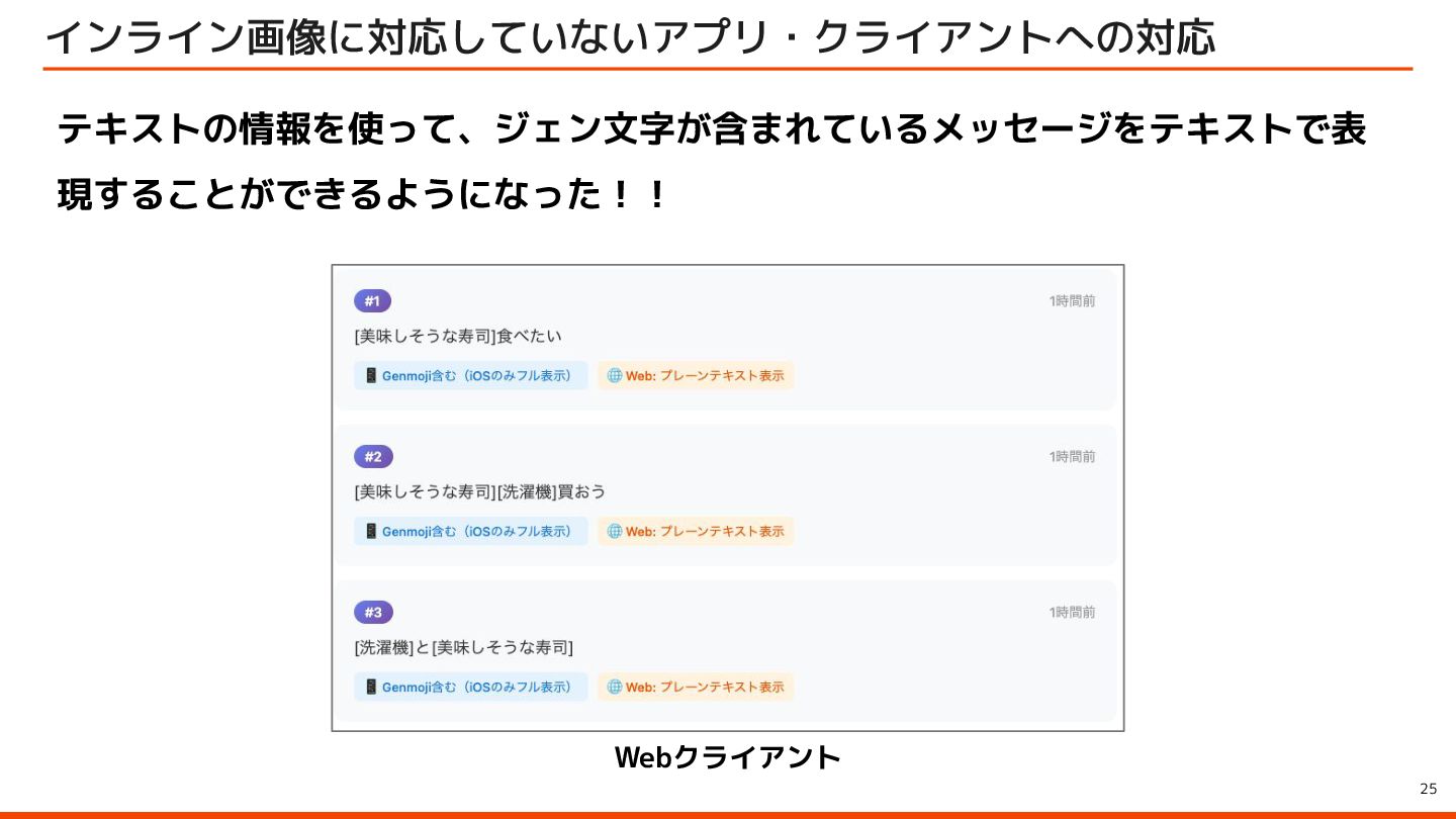 25 インライン画像に対応していないアプリ・クライアントへの対応 テキストの情報を使って、ジェン文字が含まれているメッセージをテキストで表 現することができるようになった!! Webクライアント
