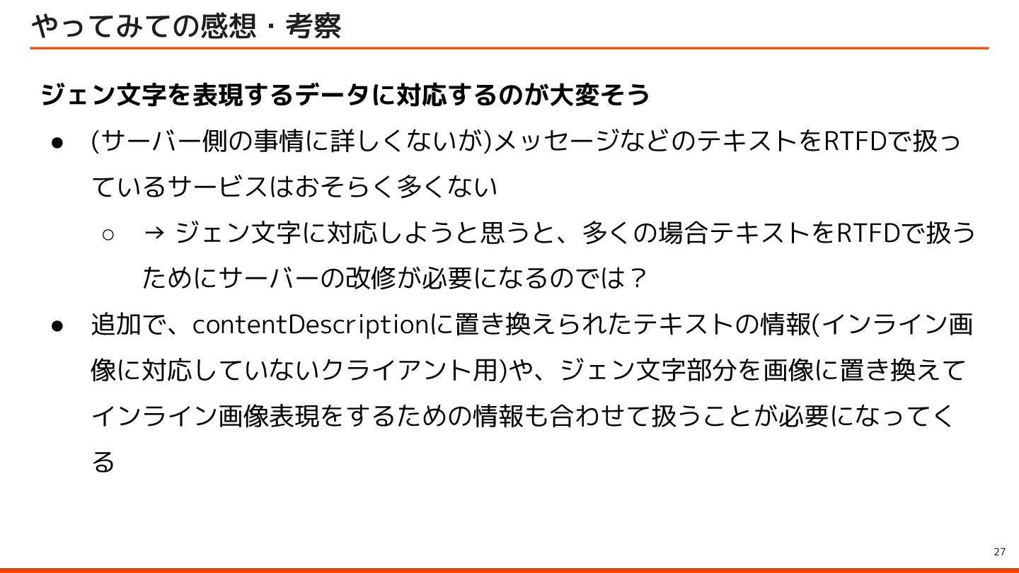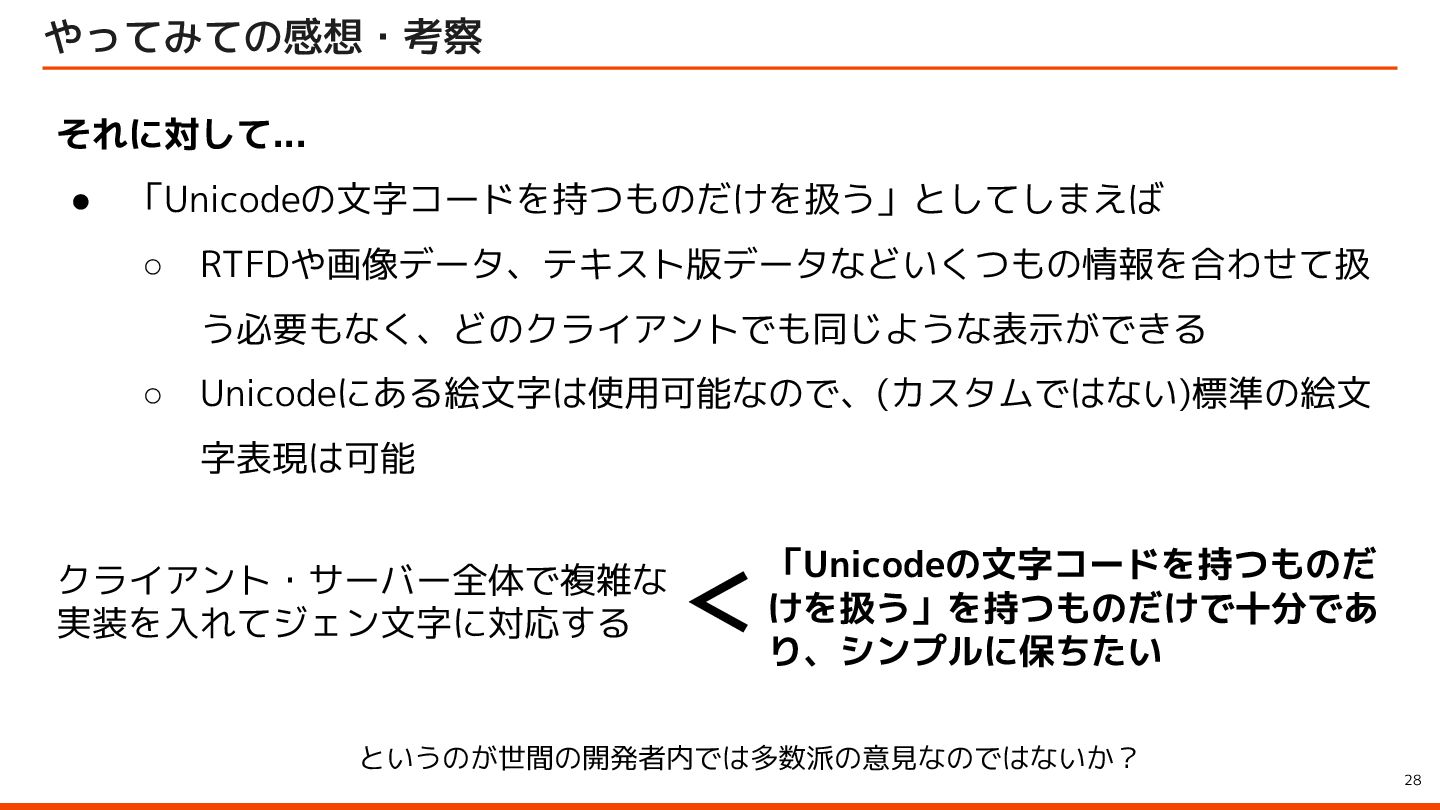 27 やってみての感想・考察 ジェン文字を表現するデータに対応するのが大変そう • (サーバー側の事情に詳しくないが)メッセージなどのテキストをRTFDで扱っ ているサービスはおそらく多くない ◦ → ジェン文字に対応しようと思うと、多くの場合テキストをRTFDで扱う ためにサーバーの改修が必要になるのでは?